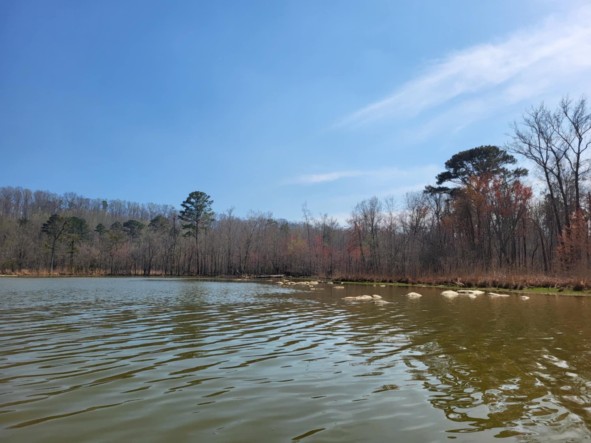 Ottime condizioni primaverili. Qualche albero caduto sulle rive del lago che pero’ non ha dato problemi. Il Lee Branch e’ un’oasi per la fauna locale. Ho visto numerosi aironi, pesci di grandi dimensioni (probabilmente pesce gatto), colibri’, rondini e persino due cervi dalla coda bianca e un uovo di airone. Il Lee Branch e’ piuttosto stretto, motivo per cui e’ navigabile solo per un pezzo. Poi, i rami degli alberi rendono difficile la progressione, per cui mi sono fermato e sono andato a esplorare altre parti del lago dopo il ponte.