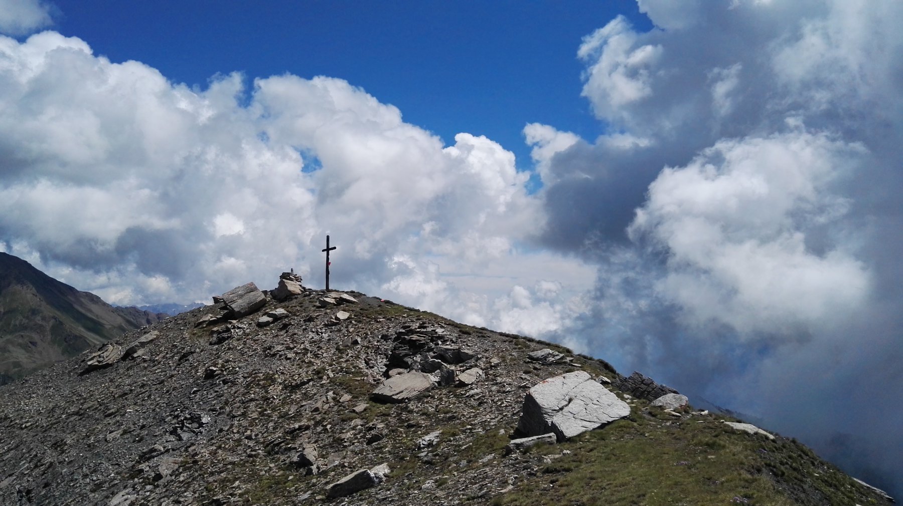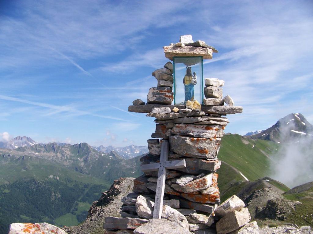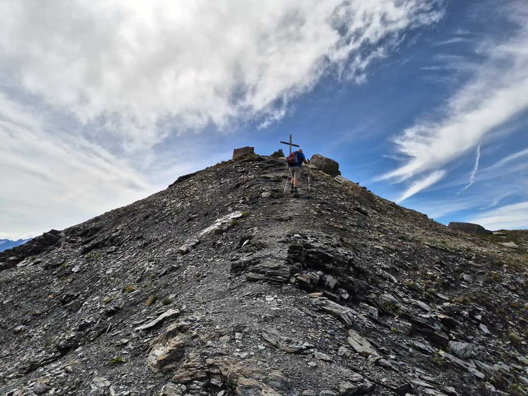 Poco sopra (palina) si sale verso la punta Oilletta (quota 2616) poi per cresta erboso-detritica (traccia) si compie un grande semicerchio con alcuni saliscendi e si giunge alla croce di vetta di cima Leysser (m 2771).