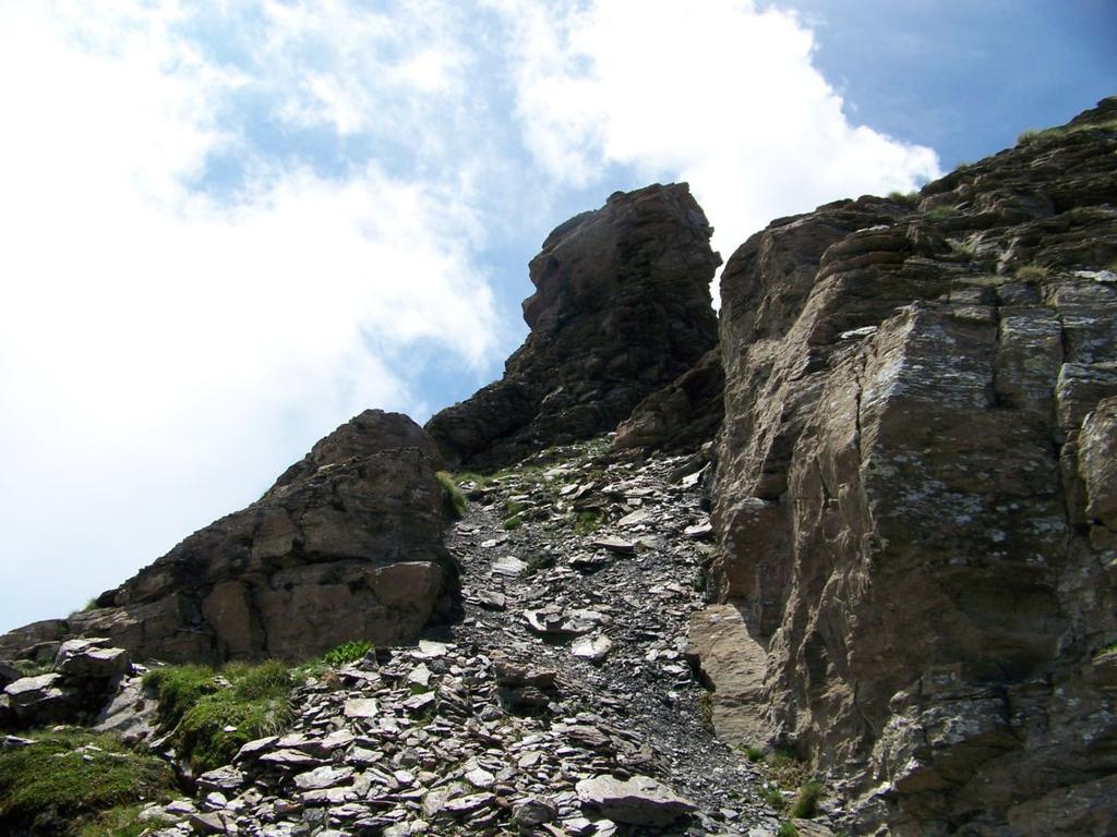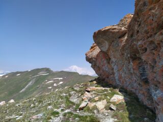 Da questa vetta si scendono alcuni metri sulla cresta verso Nord tra torri rocciose (tratto EE) e giunti al colle Palettaz si deve scendere a sinistra (Ovest) per un ripido pendio di erba e detriti, privo di sentiero (EE, qualche ometto e alcuni bolli gialli).
