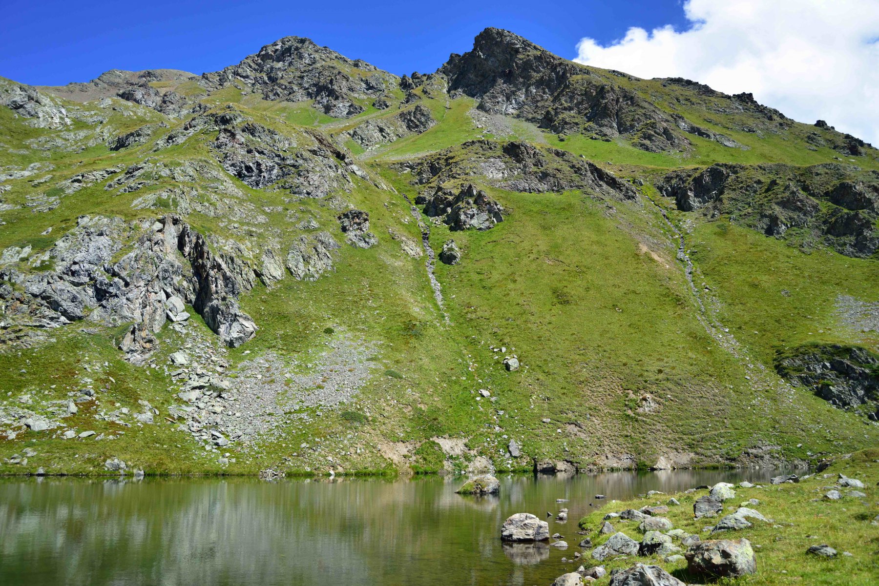 In fondo al tratto ripido si ritrova il sentiero ben evidente e segnalato che piega a destra e raggiunge il lago Leysser (m m 2409).