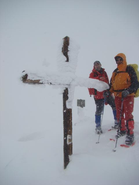 Crediamo … di aver percorso l’itinerario descritto, perlomeno un ometto (completamente coperto da neve ventata) a quota 2743m l’abbiamo intravisto e poco dopo una croce a quota 2775m l’abbiamo trovata; il che ci fa pensare di aver raggiunto la Leysser. Questa potrebbe essere in sintesi la cronaca della salita di ieri.
