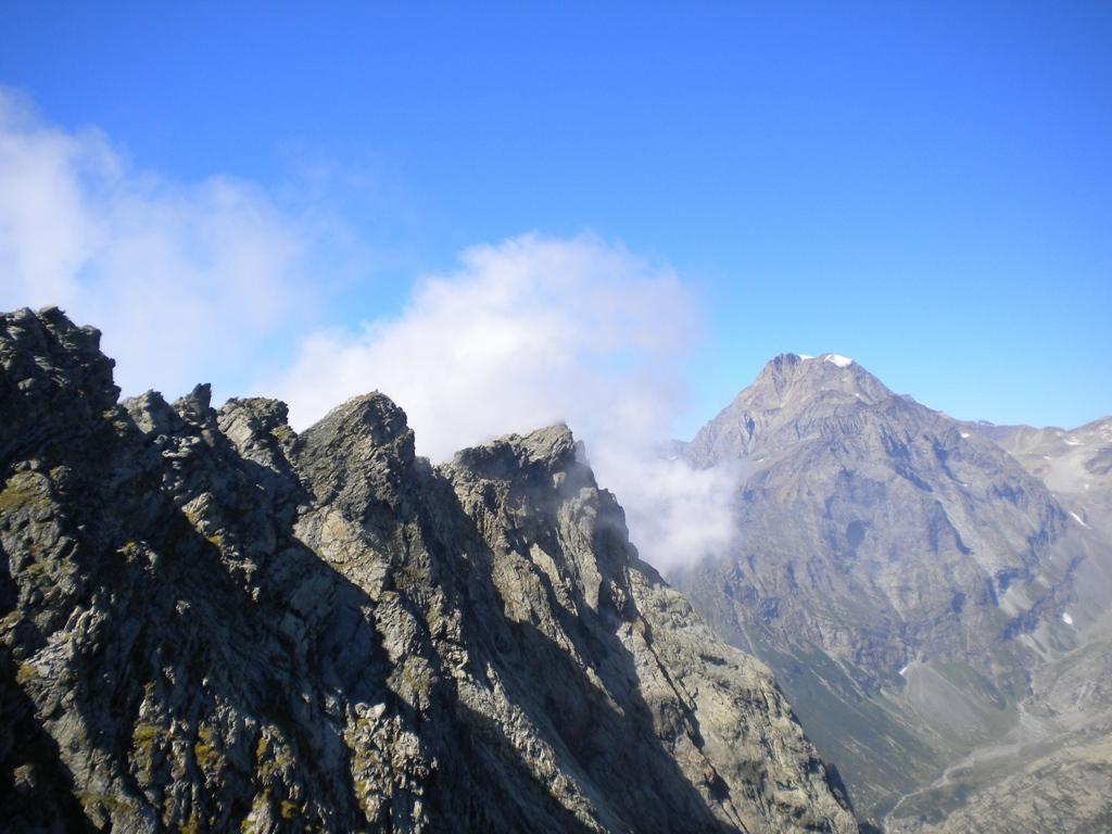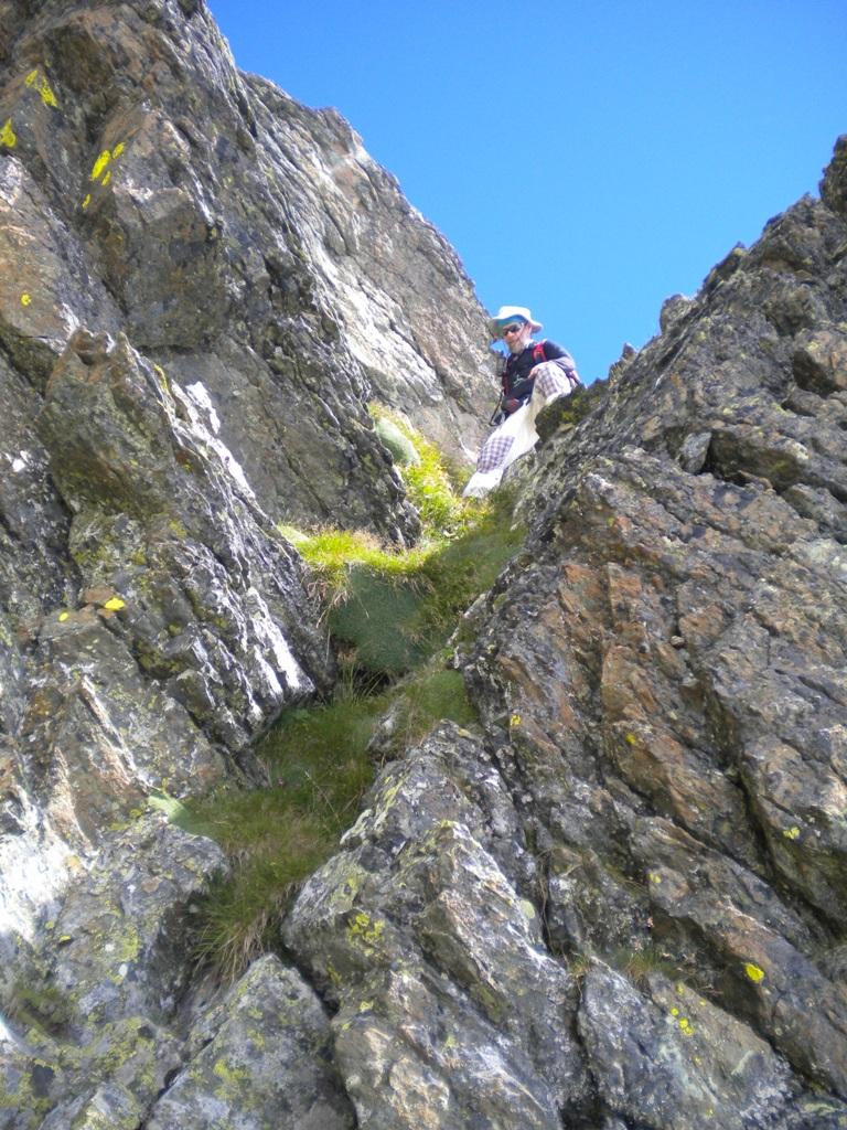 Per cresta o sempre aggirando gli ostacoli sul versante Sud (lieve traccia) si scende ad una marcata depressione 2770 metri. Proseguire per il filo di cresta a leggeri saliscendi e spostarsi in seguito sul versante Sud ad attraversare alcuni canali separati da costole rocciose. La cresta si fa sempre più dirupata in ambiente abbastanza severo ed evitando sempre gli ostacoli sul lato Sud, compreso un massiccio torrione in prossimità della vetta, si giunge sul punto culminante per facili rocce.