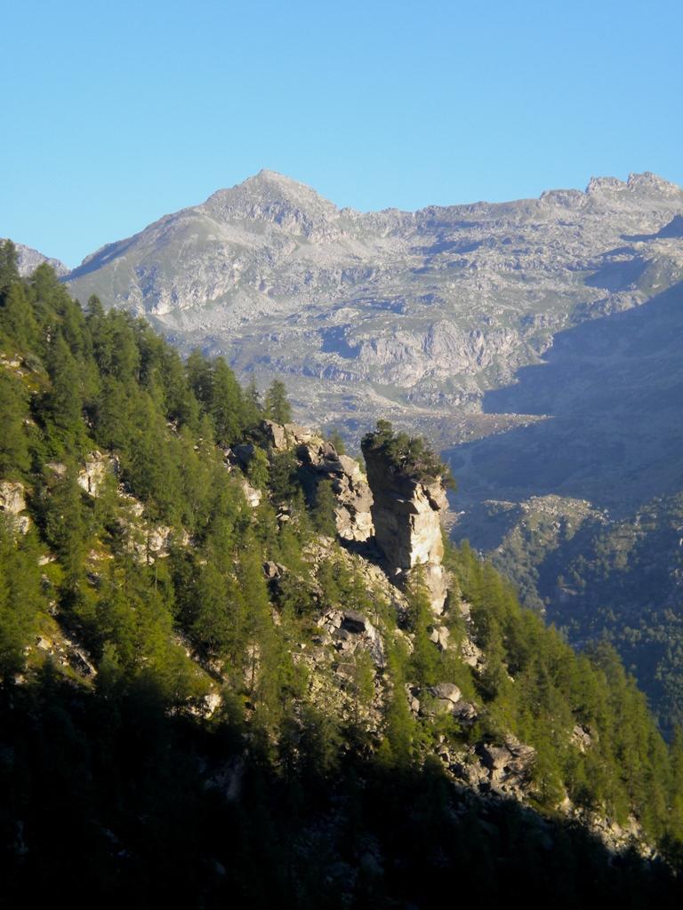 Salire nel lariceto seguendo il sentiero che con alcune rampe e traversi porta ad un ripiano (del Trione) in prossimità del masso Pera Cagna (o Roc del Diao) dal quale guardando verso ovest è ben visibile il Bec Ceresin. Si prosegue verso la bastionata posta in fondo al pianoro, lungo la quale scende una bella cascata; si passa all’Alpe Trione; tenersi a sinistra e risalire un pendio tra i cespugli al termine del quale si va a destra al di sopra della bastionata; passare nei pressi del Gias Nuovo, raggiungere poi il Gias di Mezzo m 1.961 e quindi il Gias dei Laghi del Trione e laghi omonimi.