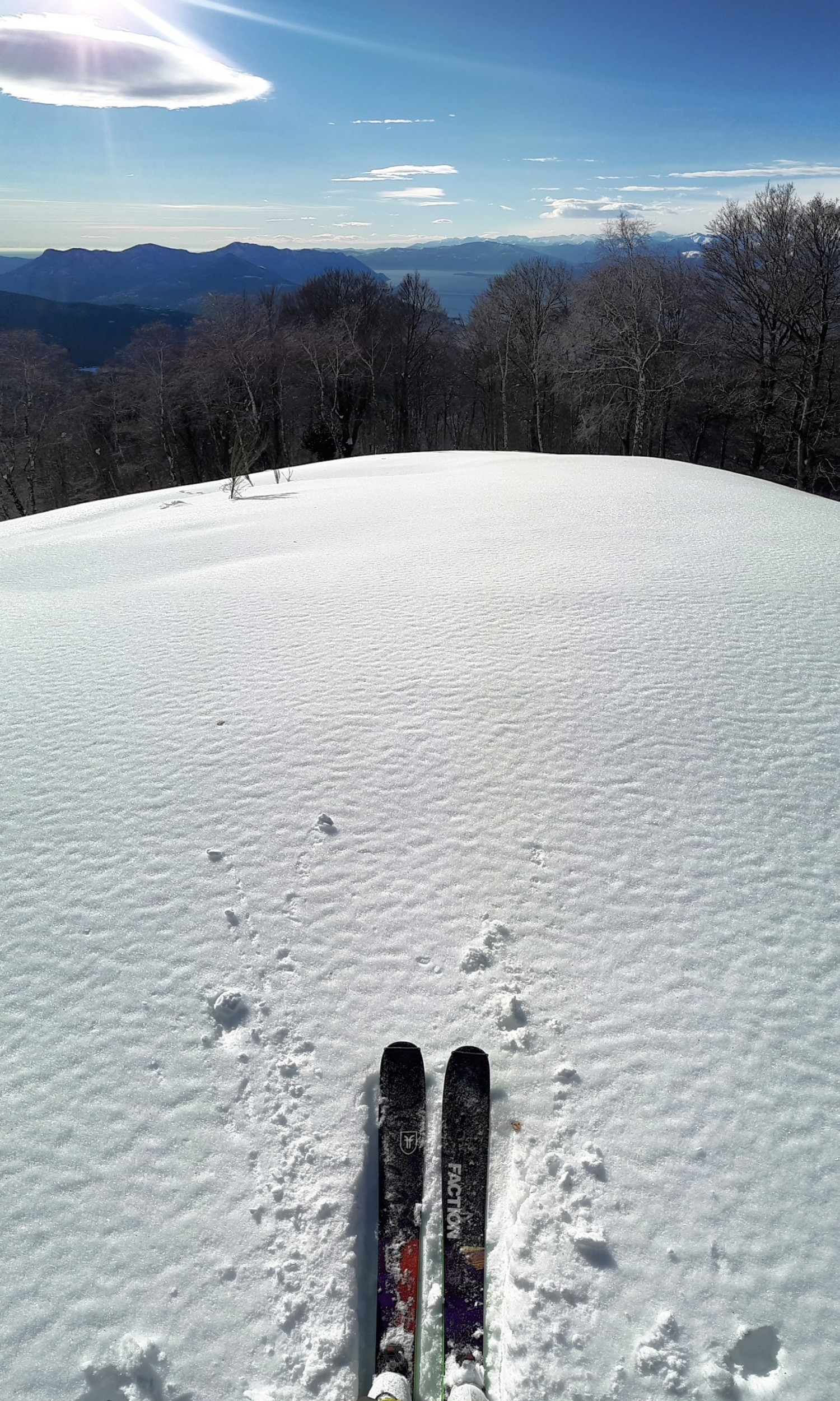 Itinerario tracciatissimo sia in salita che in discesa. Raggiunta la vetta, torno poco indietro per provare a scendere i bei pendii verso sud tra le betulle.. Qui neve intonsa ma umida e pesante.