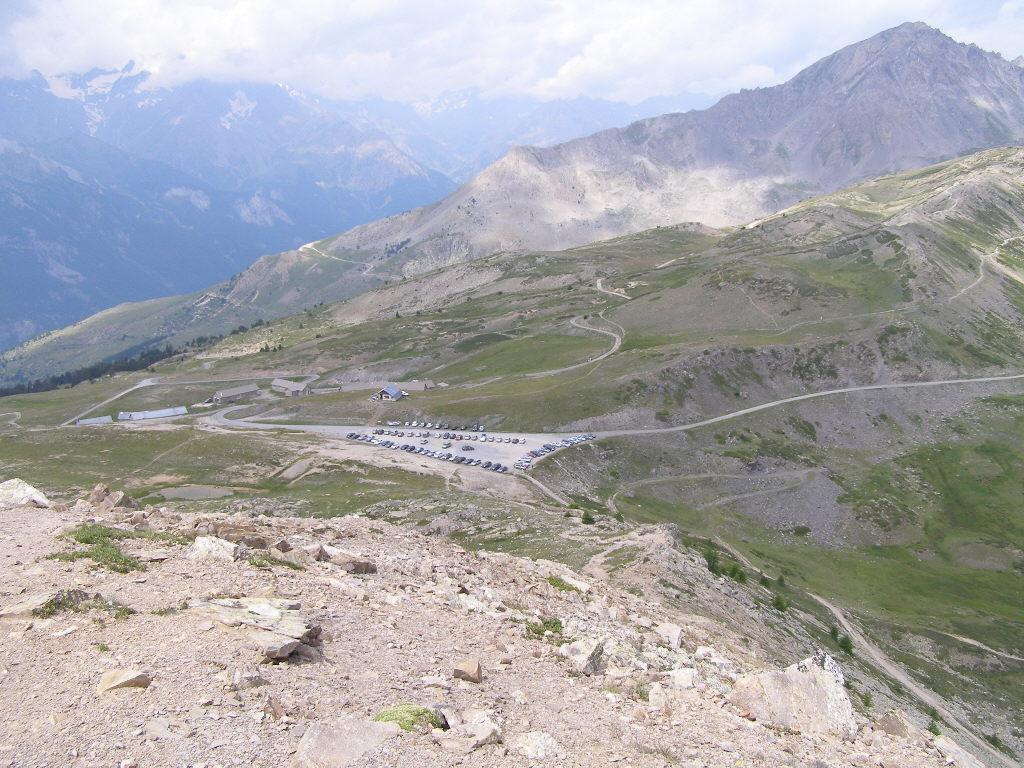 si scende per circa 100 metri su asfalto sotto le casermette del Col du Granon. Qui sulla sinistra si diparte una sterrata (indicazioni VTT gialle con sfondo nero). Questa, con saliscendi arriva alla Cote de la Fleur (palina di segnalazione).