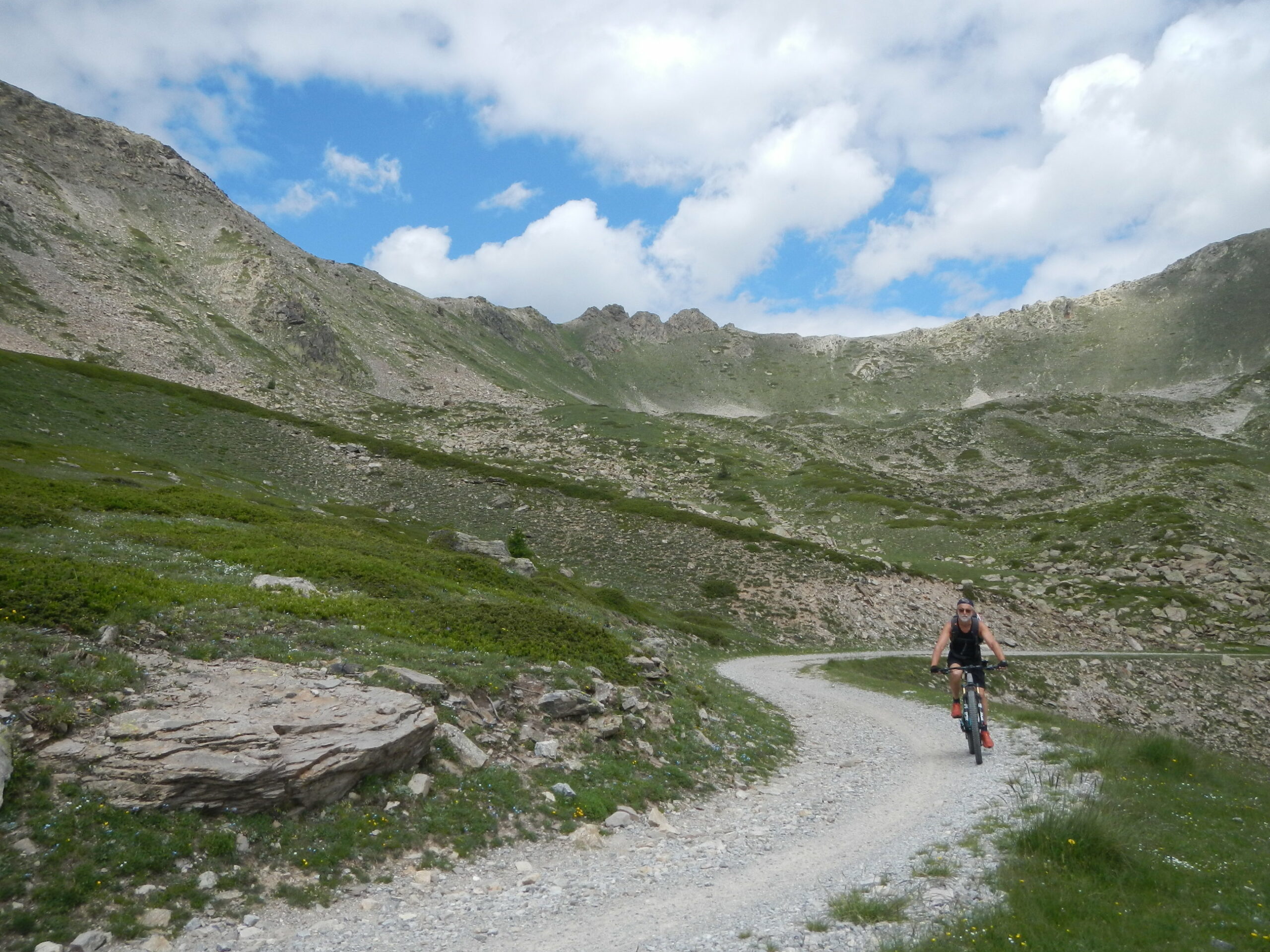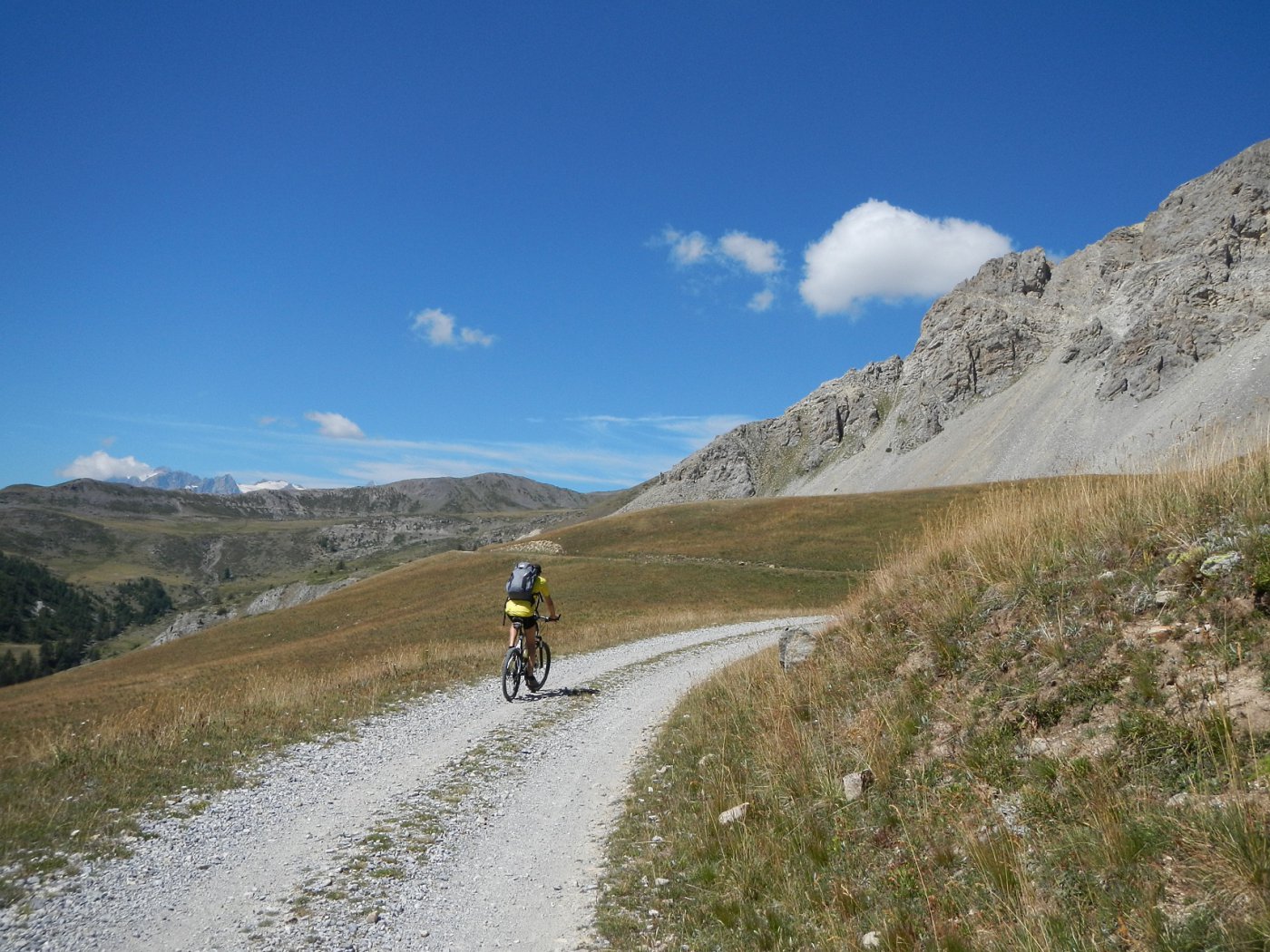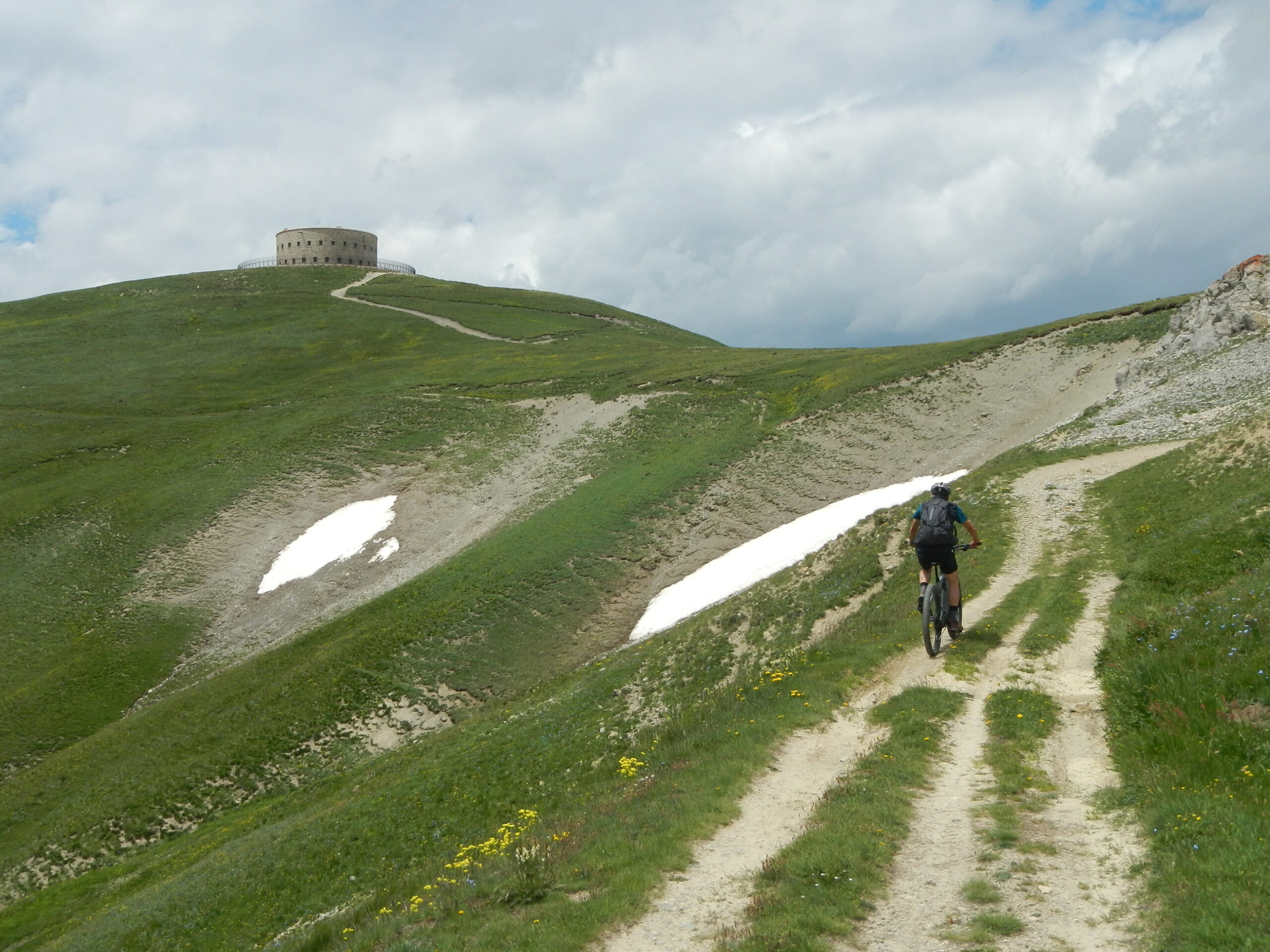 Volendo si può evitare la strada asfaltata: alla fine del paese, dopo circa 200 metri, si nota sulla sinistra, una strada sterrata che conduce prima a la Rosier e successivamente, con un po’ di saliscendi, a Val des Pres. Si attraversa il paese e non si attraversa il ponte, ma si prosegue sulla strada sulla destra idrografica della valle. Dopo circa 100 m c’è un bivio con indicazioni Granon. Ignoratelo: quello è per chi va a piedi. Proseguire dritto e poi la strada svolta a sinistra e inizia decisamente a salire. Dopo un lungo tratto boscoso su fondo ottimale si giunge alle baite Granon 1915 m, da qui la strada compie un semicerchio e si porta dall’altra parte del vallone. Dopo una ripida rampa c’è un bivio (con nessuna indicazione): quello di sinistra è più diretto, mentre quello di destra è più ripido ma molto più panoramico. Conviene comunque seguire la sterrata principale quindi a sinistra, che via via salendo presenta un fondo peggiore, anche se sempre pedalabile ma con tratti piuttosto scavati dalle acque. A circa 2300 m ci si immette nella bella sterrata in falsopiano che collega il col du Granon al Fort de Lenlon (visibile in alto in cima al cucuzzolo erboso) e al Fort de l’Olive.