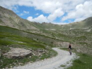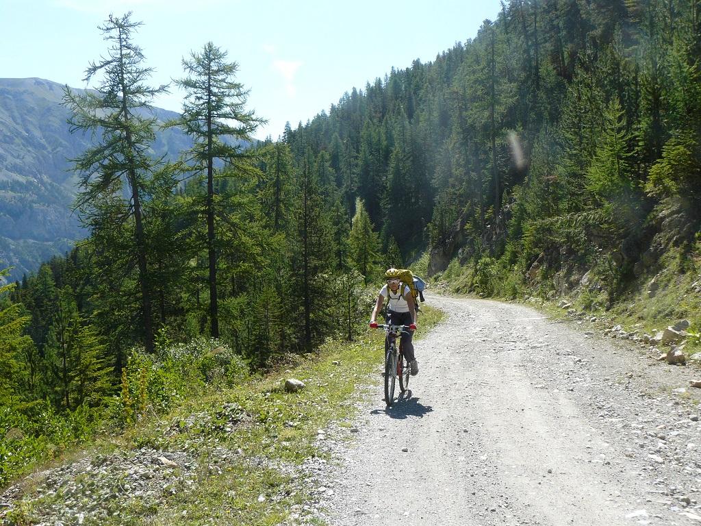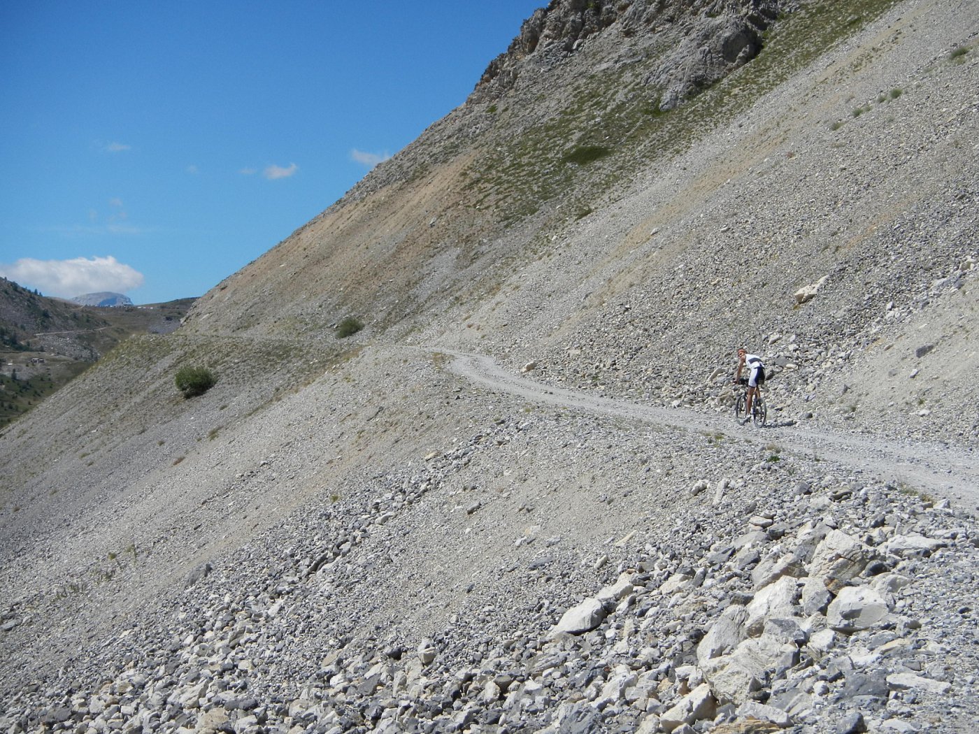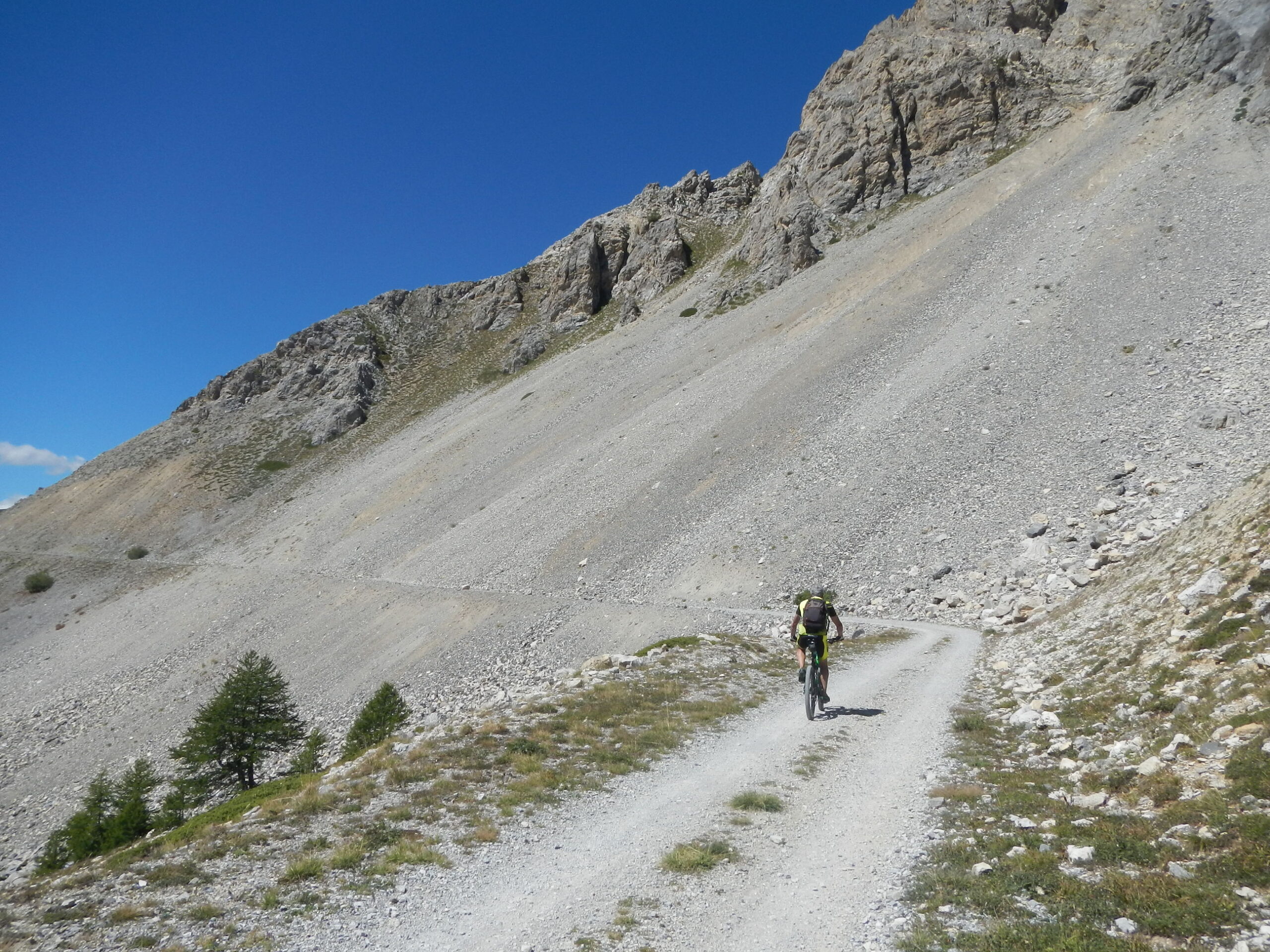 Volendo si può evitare la strada asfaltata: alla fine del paese, dopo circa 200 metri, si nota sulla sinistra, una strada sterrata che conduce prima a la Rosier e successivamente, con un po’ di saliscendi, a Val des Pres. Si attraversa il paese e non si attraversa il ponte, ma si prosegue sulla strada sulla destra idrografica della valle. Dopo circa 100 m c’è un bivio con indicazioni Granon. Ignoratelo: quello è per chi va a piedi. Proseguire dritto e poi la strada svolta a sinistra e inizia decisamente a salire. Dopo un lungo tratto boscoso su fondo ottimale si giunge alle baite Granon 1915 m, da qui la strada compie un semicerchio e si porta dall’altra parte del vallone. Dopo una ripida rampa c’è un bivio (con nessuna indicazione): quello di sinistra è più diretto, mentre quello di destra è più ripido ma molto più panoramico. Conviene comunque seguire la sterrata principale quindi a sinistra, che via via salendo presenta un fondo peggiore, anche se sempre pedalabile ma con tratti piuttosto scavati dalle acque. A circa 2300 m ci si immette nella bella sterrata in falsopiano che collega il col du Granon al Fort de Lenlon (visibile in alto in cima al cucuzzolo erboso) e al Fort de l’Olive.