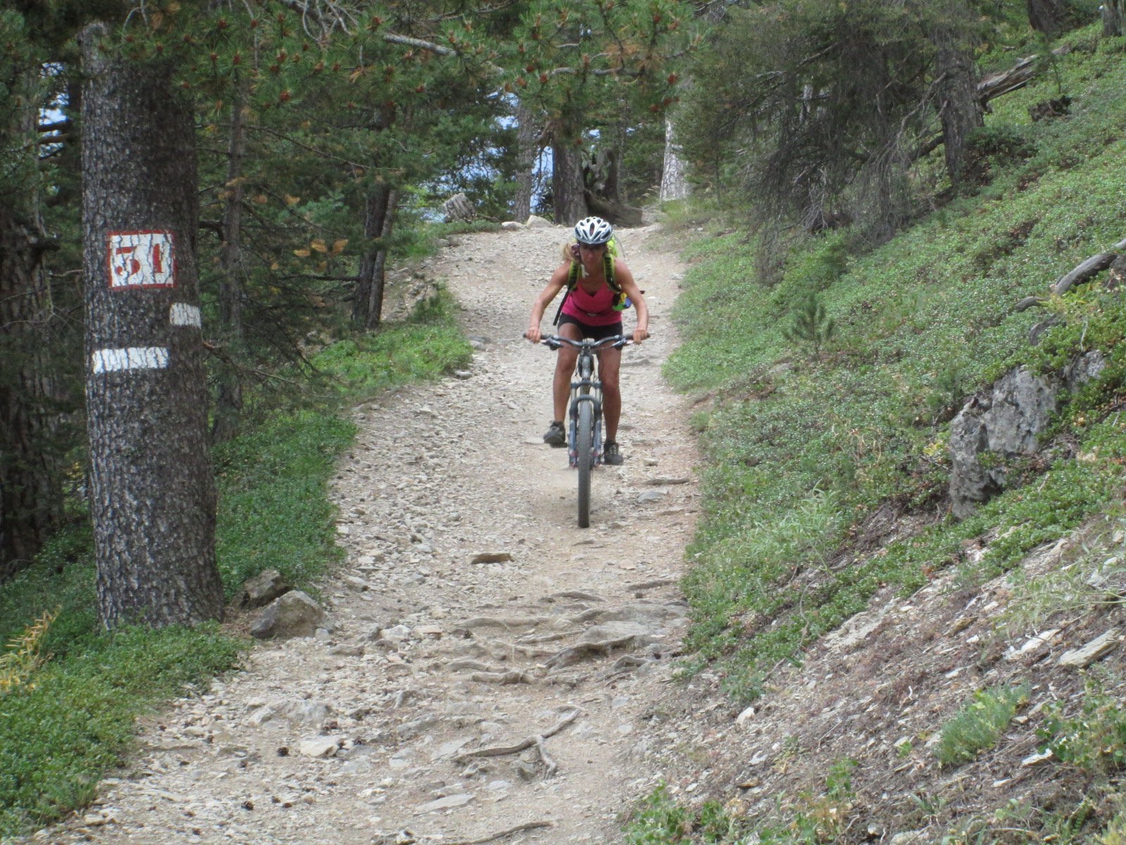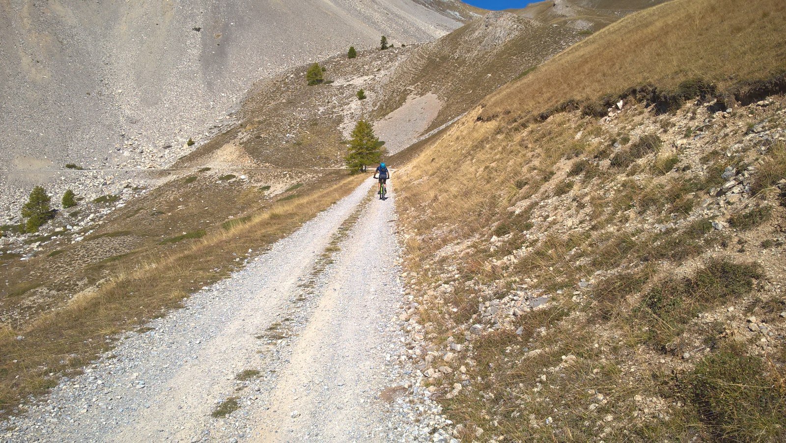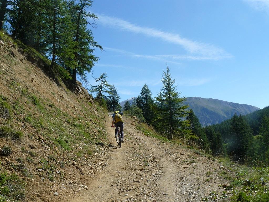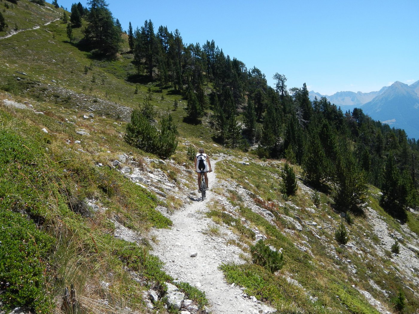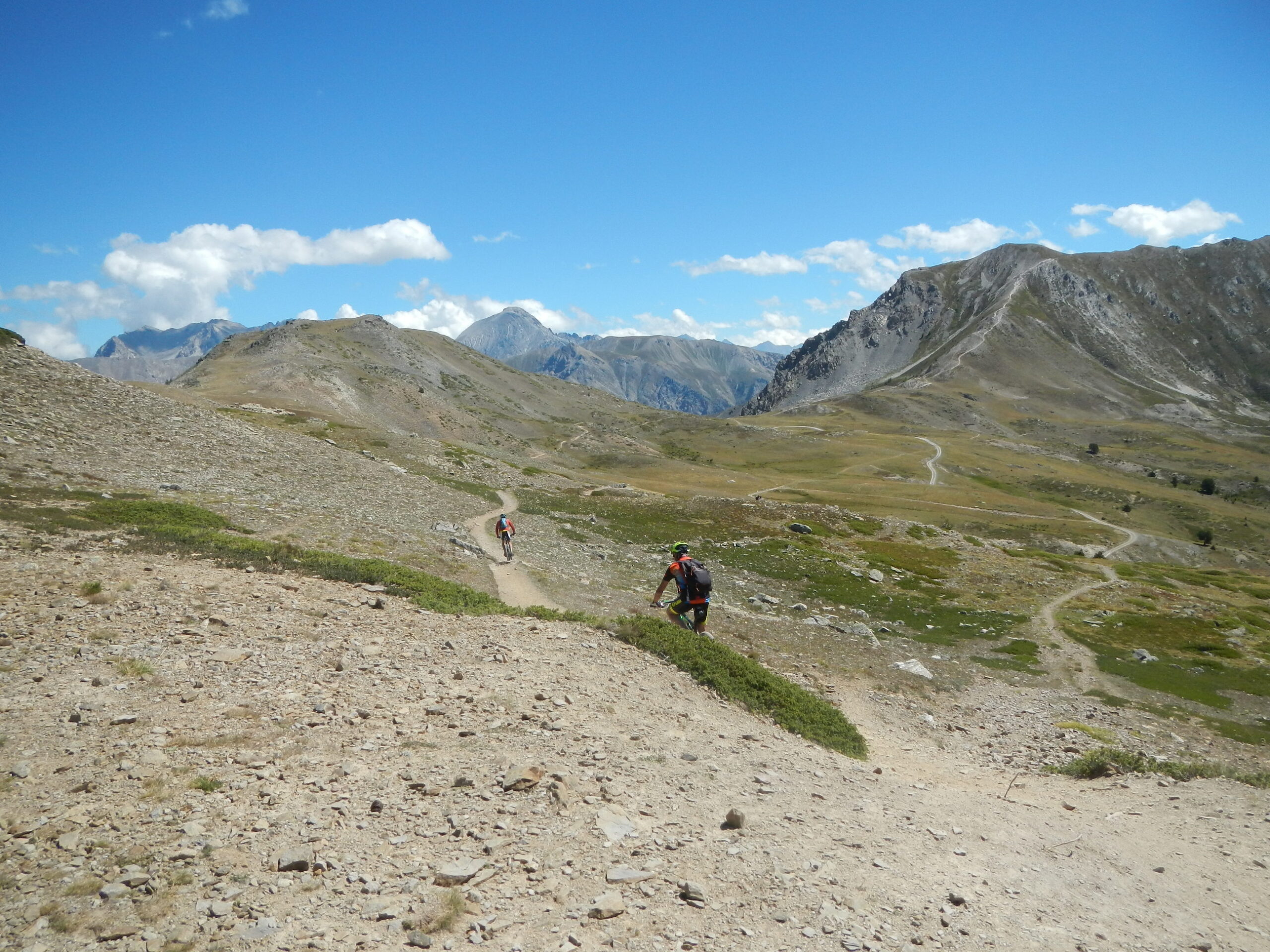 Si segue il sentiero che scende leggermente sulla destra (a sinistra,invece, è ben visibile il sentiero che sale e percorre la cresta della Peyrolle). Seguire fedelmente il sentiero e le indicazioni “VTT” (rosse su fondo bianco) e ad ogni bivio tenersi sempre sulla sinistra (ad eccezione di un bivio con sentiero in salita, segnalato con direzione Croix de Toulouse ma non ciclabile) a mezza costa in direzione Briançon – Croix de la Toulouse.