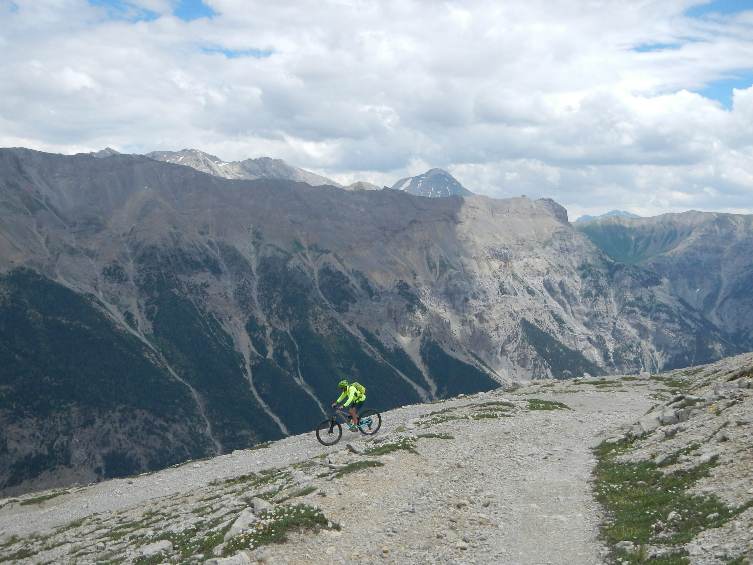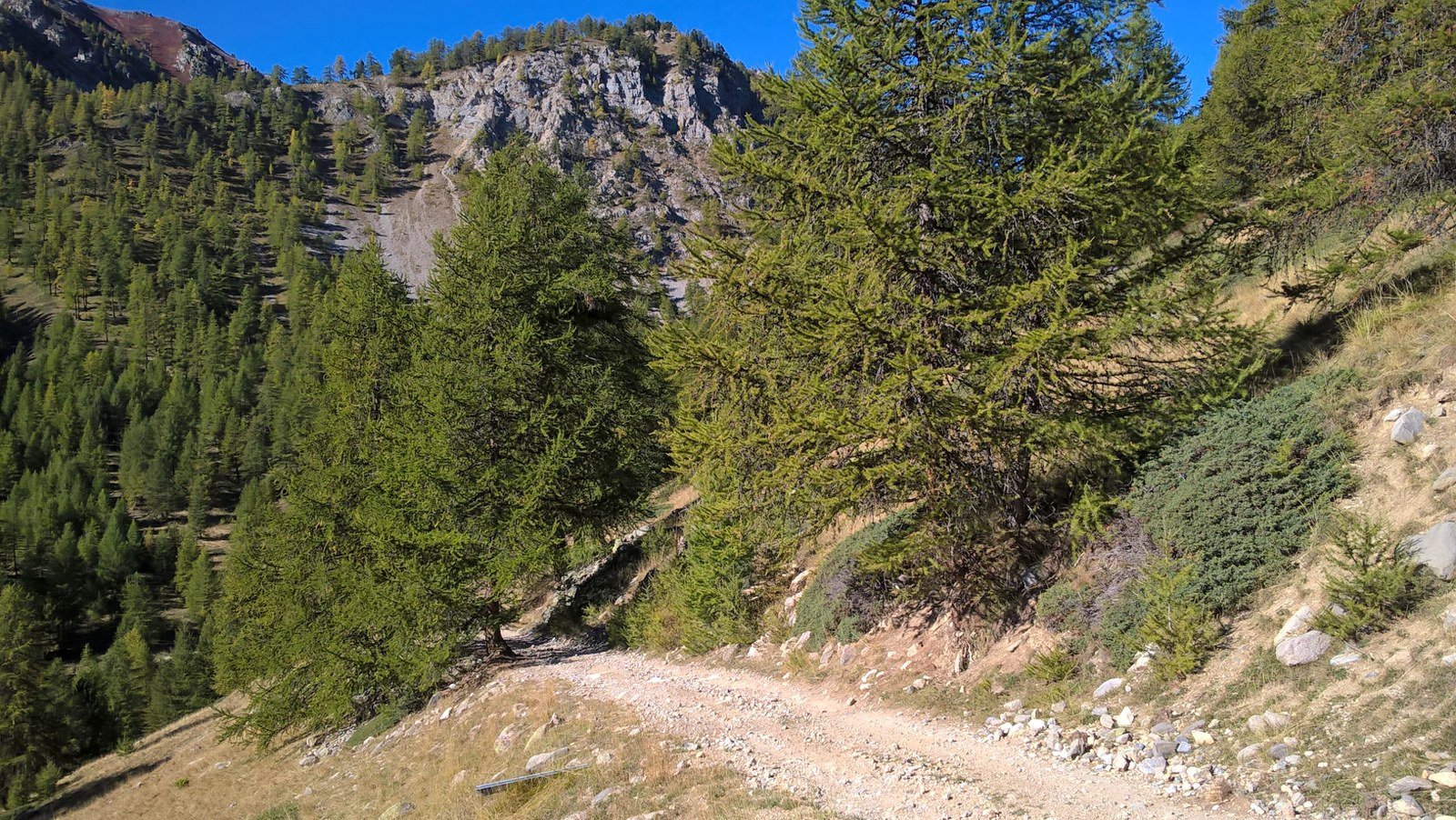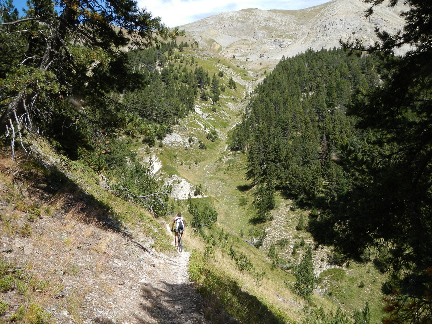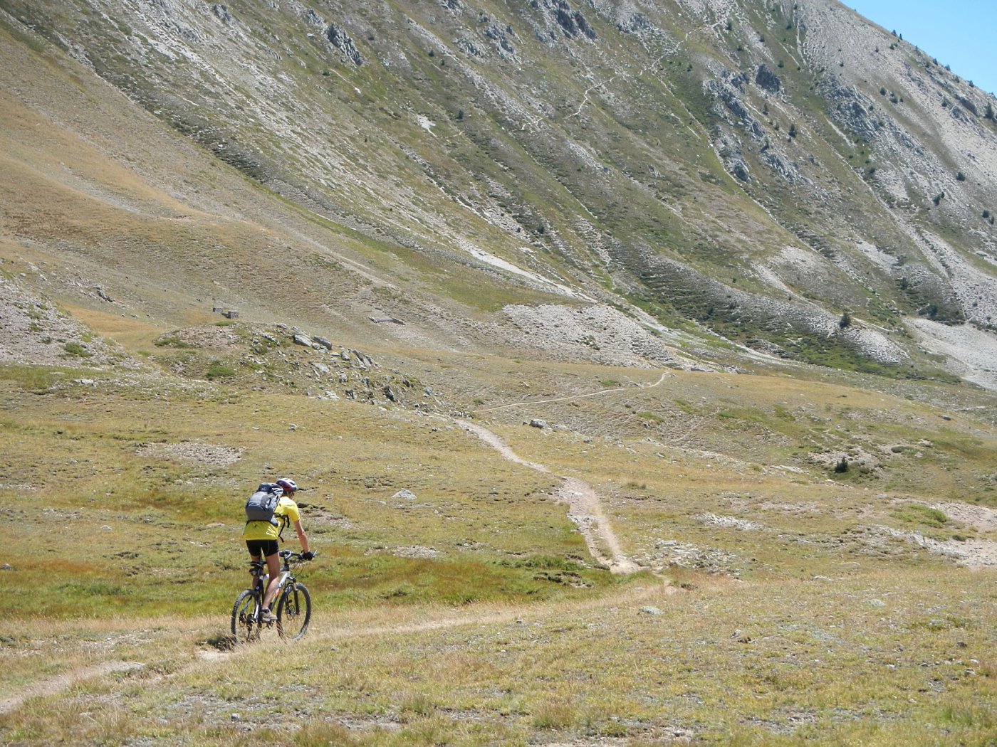 Si segue il sentiero che scende leggermente sulla destra (a sinistra,invece, è ben visibile il sentiero che sale e percorre la cresta della Peyrolle). Seguire fedelmente il sentiero e le indicazioni “VTT” (rosse su fondo bianco) e ad ogni bivio tenersi sempre sulla sinistra (ad eccezione di un bivio con sentiero in salita, segnalato con direzione Croix de Toulouse ma non ciclabile) a mezza costa in direzione Briançon – Croix de la Toulouse.