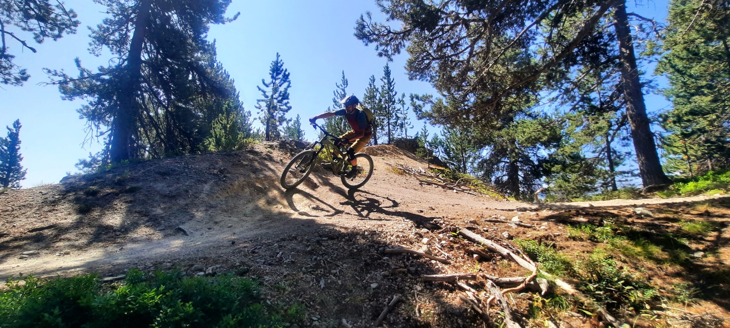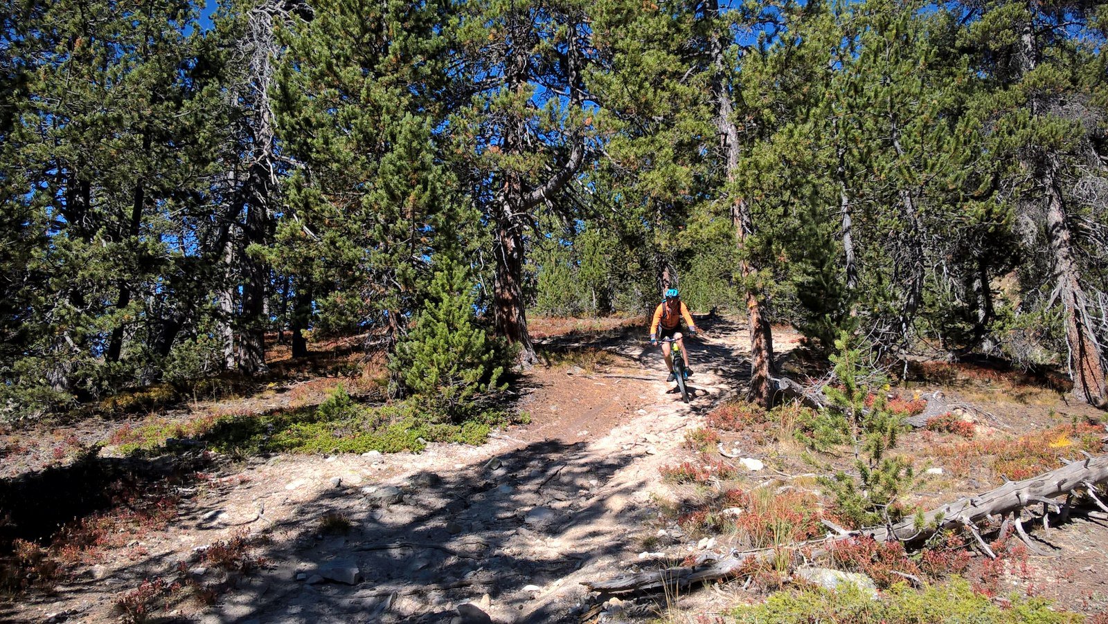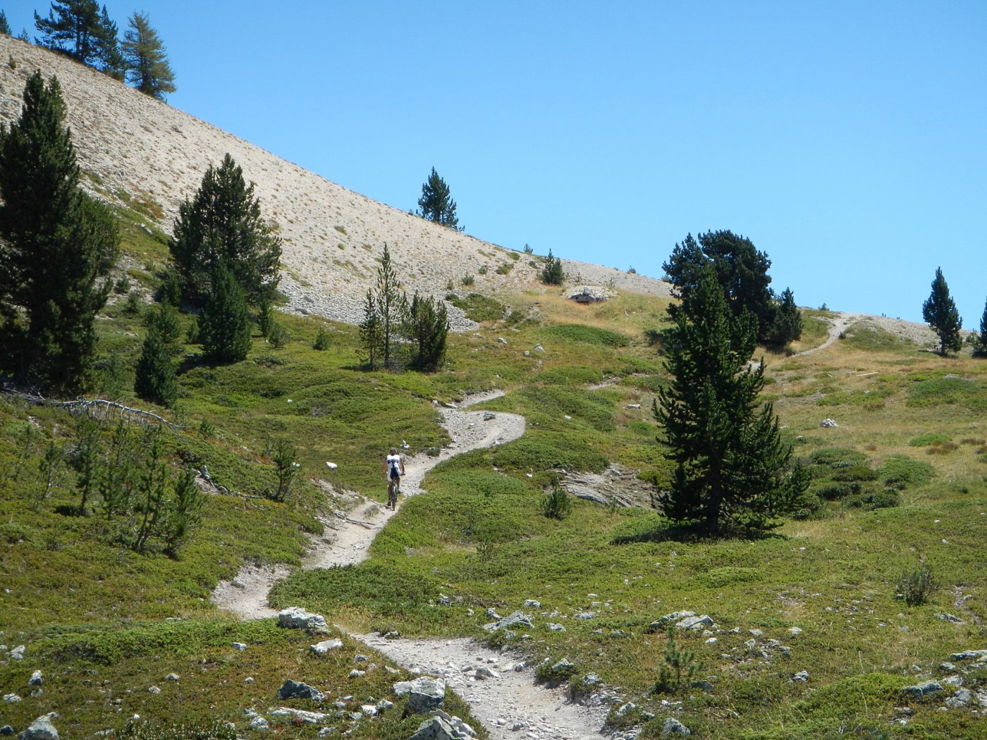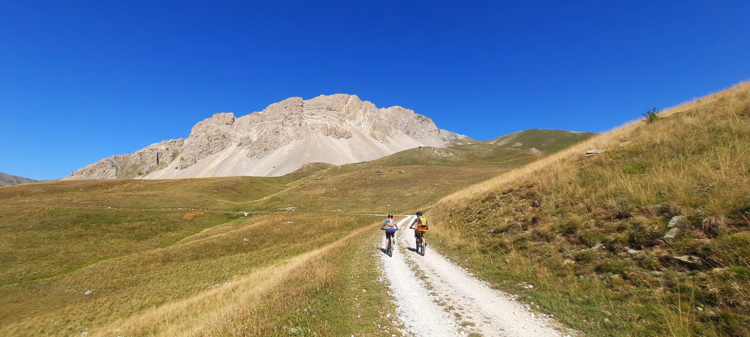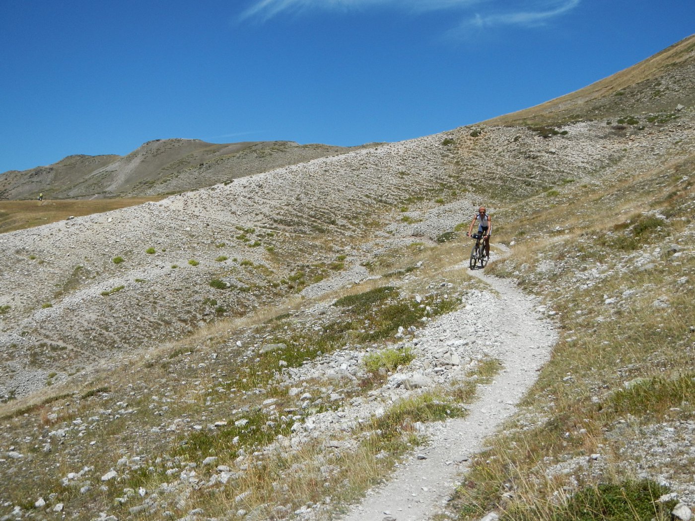 Si segue il sentiero che scende leggermente sulla destra (a sinistra,invece, è ben visibile il sentiero che sale e percorre la cresta della Peyrolle). Seguire fedelmente il sentiero e le indicazioni “VTT” (rosse su fondo bianco) e ad ogni bivio tenersi sempre sulla sinistra (ad eccezione di un bivio con sentiero in salita, segnalato con direzione Croix de Toulouse ma non ciclabile) a mezza costa in direzione Briançon – Croix de la Toulouse.