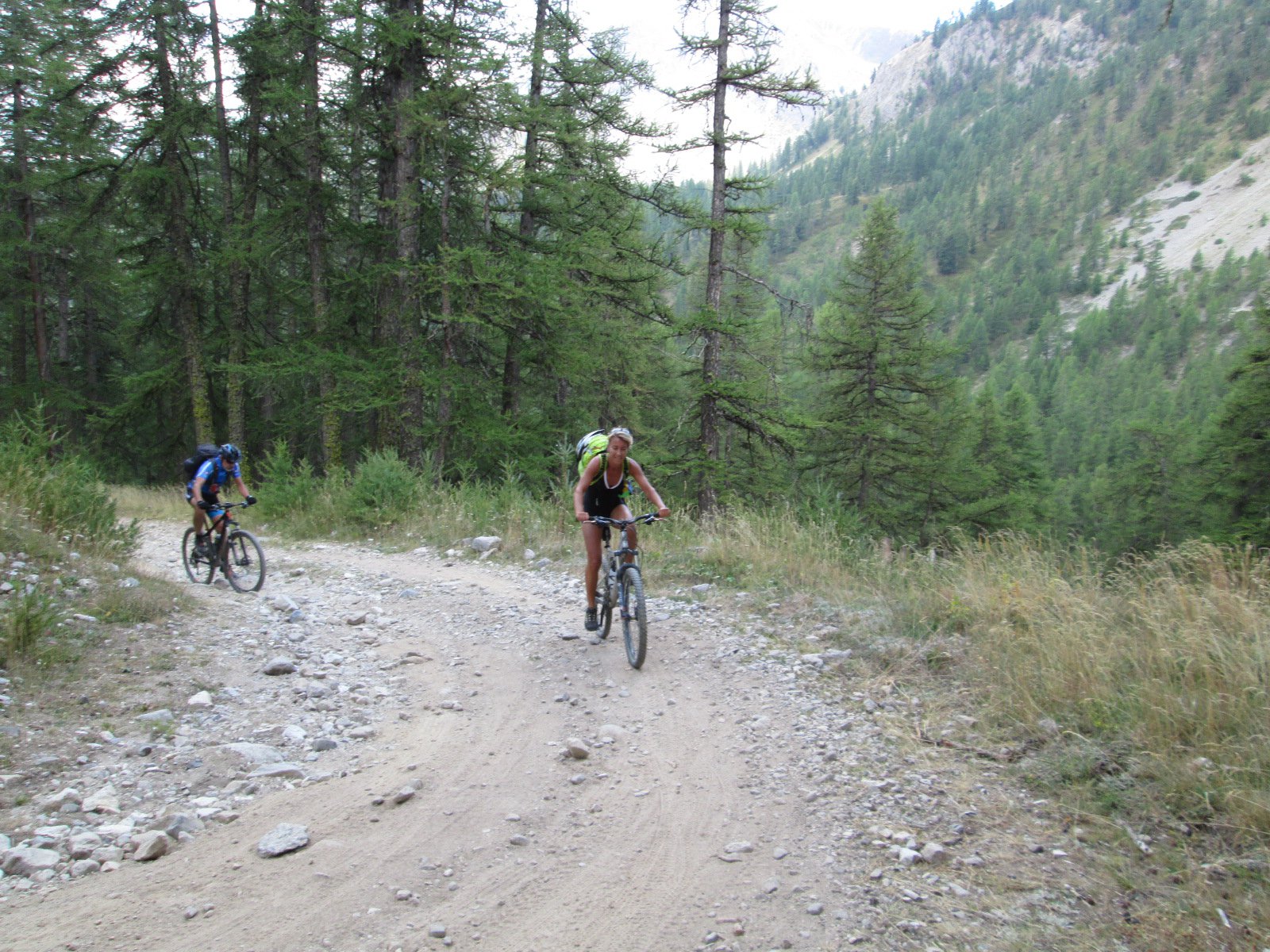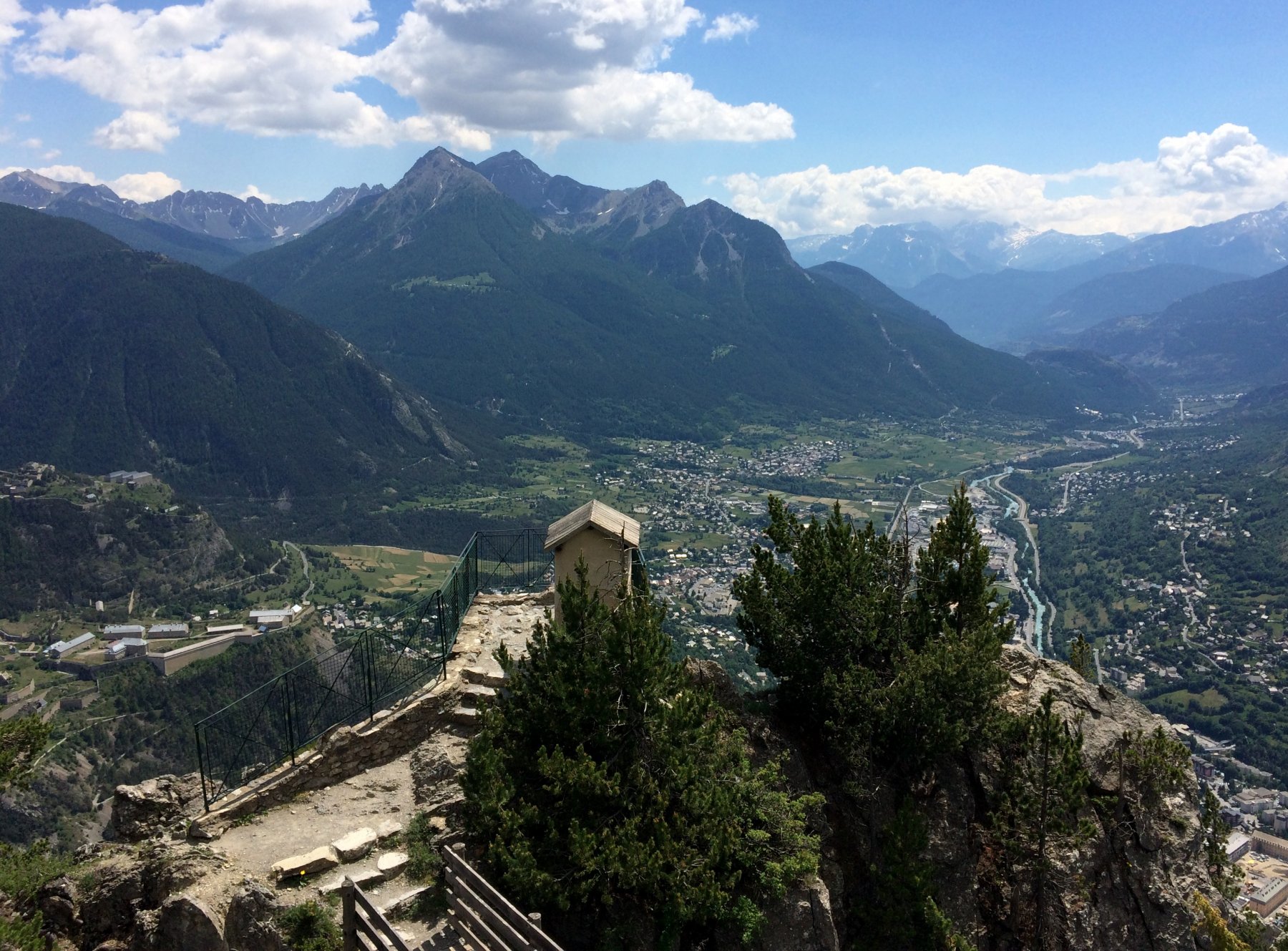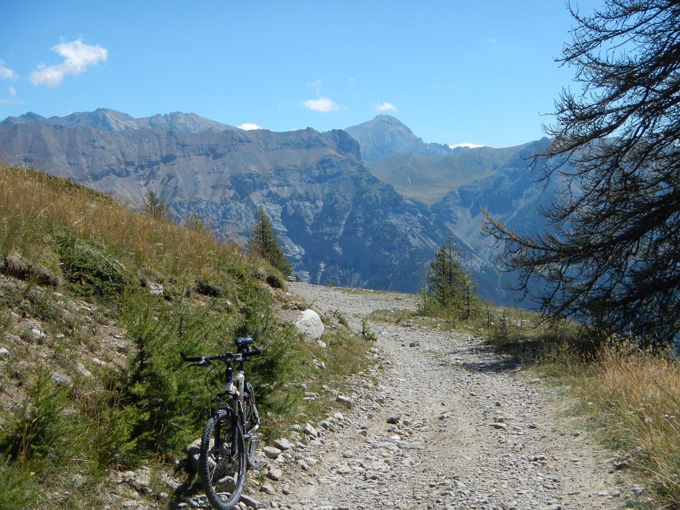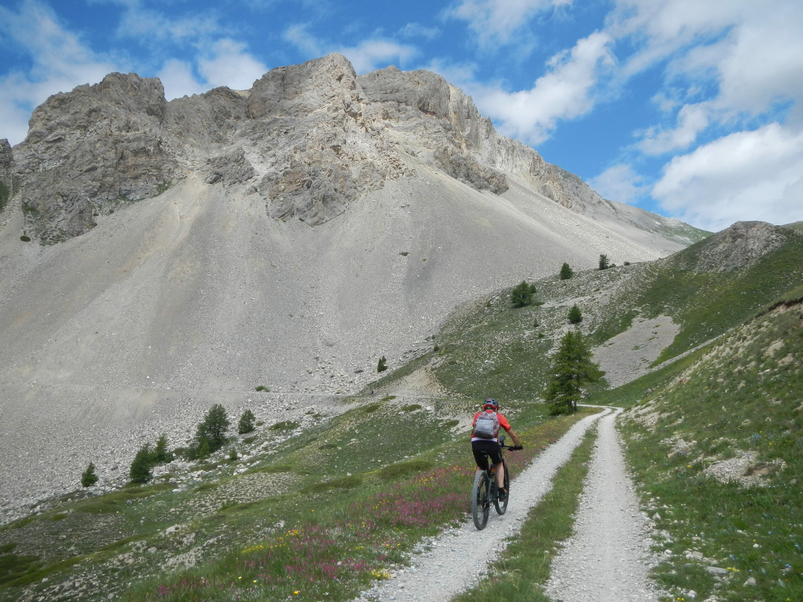 Si risale quindi per 1,5 Km alla Croix de Toulose 1906 m. Dopo aver ammirato il panorama a picco su Briançon, si scende lungo il bellissimo ed evidente sentiero a sinistra (staccionata in legno). Poco prima di arrivare al forte poco sopra Briançon, si lascia il sentiero principale e si segue a sinistra una traccia con indicazioni “VTT” (rosse su fondo bianco).