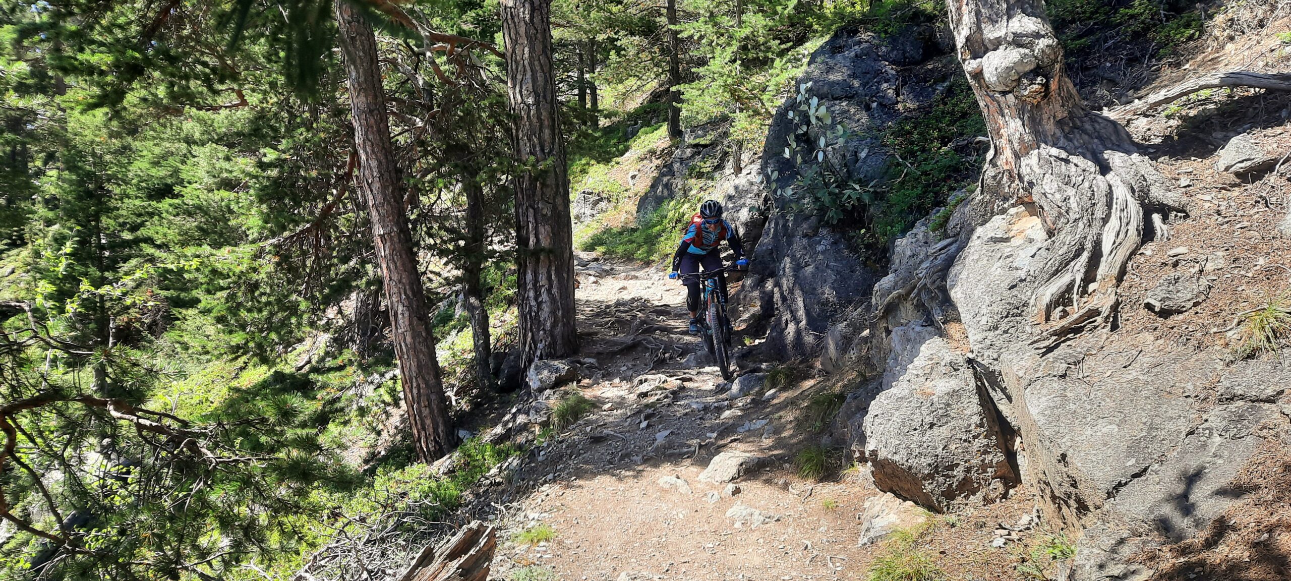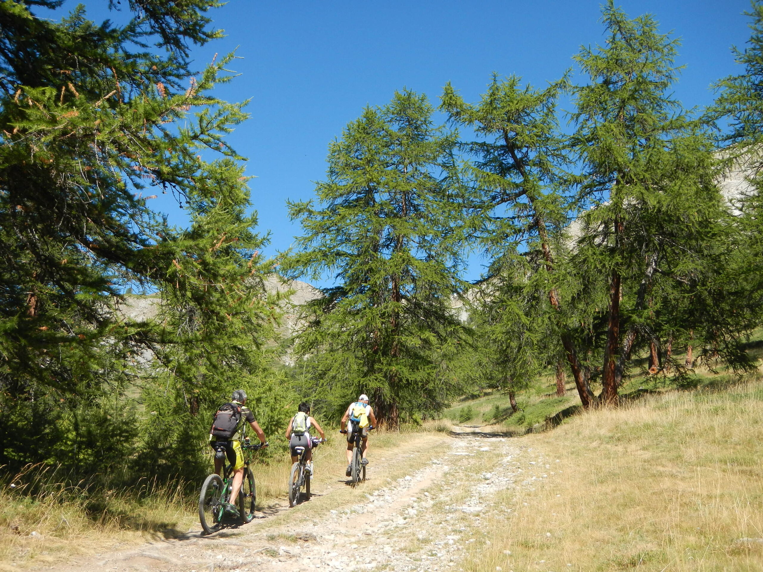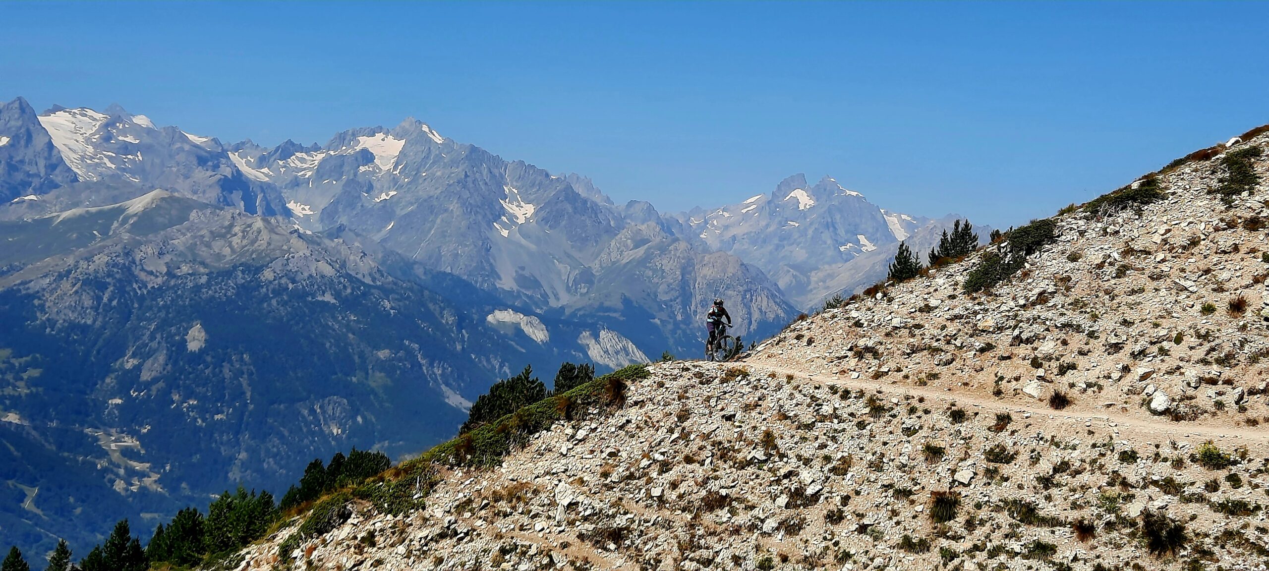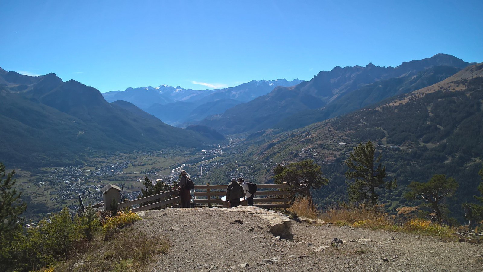 Si risale quindi per 1,5 Km alla Croix de Toulose 1906 m. Dopo aver ammirato il panorama a picco su Briançon, si scende lungo il bellissimo ed evidente sentiero a sinistra (staccionata in legno). Poco prima di arrivare al forte poco sopra Briançon, si lascia il sentiero principale e si segue a sinistra una traccia con indicazioni “VTT” (rosse su fondo bianco).