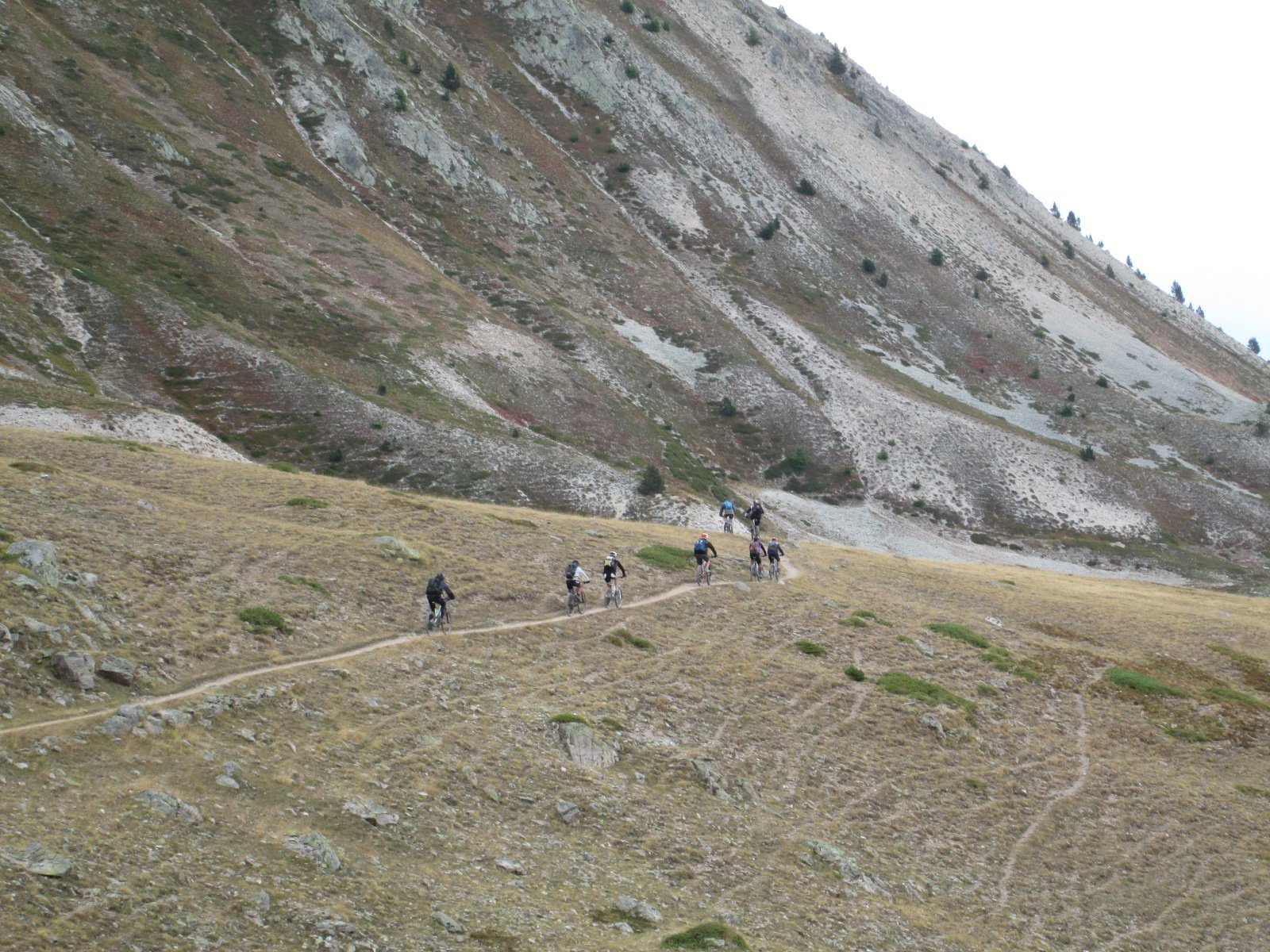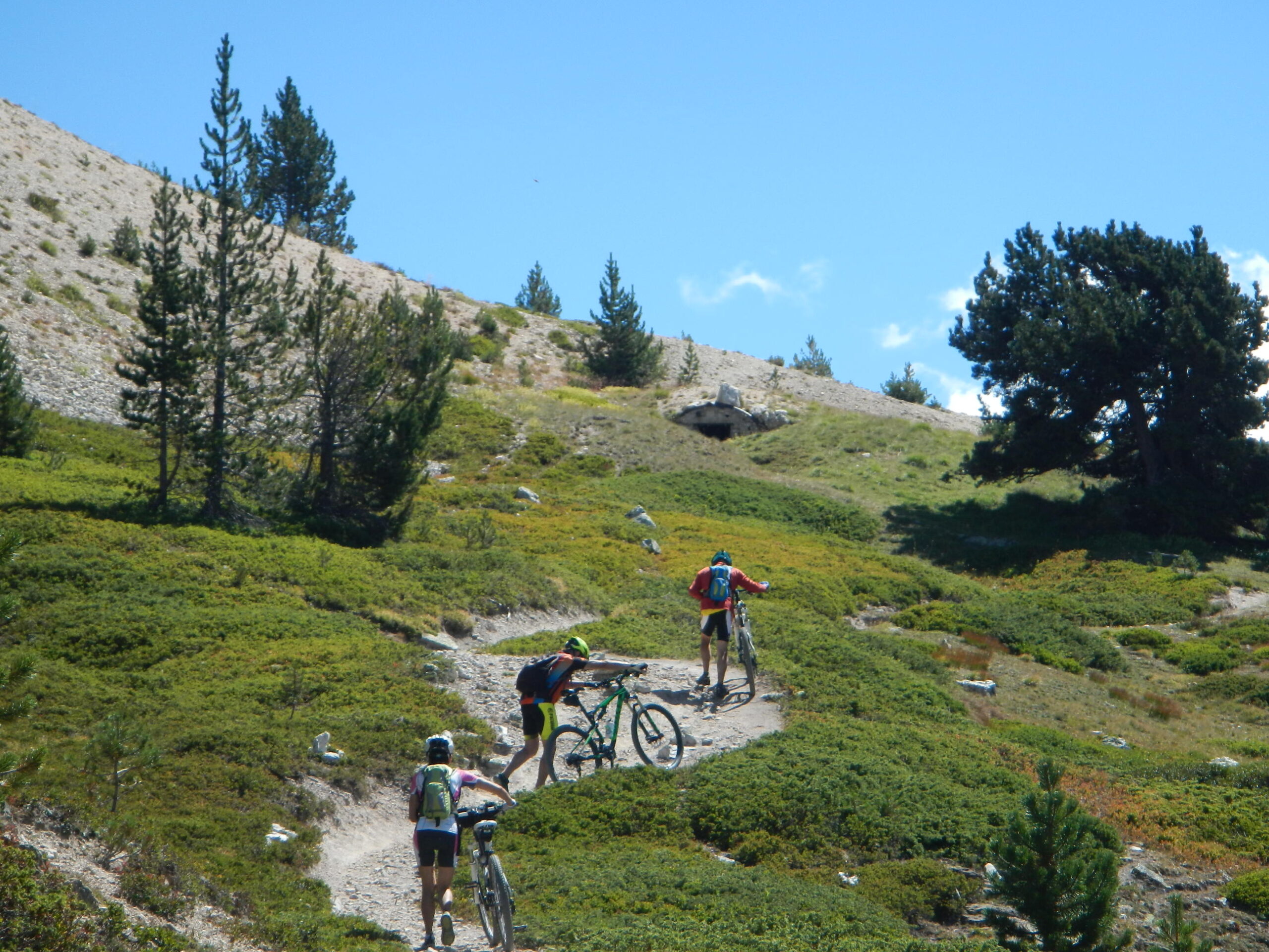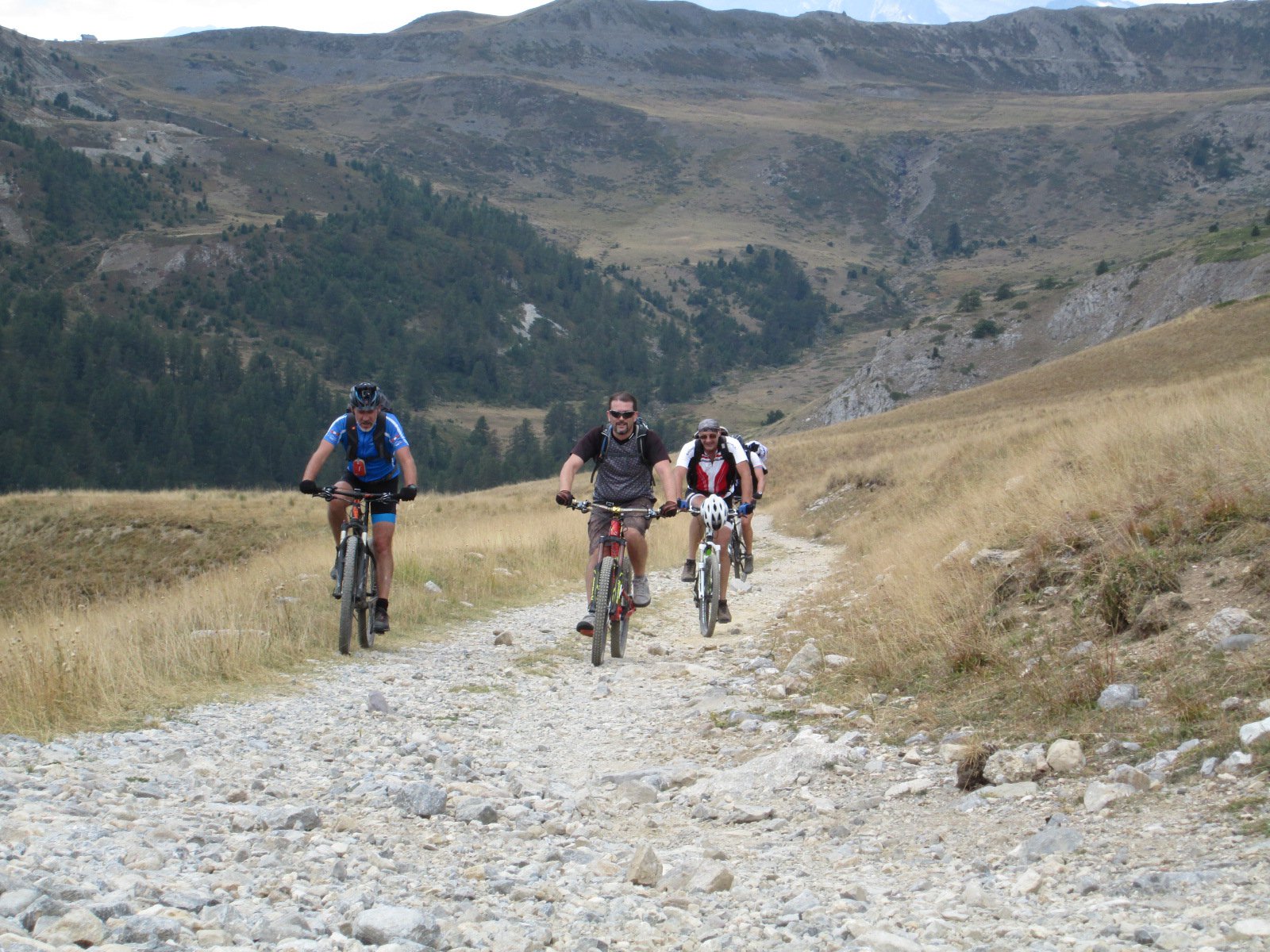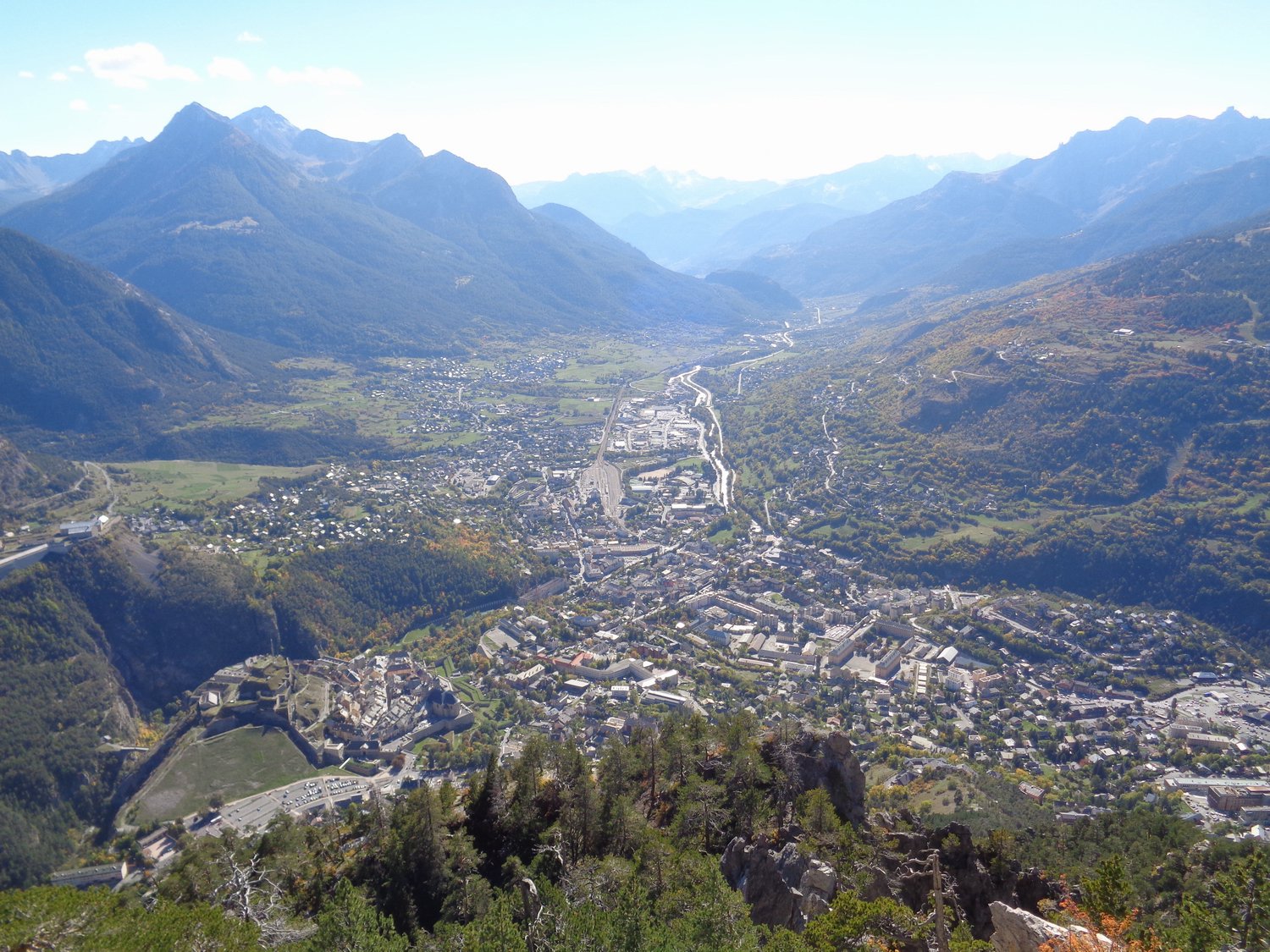 Si risale quindi per 1,5 Km alla Croix de Toulose 1906 m. Dopo aver ammirato il panorama a picco su Briançon, si scende lungo il bellissimo ed evidente sentiero a sinistra (staccionata in legno). Poco prima di arrivare al forte poco sopra Briançon, si lascia il sentiero principale e si segue a sinistra una traccia con indicazioni “VTT” (rosse su fondo bianco).