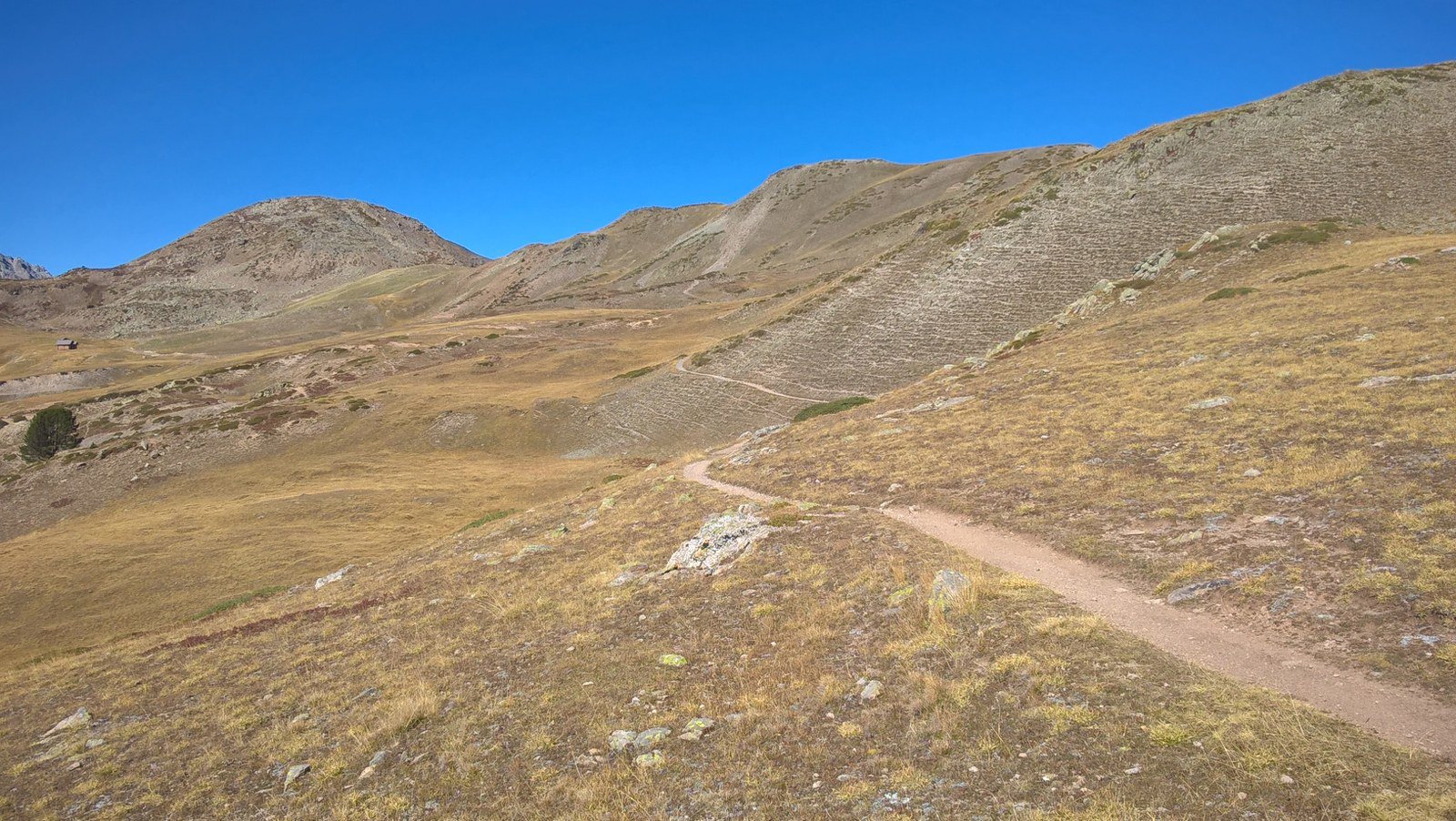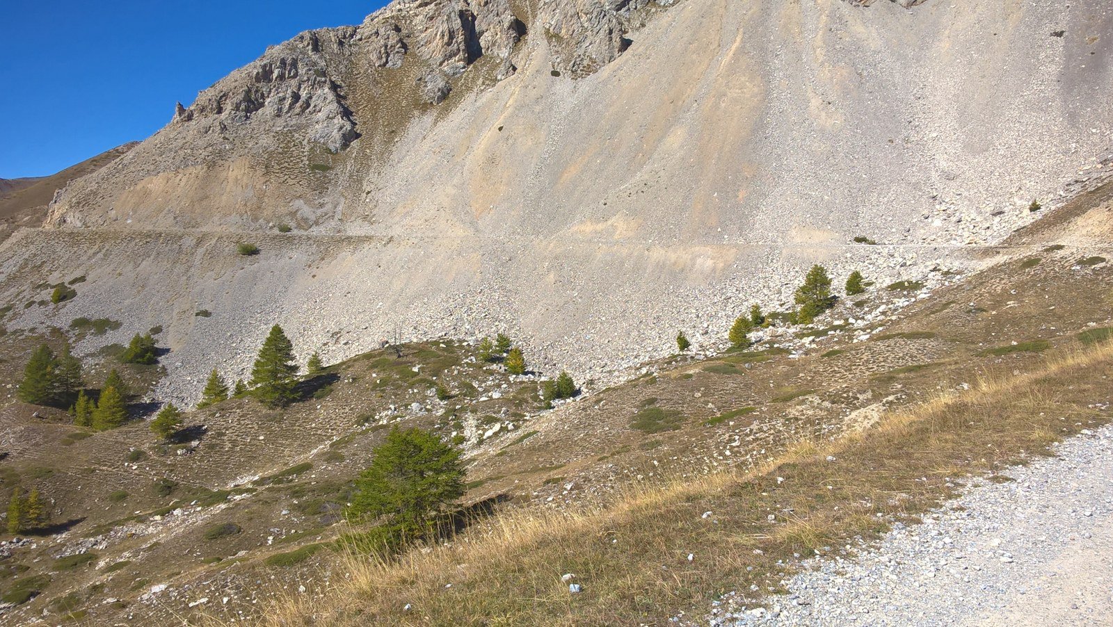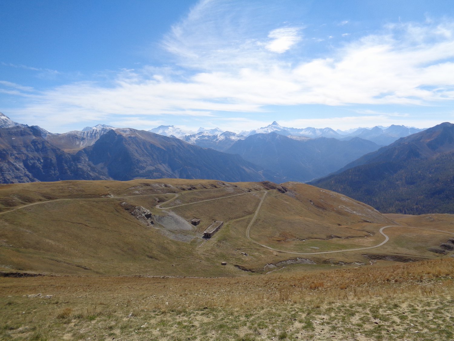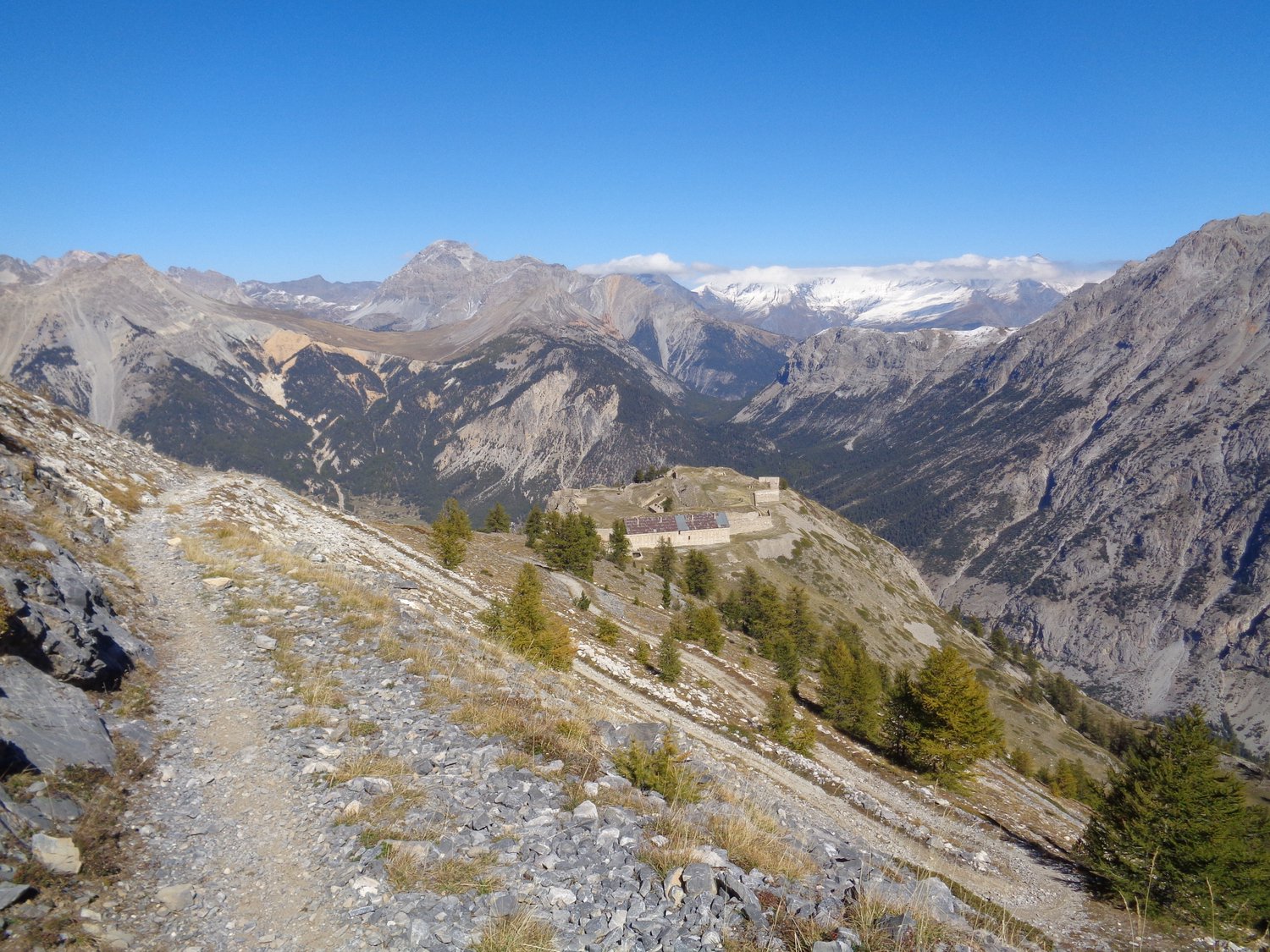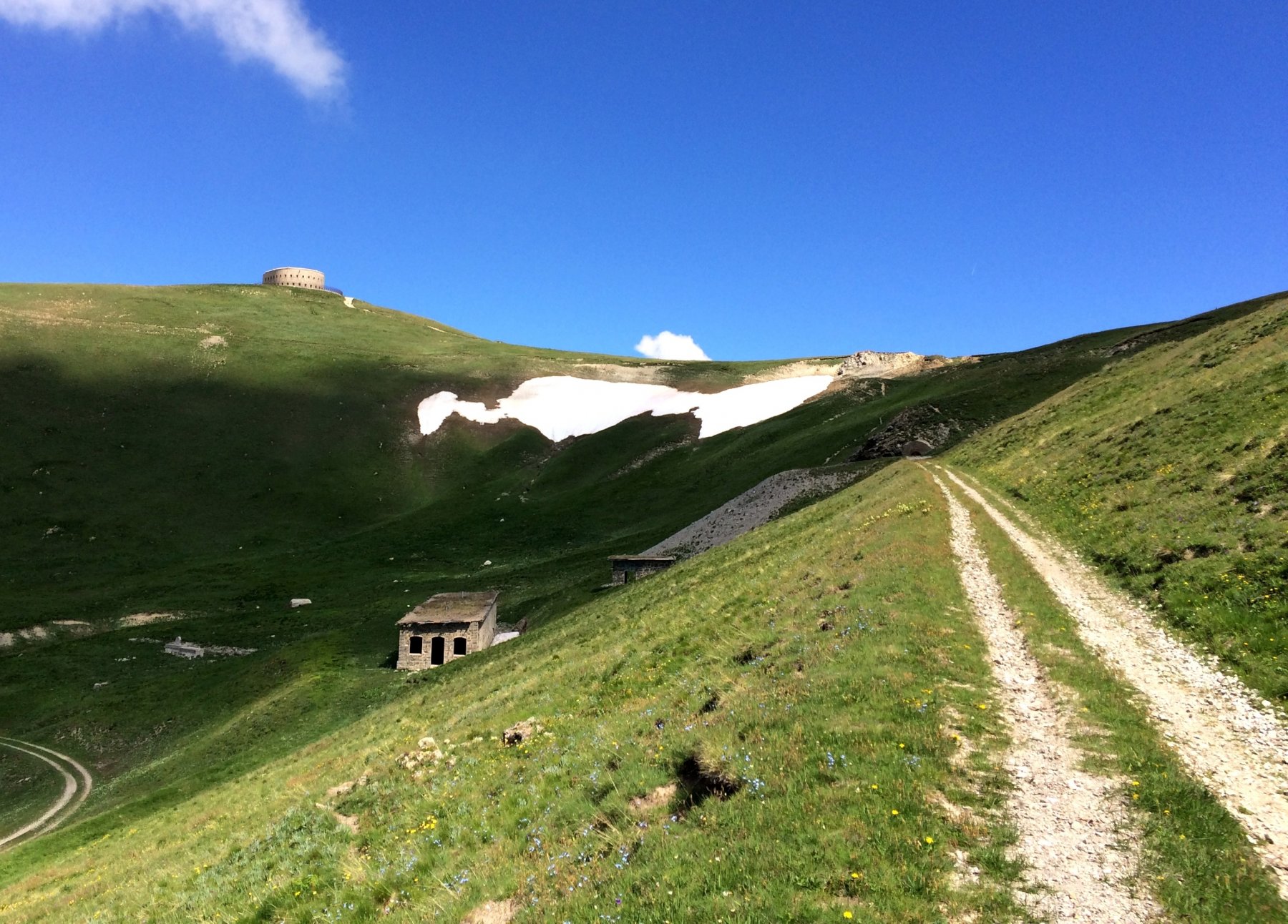 A questo punto si può decidere se andare direttamente al Col du Granon, quindi a sinistra, oppure allungare il giro, salendo al Fort de Lenlon percorrendone la stradina fino in cima. Da qui ora è possibile affrontare una discesa su fondo un po’ smosso percorrendo la dorsale erbosa verso nord, in discesa verso il fort de l’Olive, complesso fortificato a picco su Plampinet. Raggiuntolo, si percorre in salita mai dura ma costante per 3 km verso il Col du Granon, tornando al bivio già incontrato in precedenza. A questo punto si prosegue in leggera ascesa con ampio semicerchio fino al Col du Granon 2413 m.
