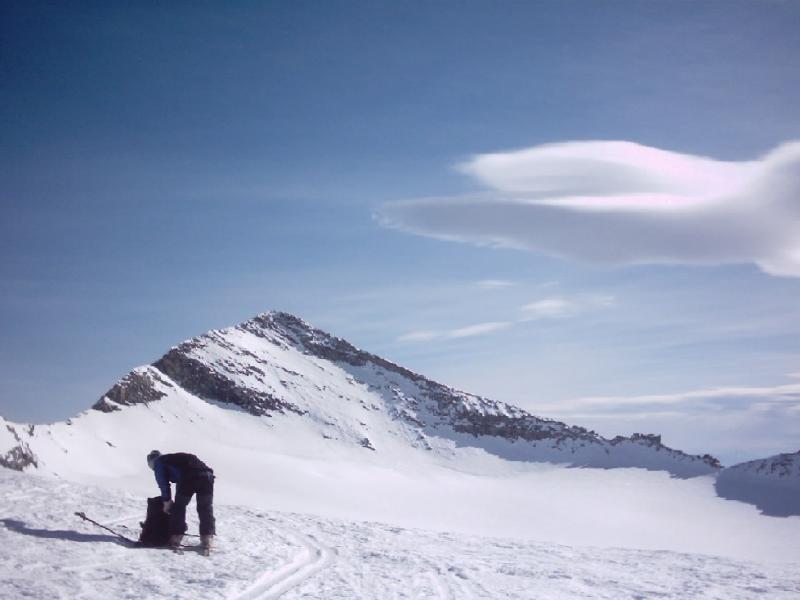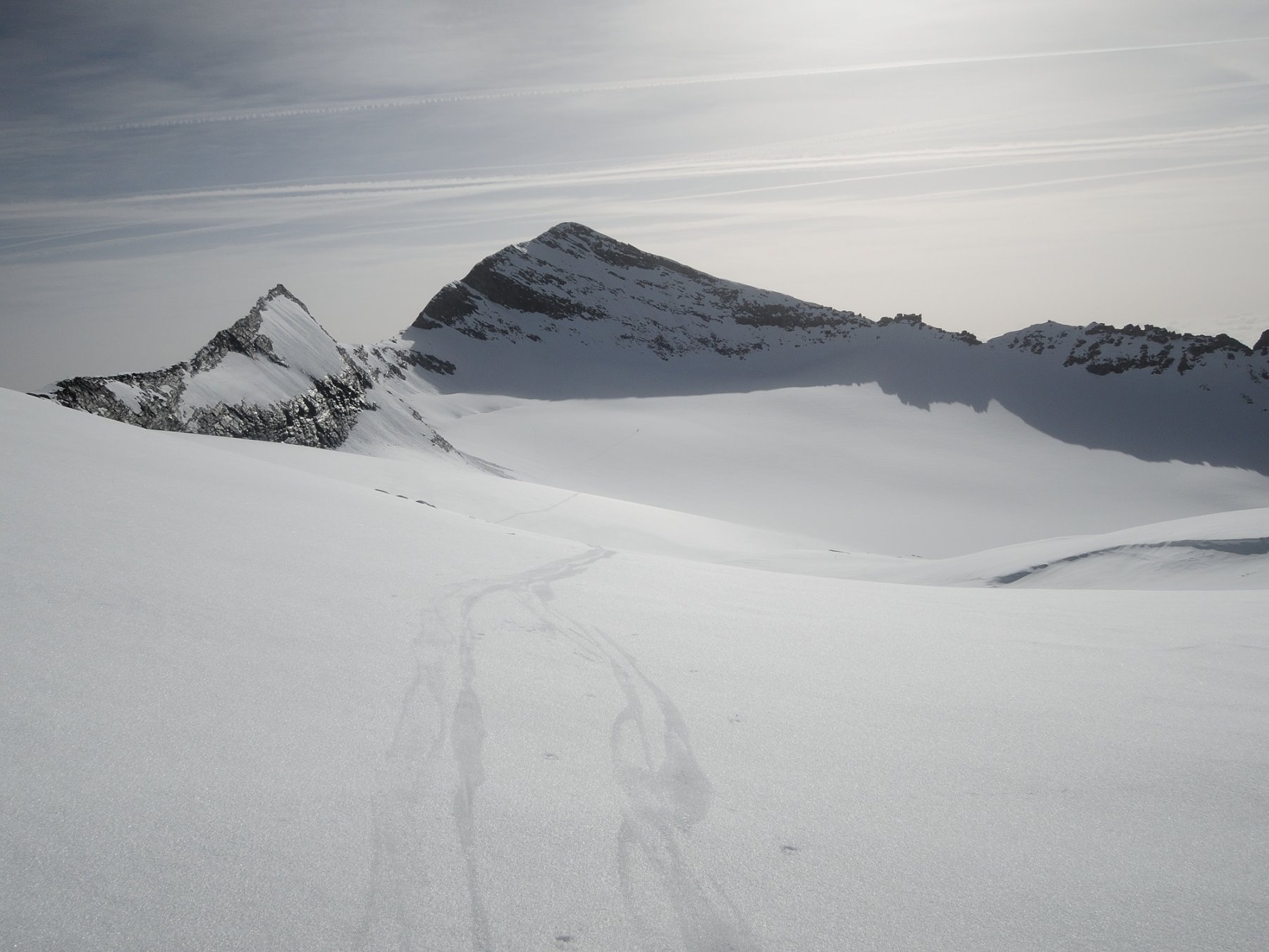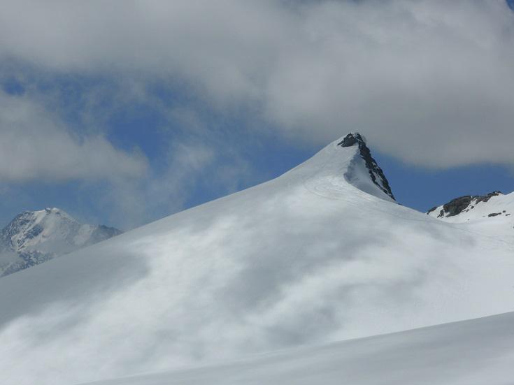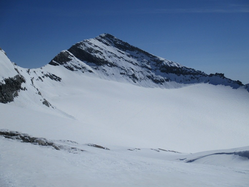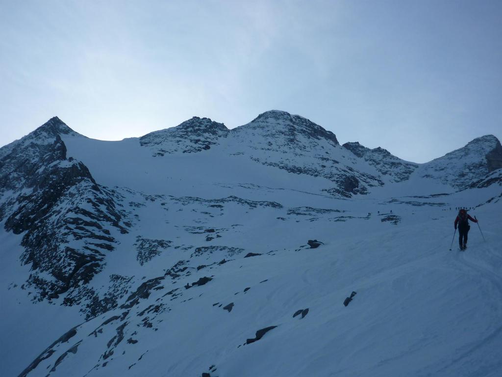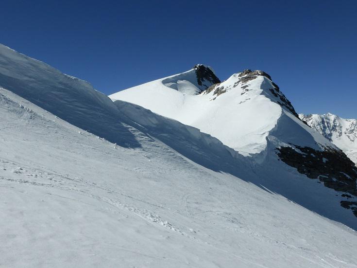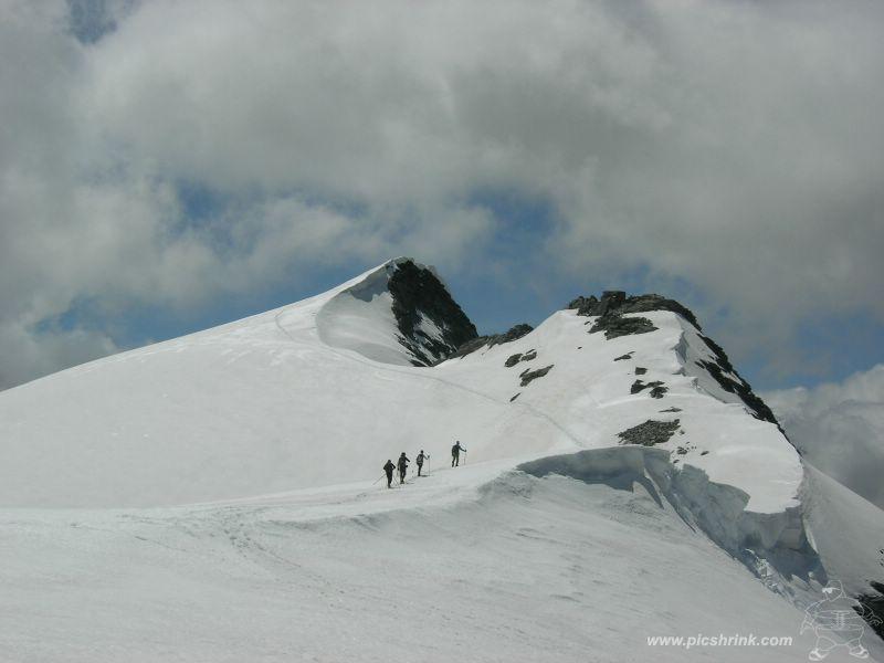 Portarsi sui vasti pianori del Alpjergletscher perdendo circa un centinaio di metri di dislivello per raggiungere poi la cresta S in corrispondenza di un evidente intaglio.