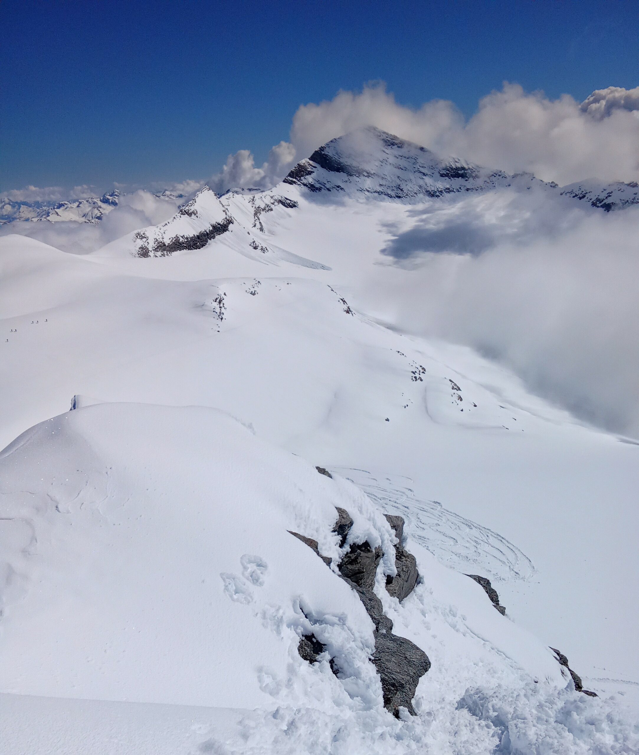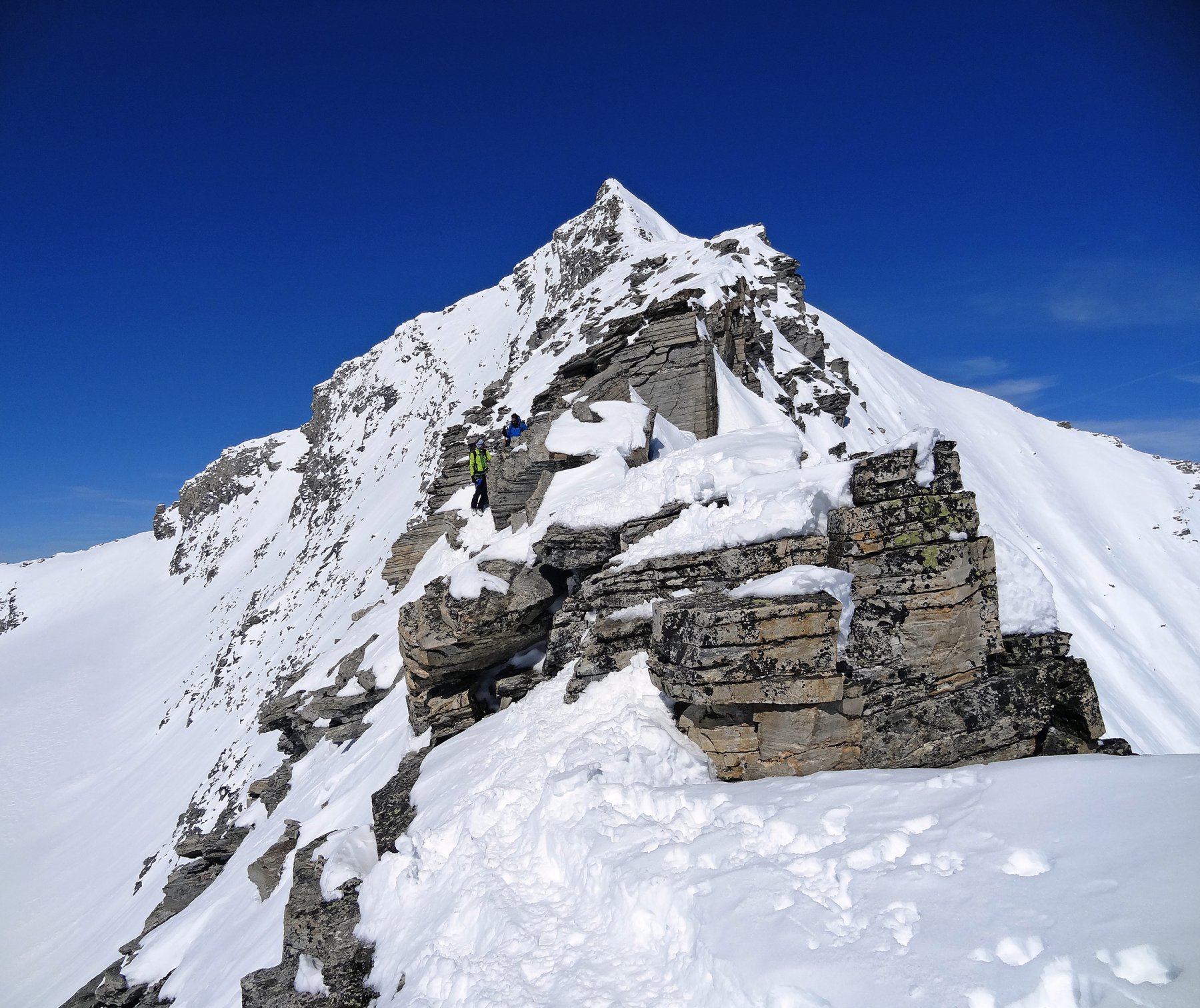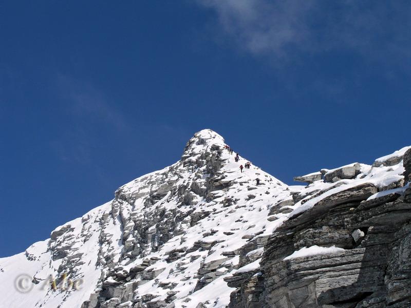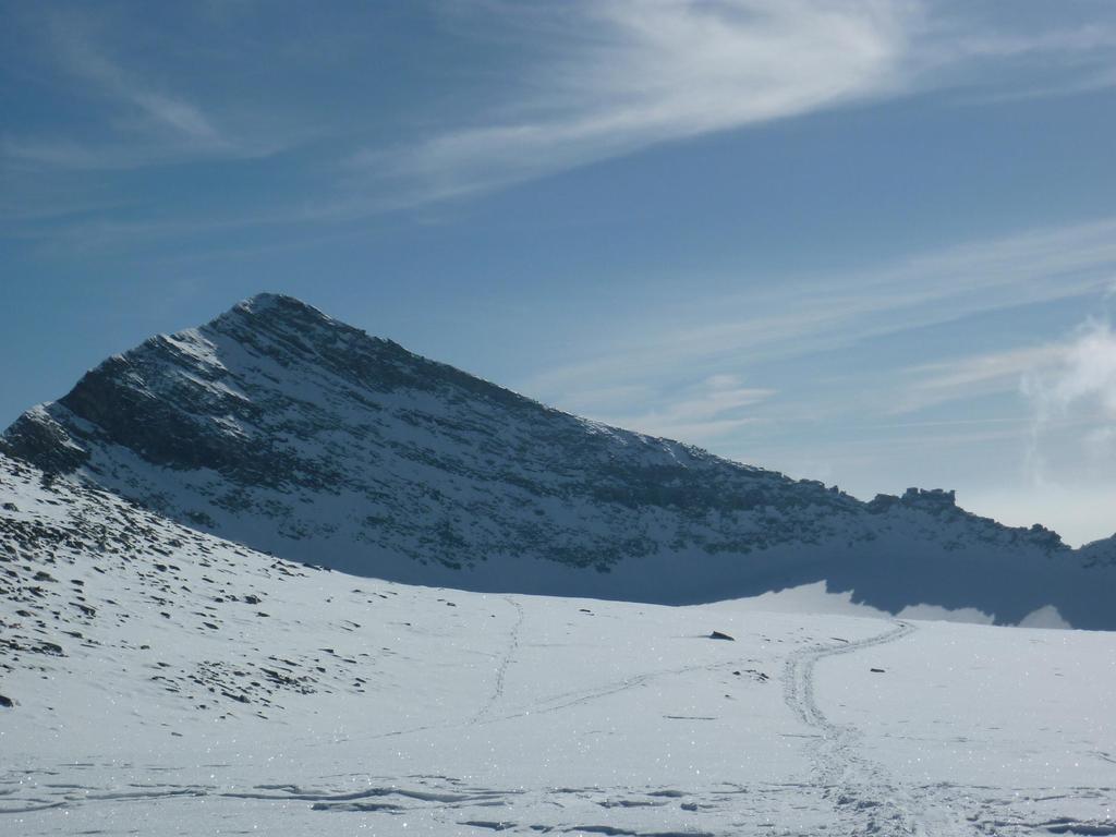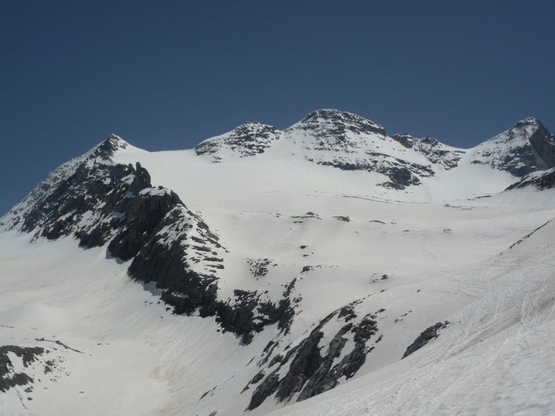 Portarsi sui vasti pianori del Alpjergletscher perdendo circa un centinaio di metri di dislivello per raggiungere poi la cresta S in corrispondenza di un evidente intaglio.