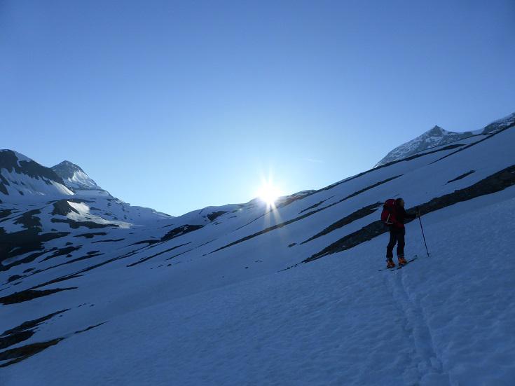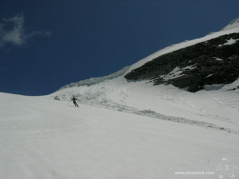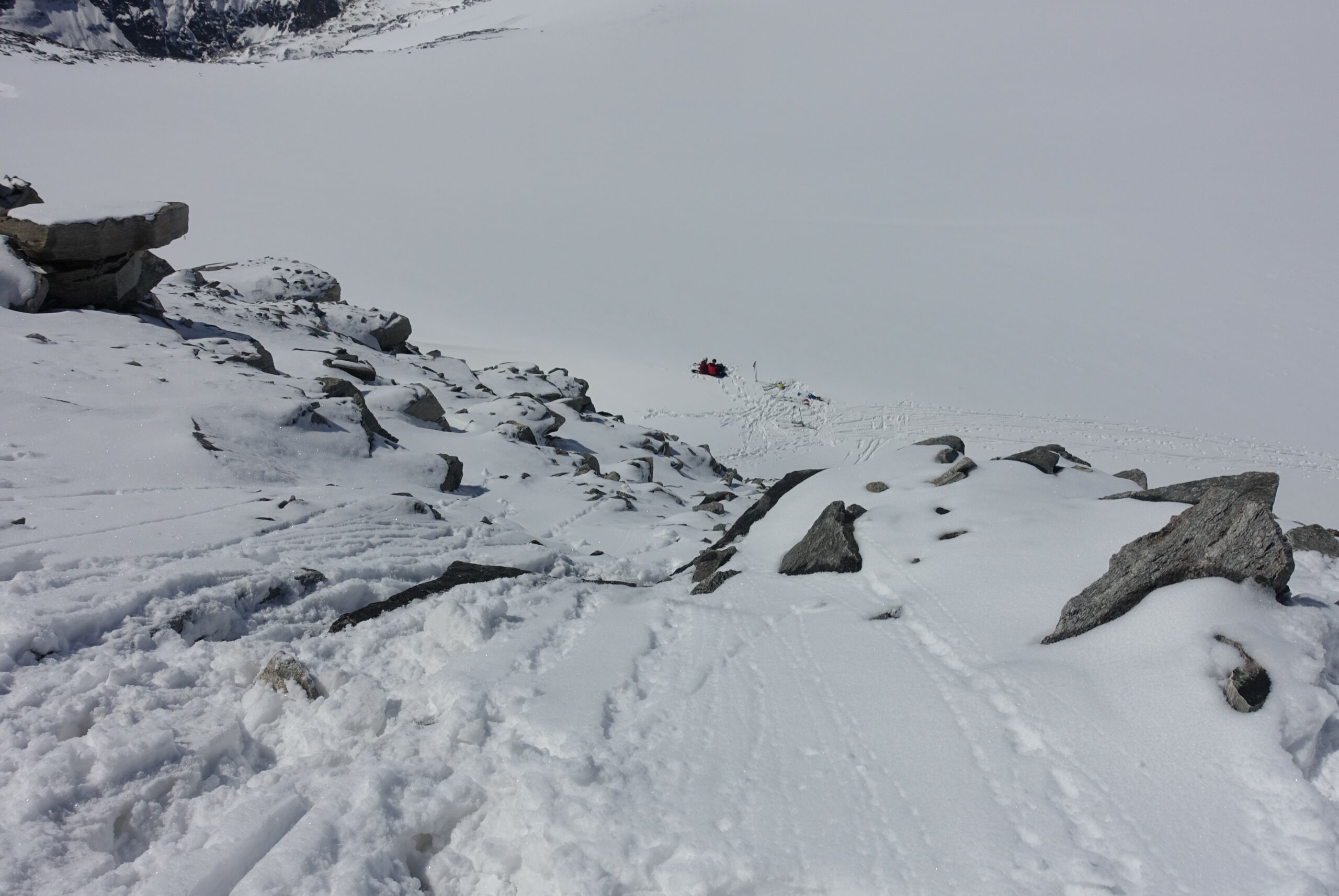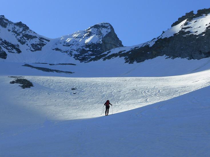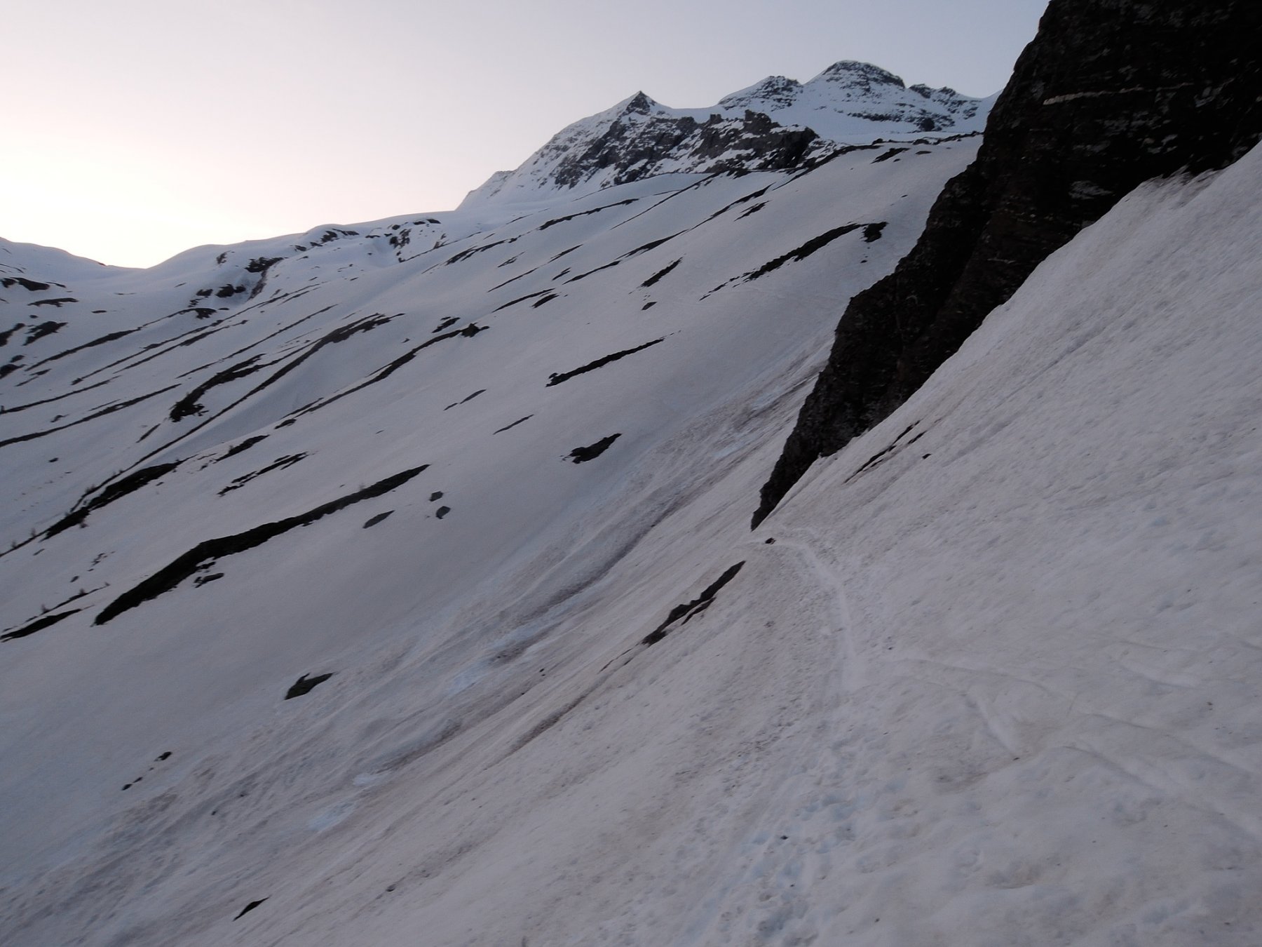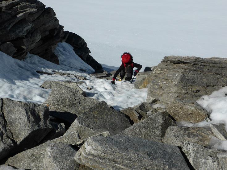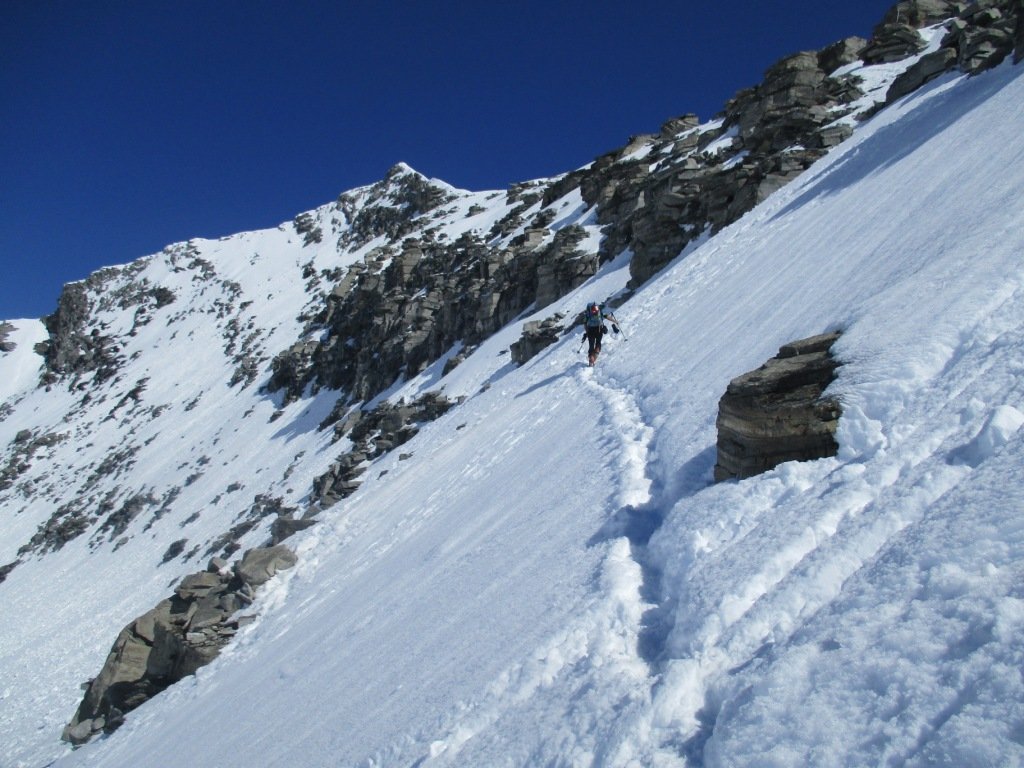 Aggirare la base della cresta e con un breve ma ripido traverso (prestare attenzione!) portarsi nel vallone che scende dall’Hommatau Gletscher.