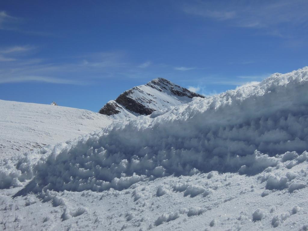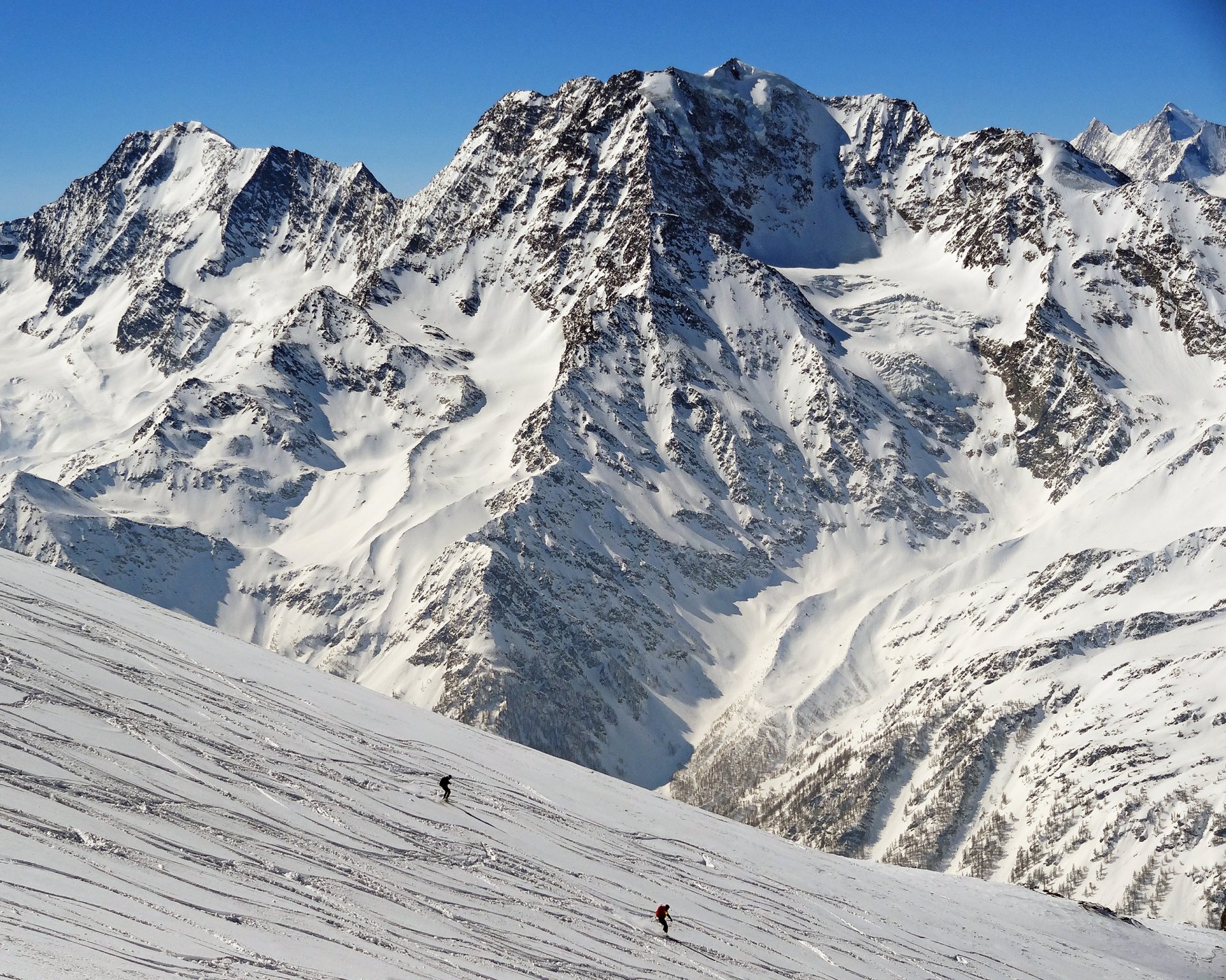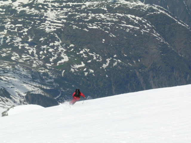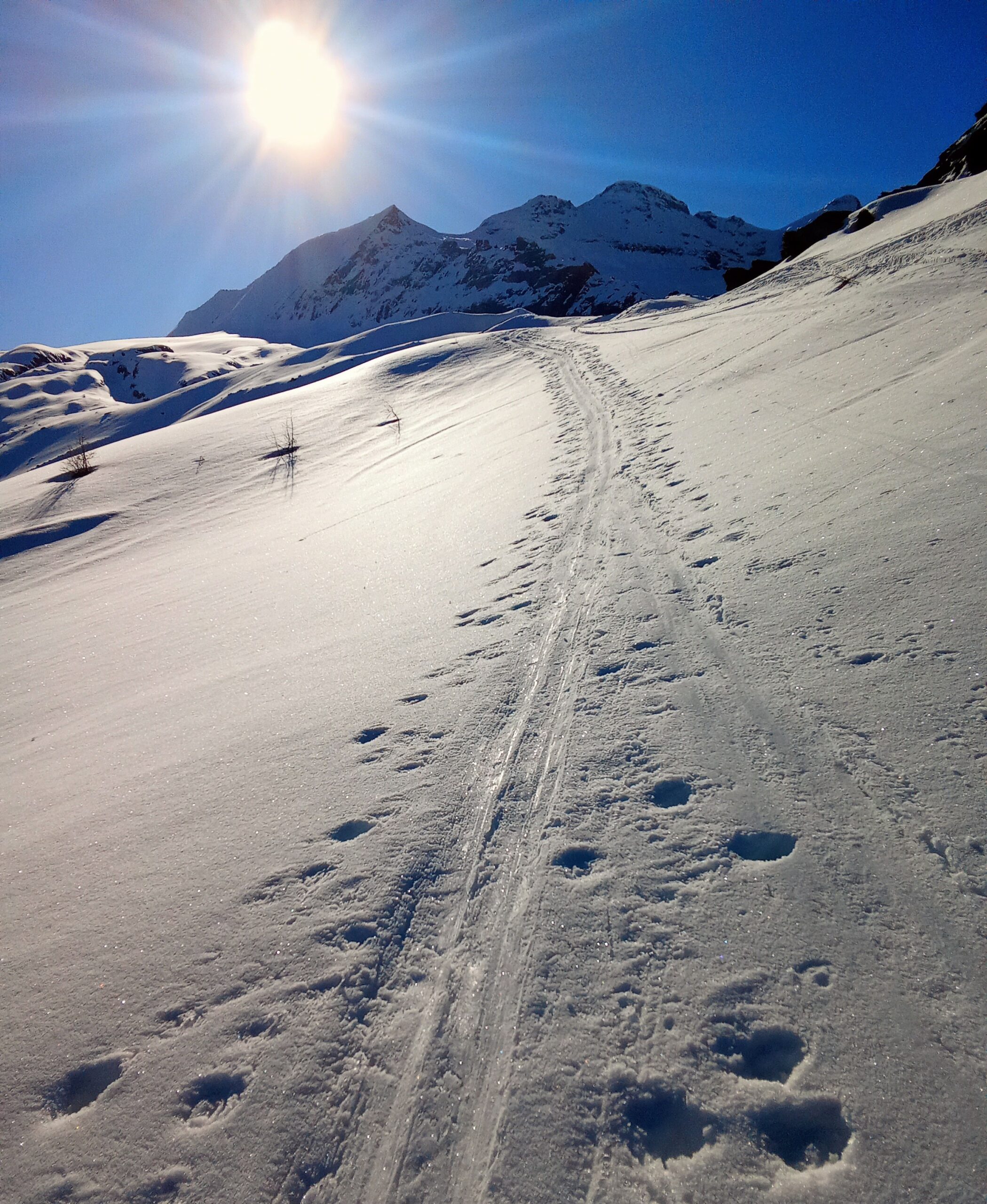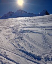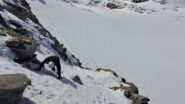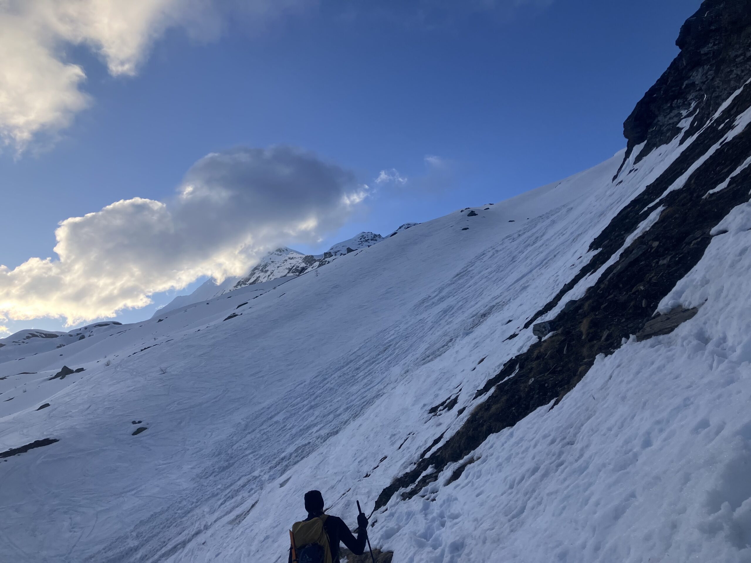 Aggirare la base della cresta e con un breve ma ripido traverso (prestare attenzione!) portarsi nel vallone che scende dall’Hommatau Gletscher.