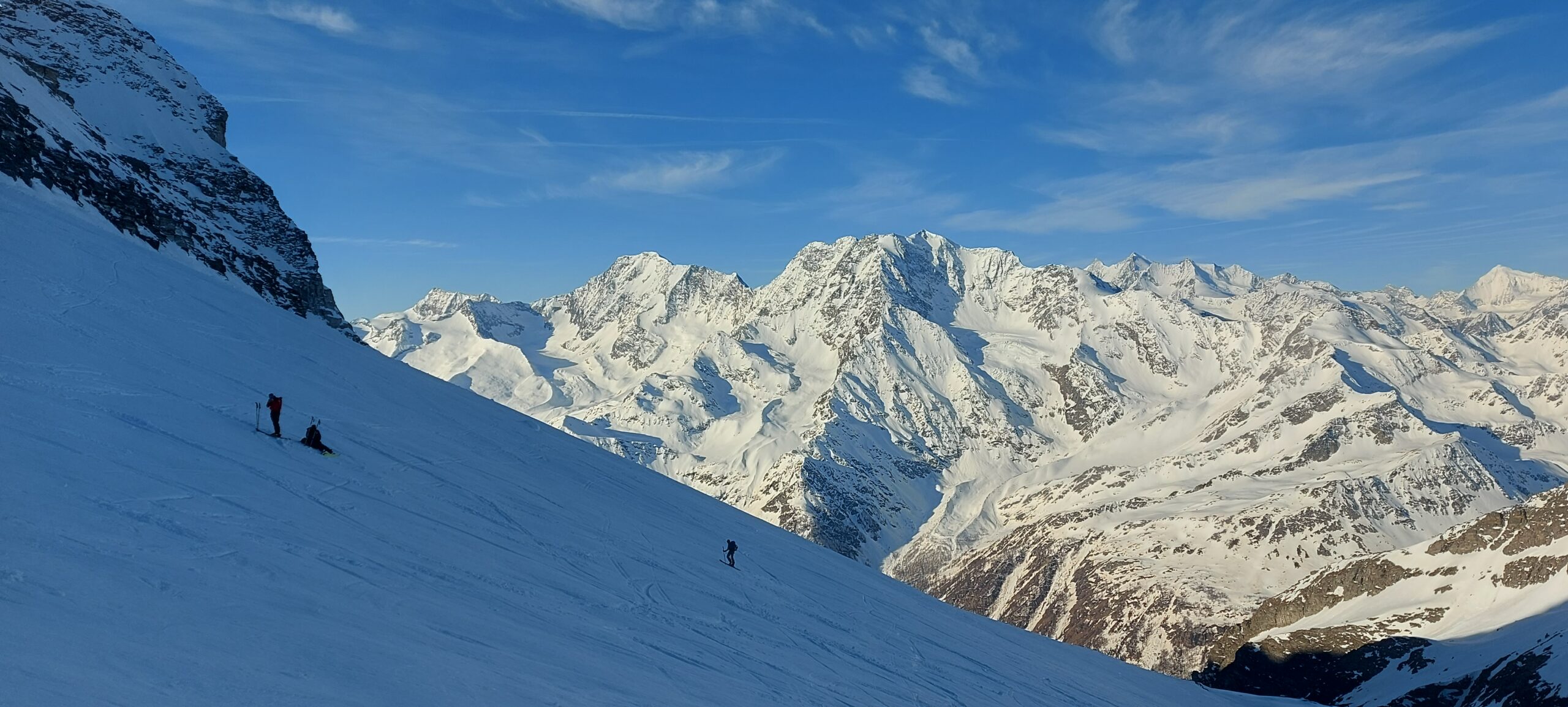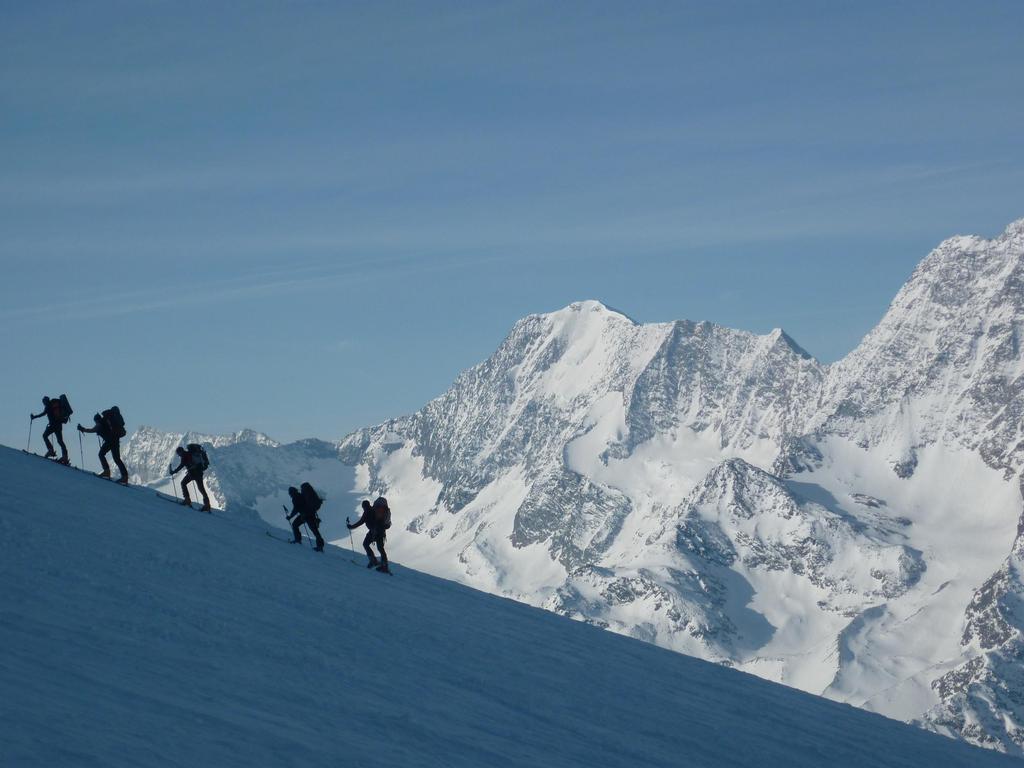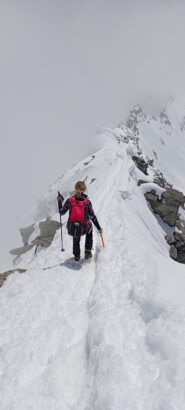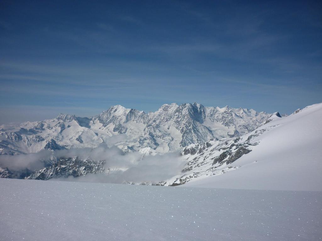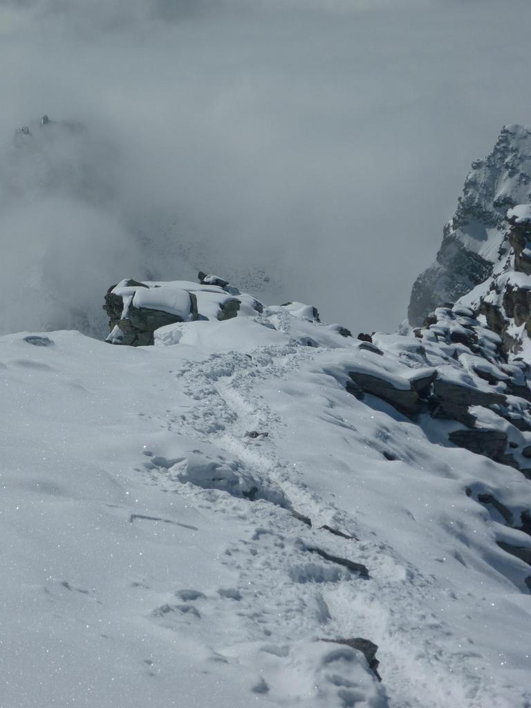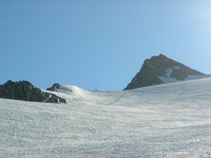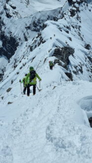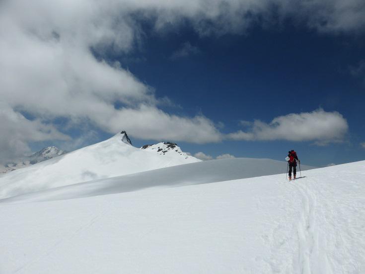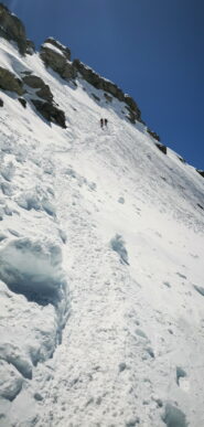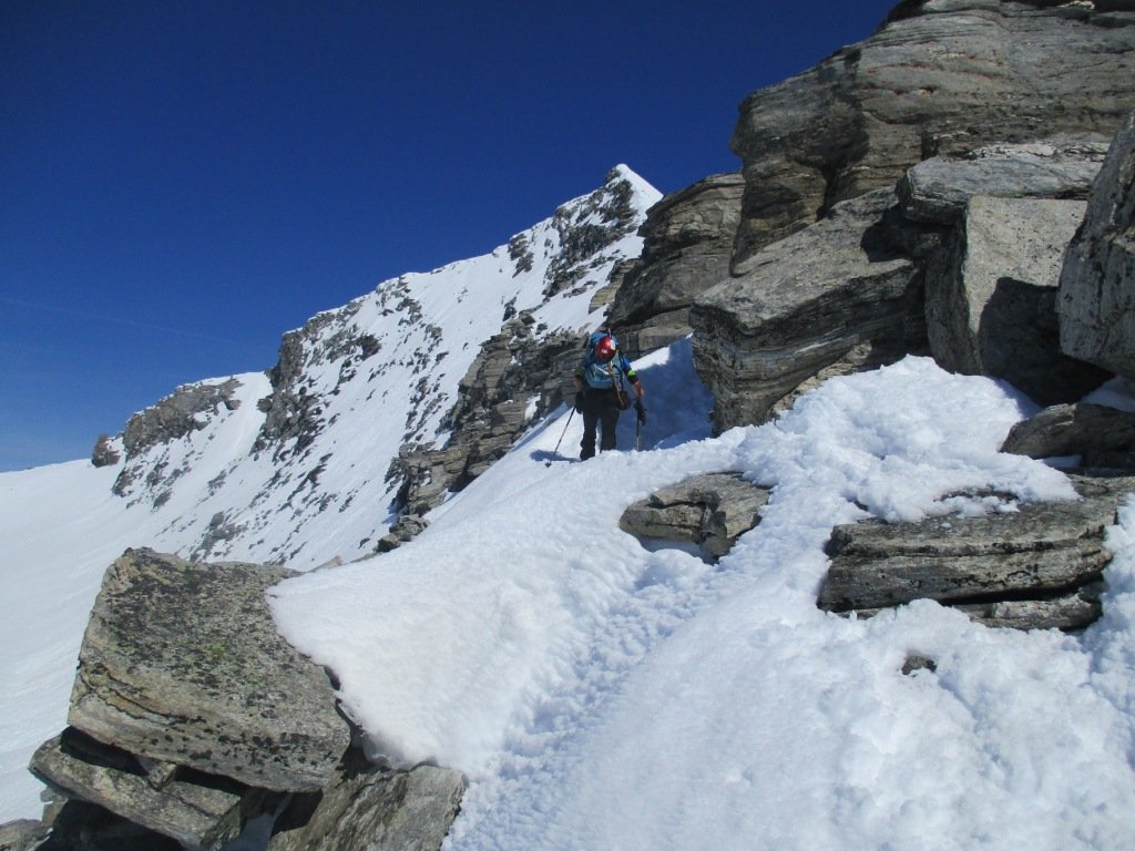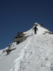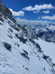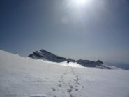 Proseguire superando un breve ripido pendio e rimontare poi la fronte del ghiacciaio, che si percorre sino al Colle del Breithorn (3372 m).