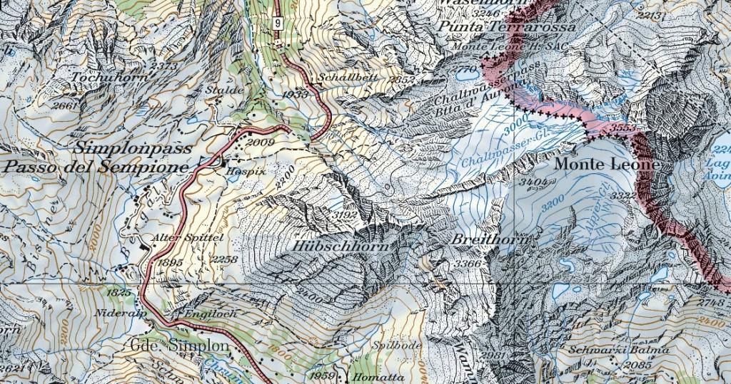 Dall’Ospizio del Sempione (2005 m), risalire senza percorso obbligato i pendii che in direzione E portano alla base della cresta NW dell’Hübschorn a quota 2363 nei pressi di un caratteristico masso.