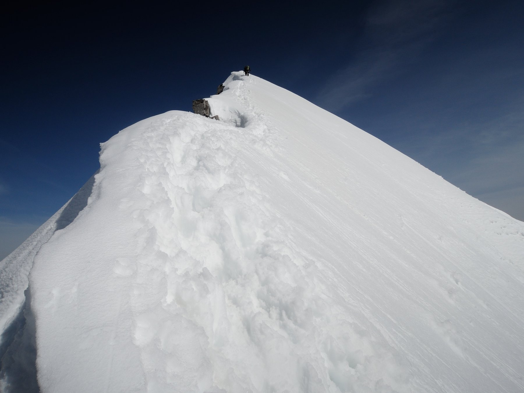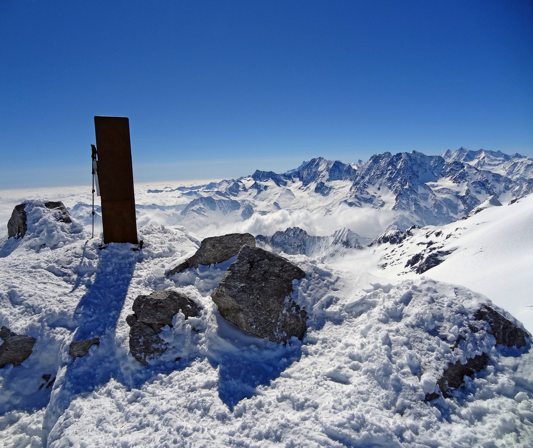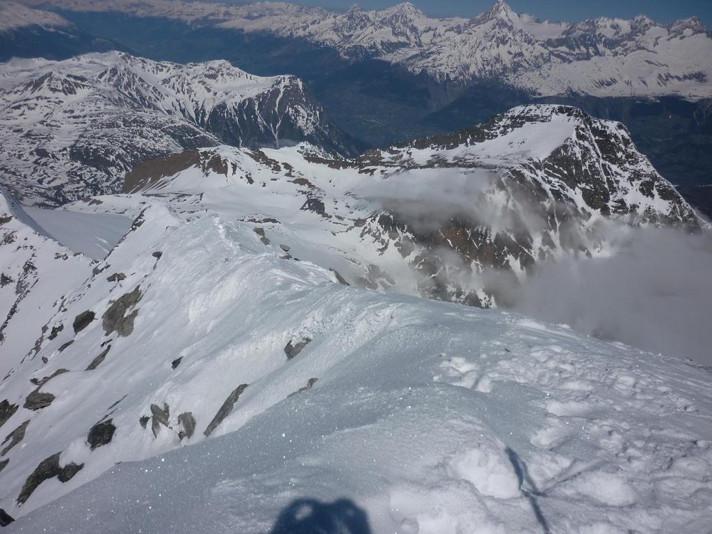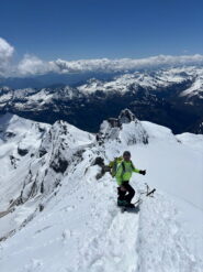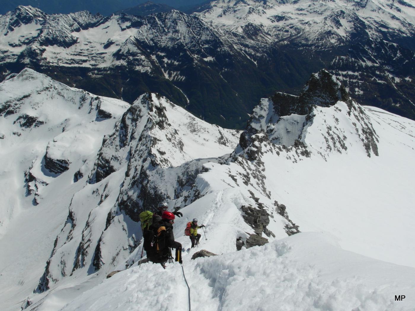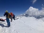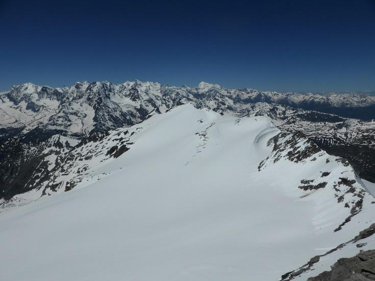 Dalla vetta con percorso a ritroso si ritorna al Colle del Breithorn (100 m di dislivello positivo).