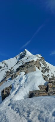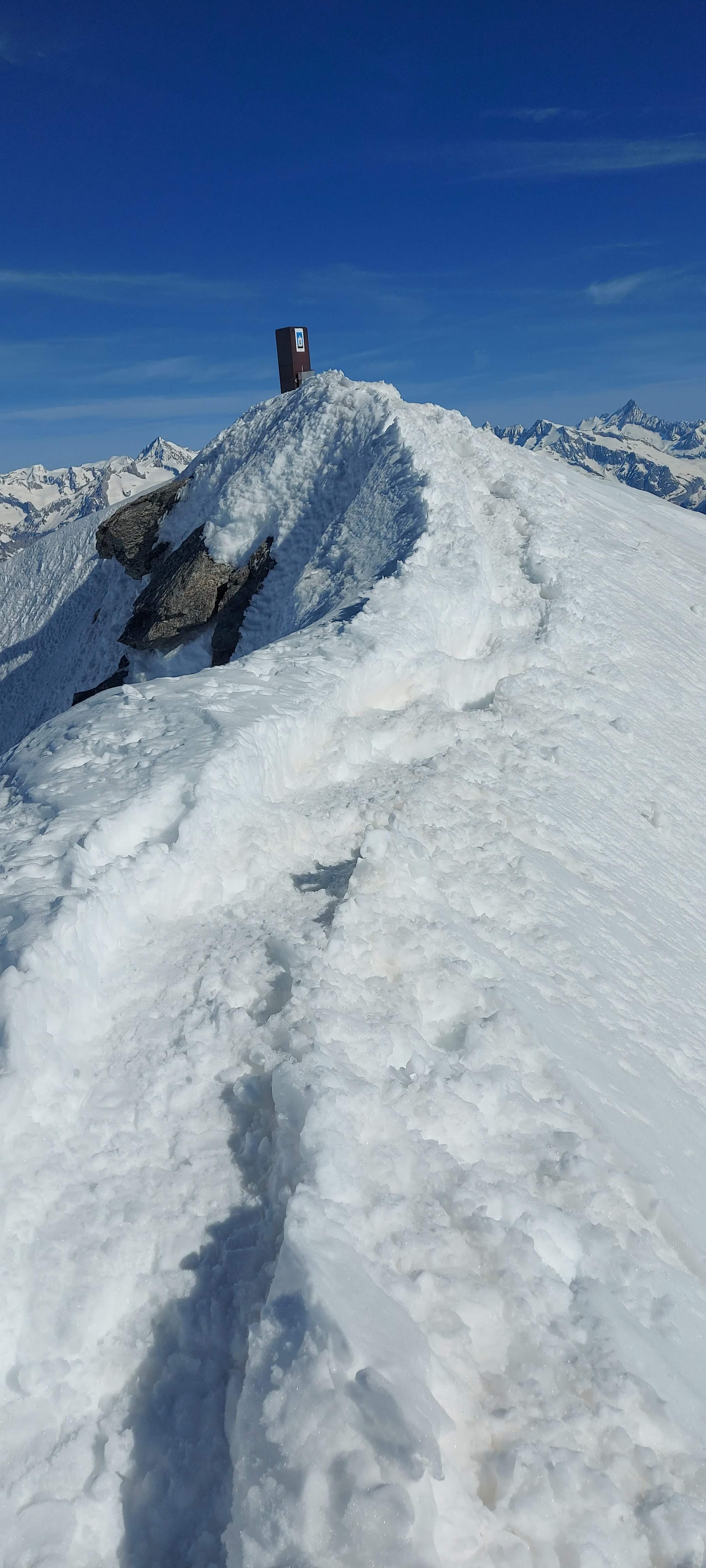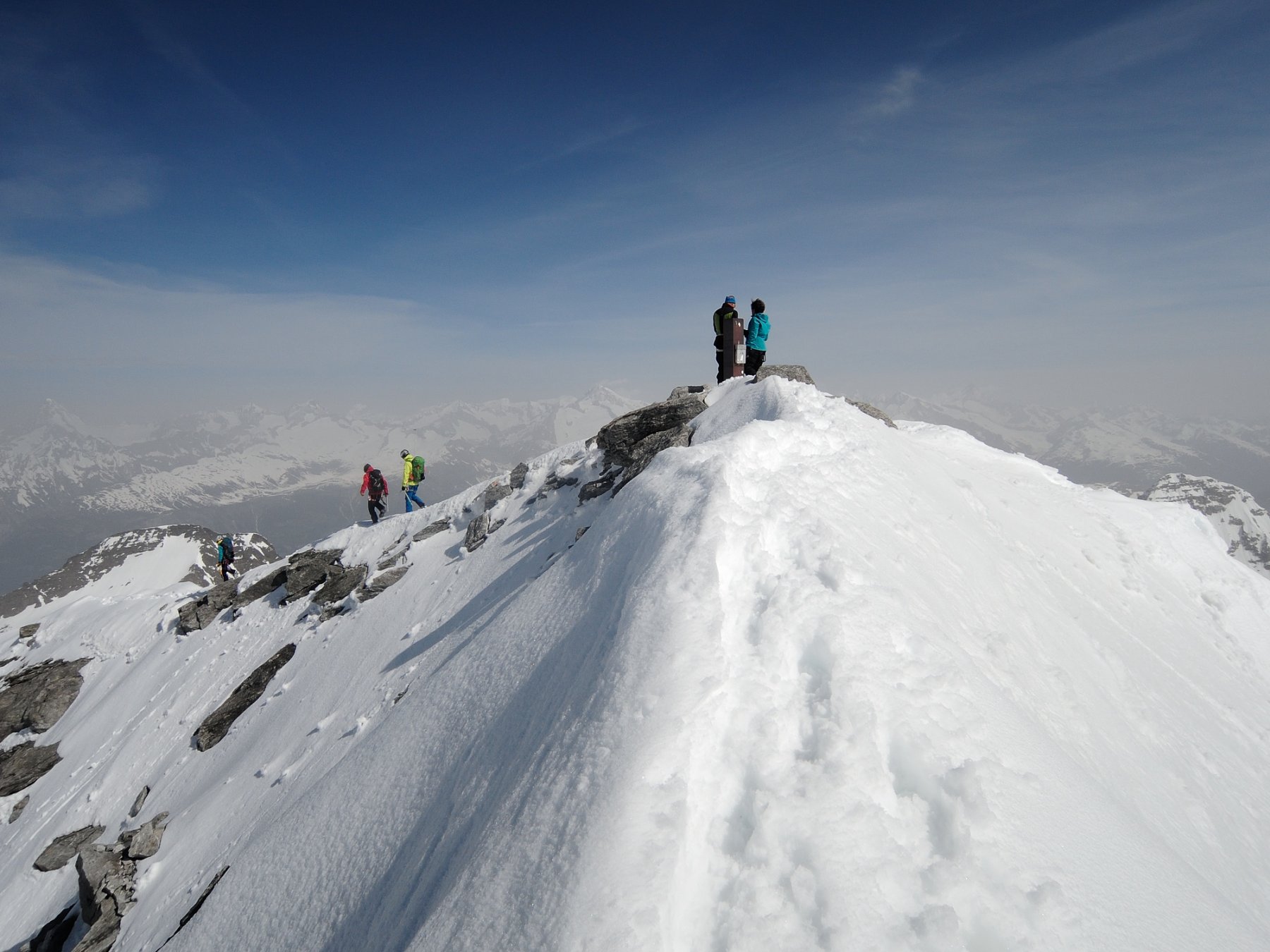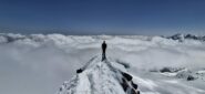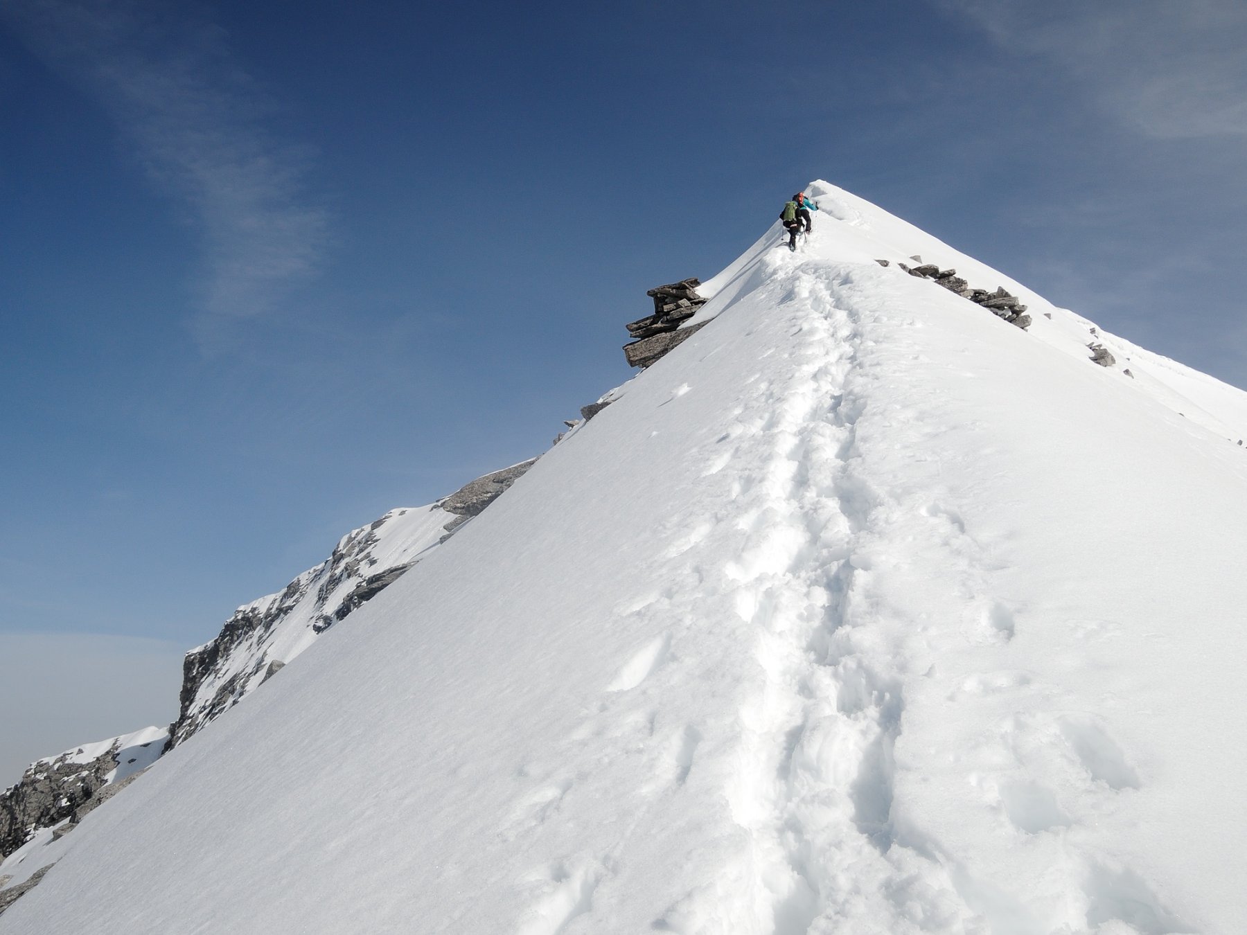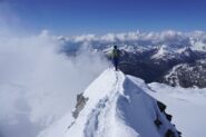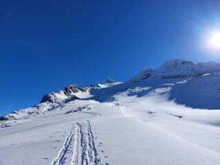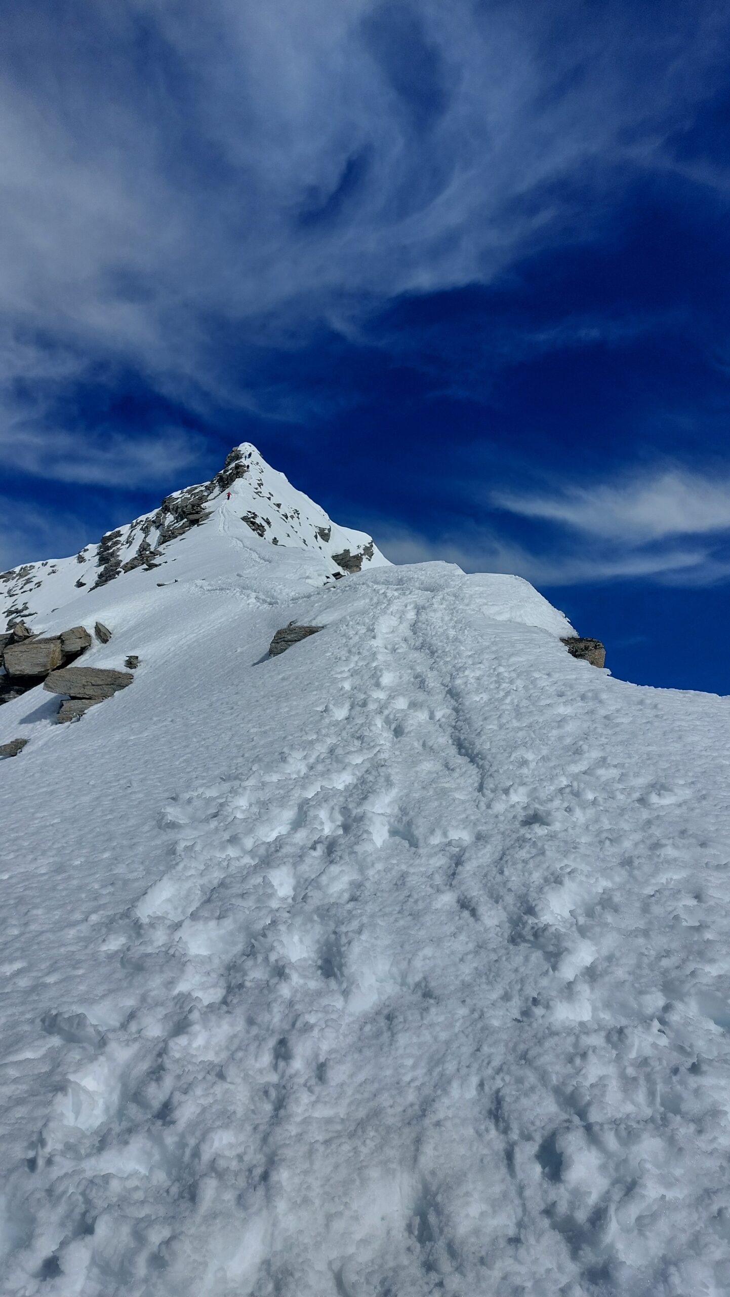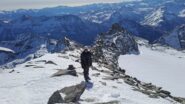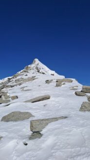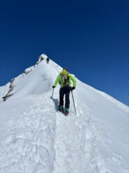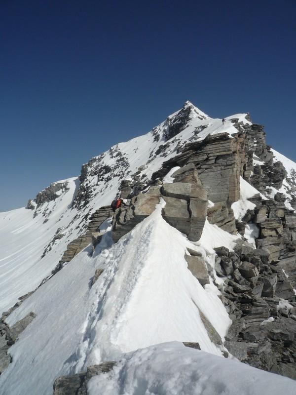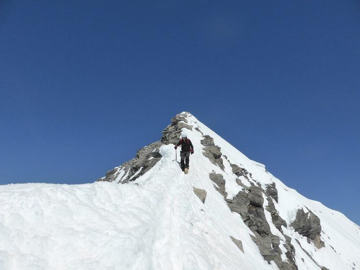 Abbandonati gli sci si risale un breve pendio nevoso sino alla cresta, che nel periodo primaverile si presenta interamente nevosa, percorrendo la quale si raggiunge la vetta.