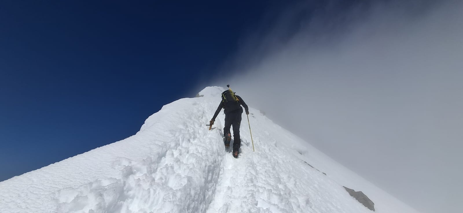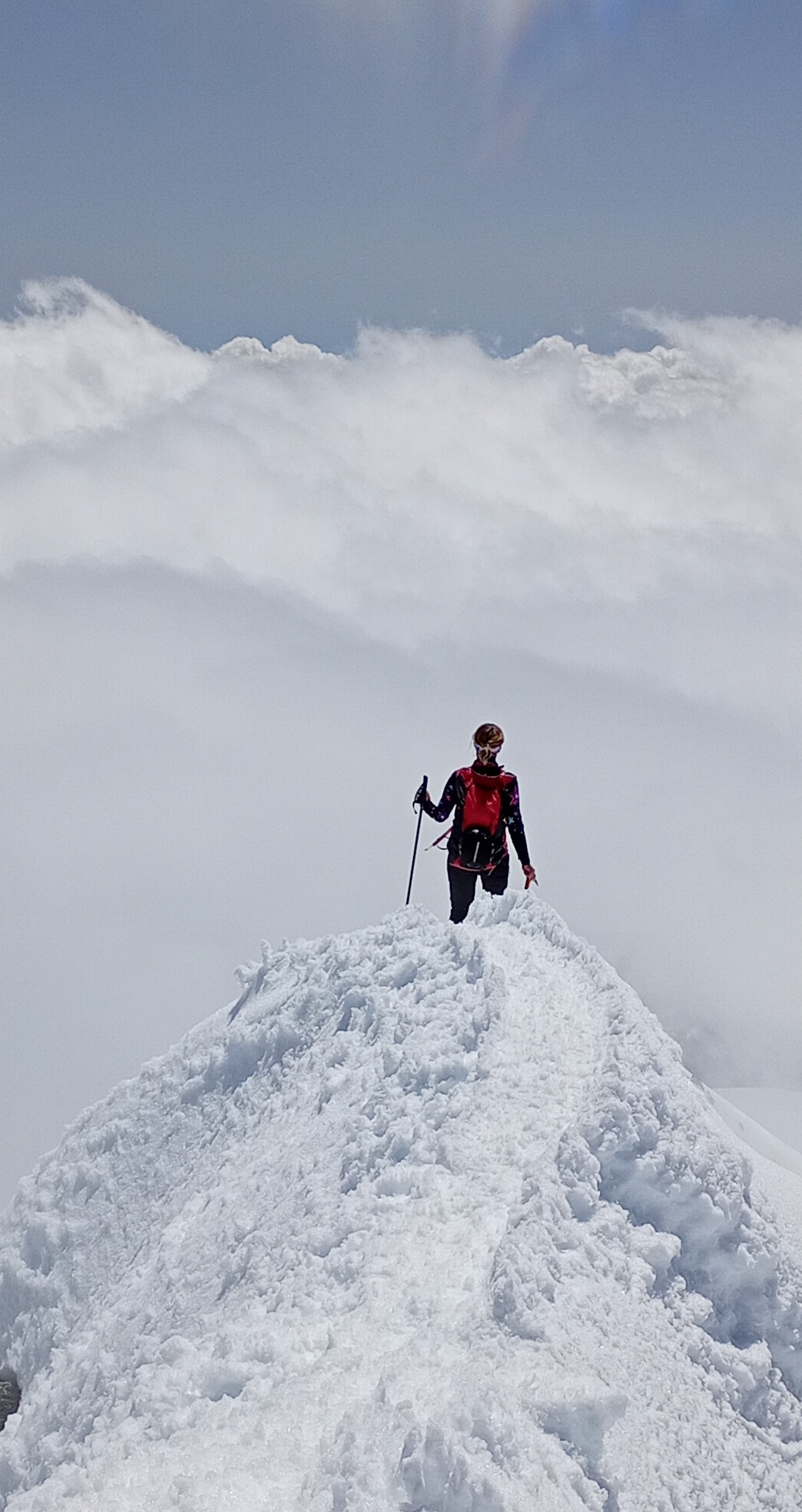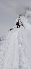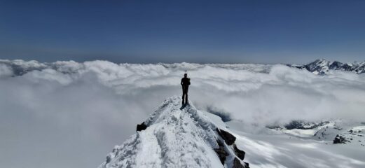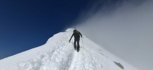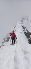 Attacchiamo poi la cresta che è ben tracciata e solida, anche il solito punto più esposto a 3/4 di cresta è in realtà abbastanza facile con le nubi che iniziano a pettinare la cresta senza togliere visibilità.