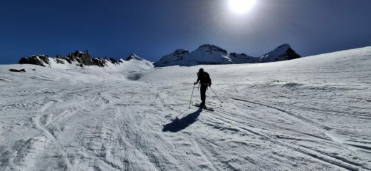 Arriviamo al colle senza problemi e, dopo qualche titubanza, iniziamo ad addentrarci nella conca glaciale fino al punto dove si lasciano gli sci.
