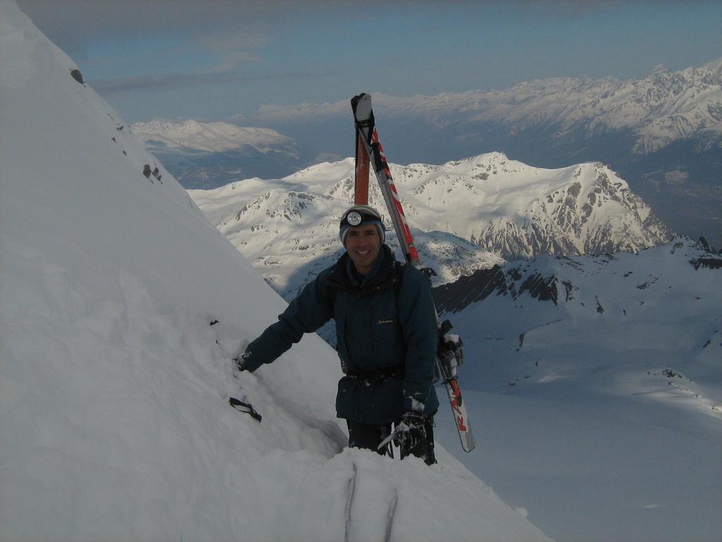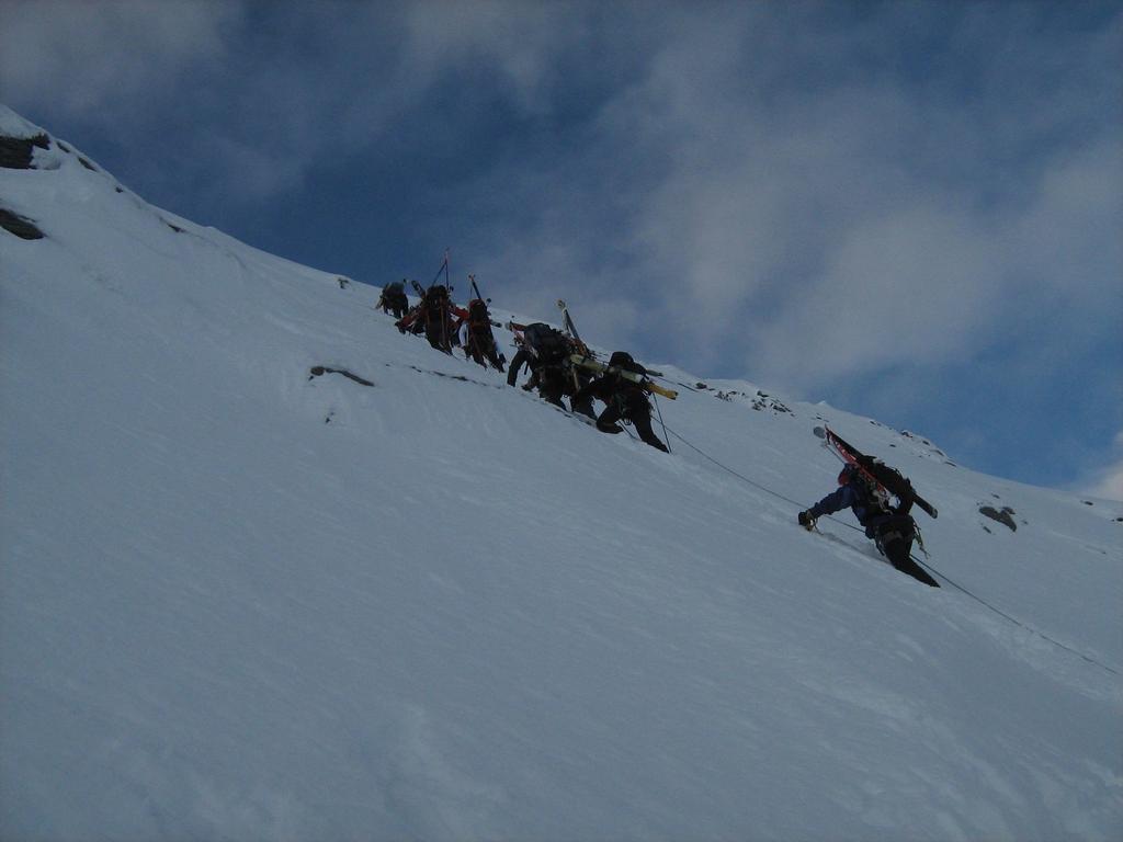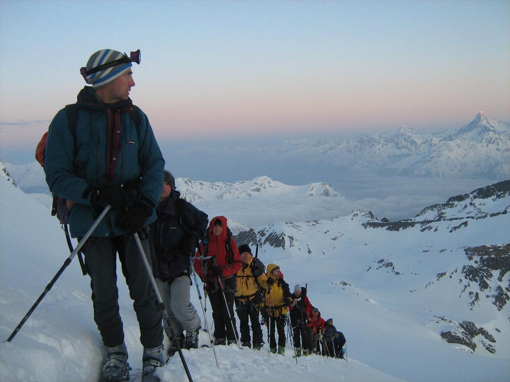 L’ottimo comportamento degli allievi ha permesso il concatenamento delle due salite tecniche (paretina, cresta), in tempi accettabili, per decidere di imboccare il basso bacino dell’Alpjerglestscher ed esplorare la lunga discesa verso Gaby. Una breve sosta ristoratrice nella bella conca di Inri Alpa, per poi proseguire sulle insperate lingue di neve continua che ci permettono di arrivare sci ai piedi sulla strada del Sempione.