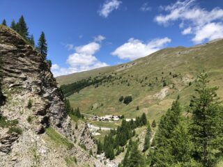 Si scende su terreni più ripidi verso il vallone che adduce al Col de Peas. Si piega a sinistra e si scende al villaggio di Les Fonts, dove si trova un alberghetto.