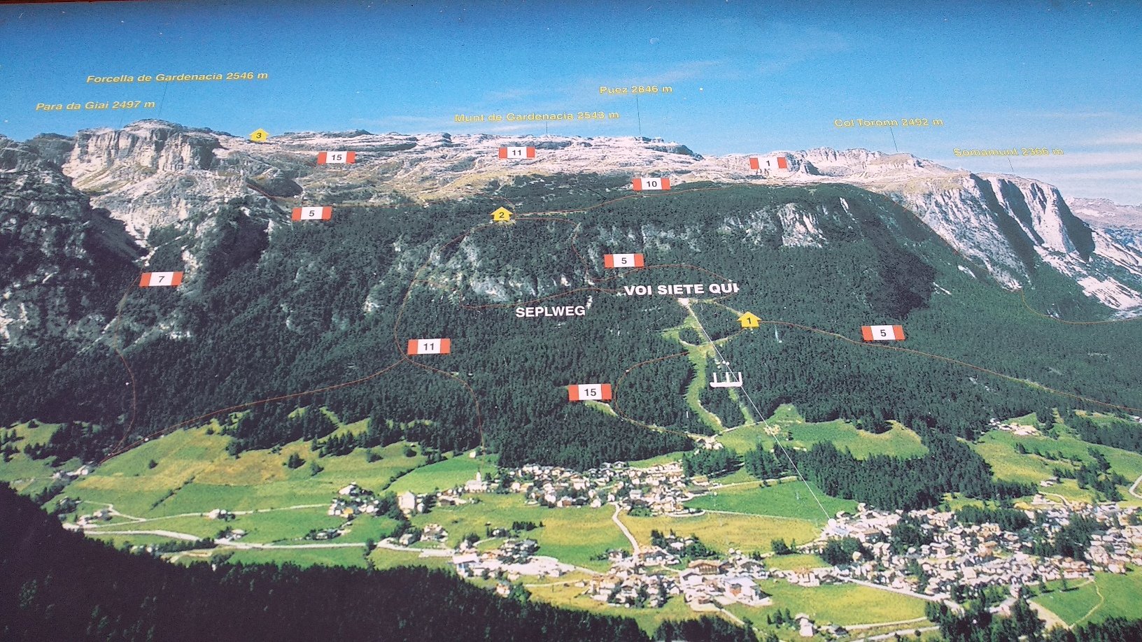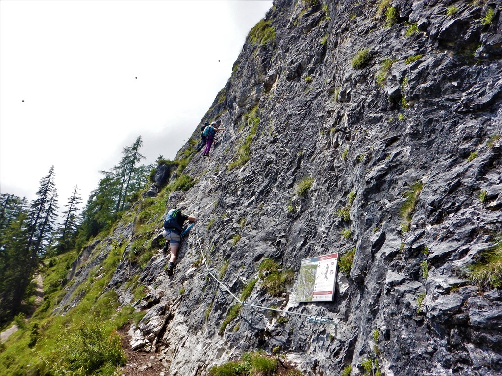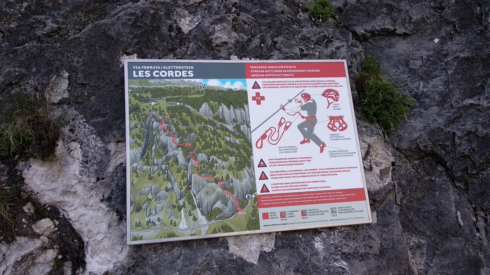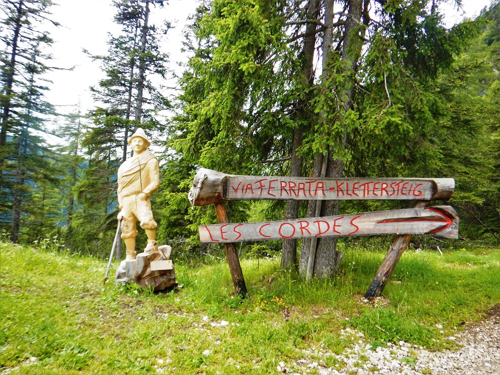 Dall’arrivo della seggiovia a 1780 m girare a sx e seguire il sentiero pianeggiante che si inoltra nel boschetto. Qui sono state posizionate un paio di sculture in legno. I cavi della ferrata partono direttamente dal sentiero con un primo risalto verticale.