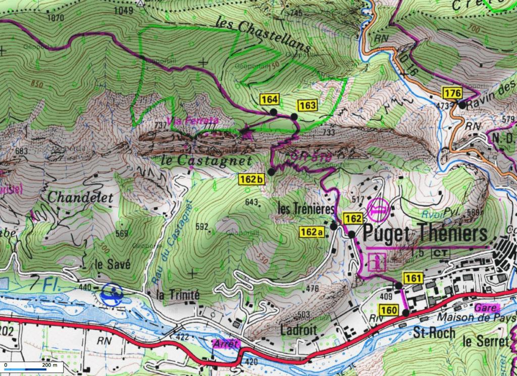 Arrivati a Puget e dopo la Maison citata, continuare in auto, prima di attraversare i binari della ferrovia, prendere a destra la strada dello stadio e continuare in riva al fiume fino al parcheggio appena dopo una casetta. A destra una sterrata con sbarra ci porta all’attacco in circa 15 minuti.
