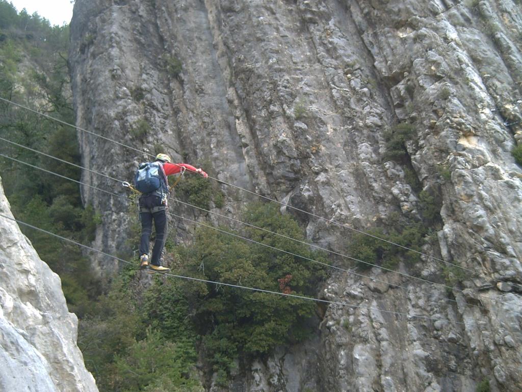 Una cresta aerea porta ad un camino che sbuca sulla cima della prima guglia. Subito dopo ecco il ponte delle scimmie e si procede sui 150 metri di vuoto sotto di noi.
