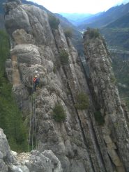 Si arrampica a sinistra della cascata su una placca aerea fino alla cima della cascata dove si incontra “il giardino mediterraneo sospeso” e si sale al ponte himalaiano che porta al pilastro della prima guglia. Il magnifico pilastro molto aereo si fa sempre più sottile.