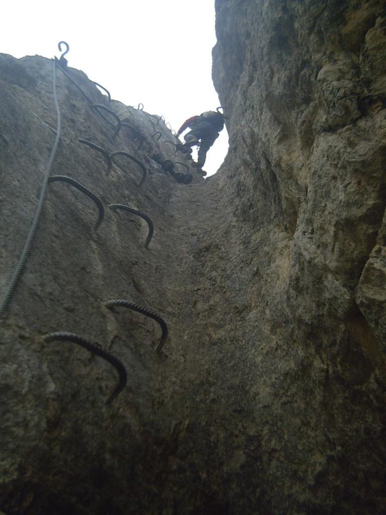 Se l’idea non vi piace sappiate che c’è una scappatoia. Si risale la seconda guglia in verticale (facile) o passando a sinistra della stessa con passaggi decisamente più atletici e strapiombanti (i piccoletti è meglio che si astengano dal farlo perchè gli scalini sono mooolto distanziati e avrebbero dei seri problemi).
