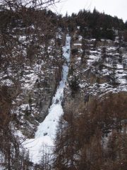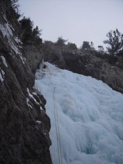 (6-1-2011) Salita davvero spettacolare…Sconsigliabile la discesa in corda doppia, le soste attrezzate sono inaffidabili, e quelle più nuove, subito vicine, sono tutte da attrezzare (2 fix da collegare): usciti dalla cascata, seguire le tracce a destra (faccia a monte)fino a reperire il sentiero di discesa…attenzione a valutare il manto nevoso, si attraversano diversi canali ripidi!