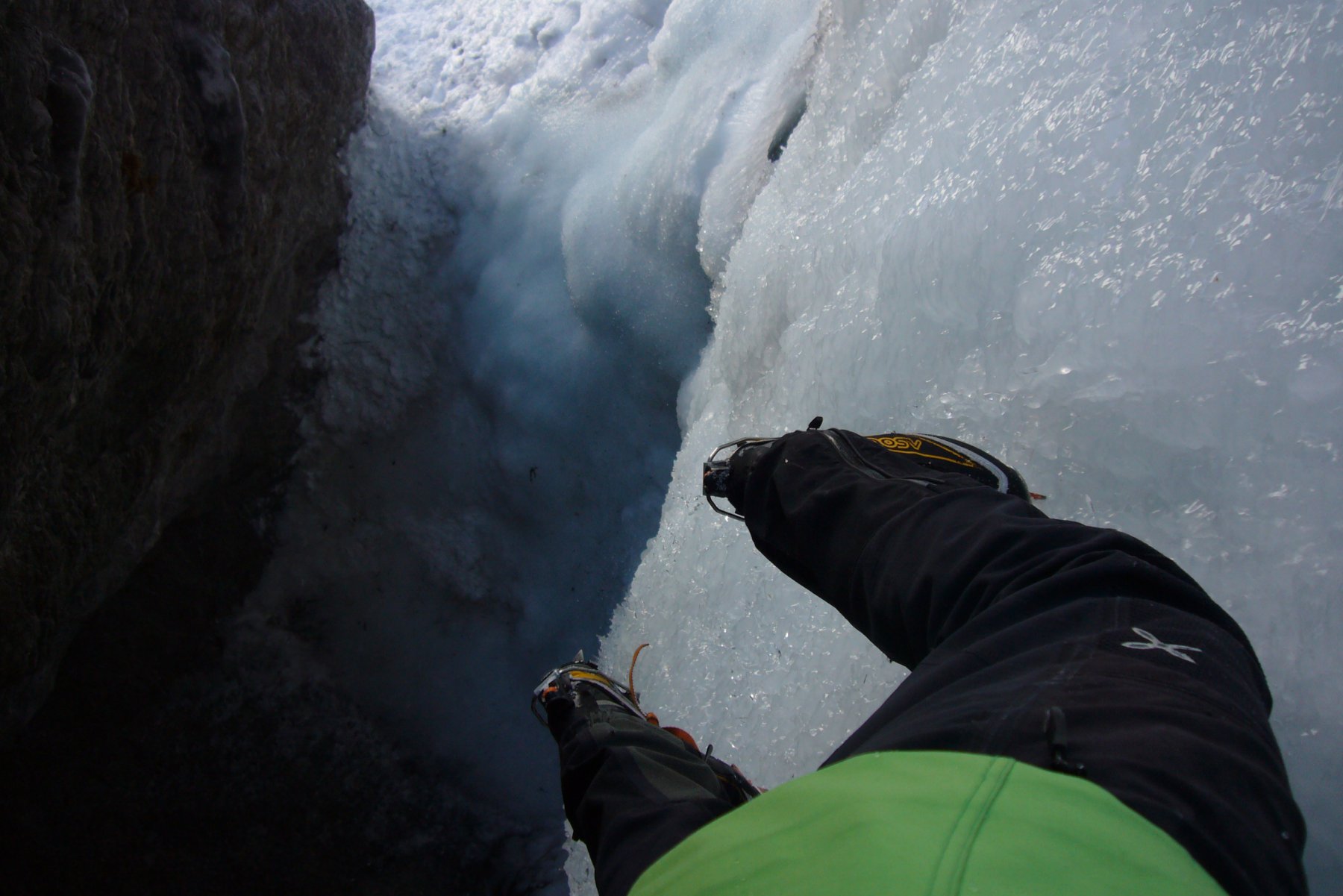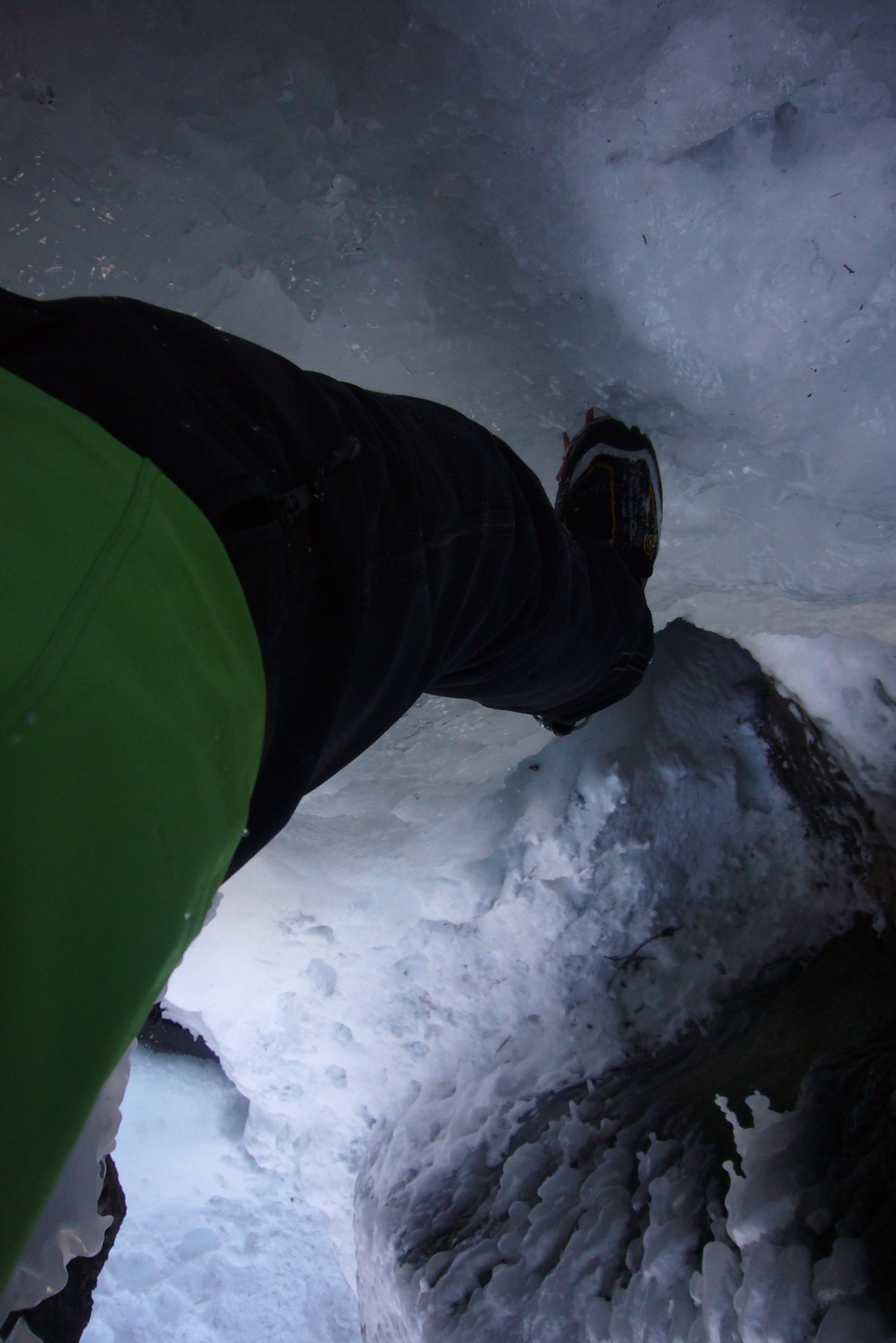 La grotte passage en rive gauche sur une coulée de glace au top.