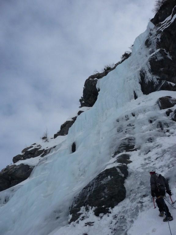 La salita è lunga, varia e presenta un ultimo tiro bello tosto e verticale ma bello segnato dai passaggi. Purtroppo molte cordate davanti e il ghiaccio sfiorato e preso addosso è stato tanto.