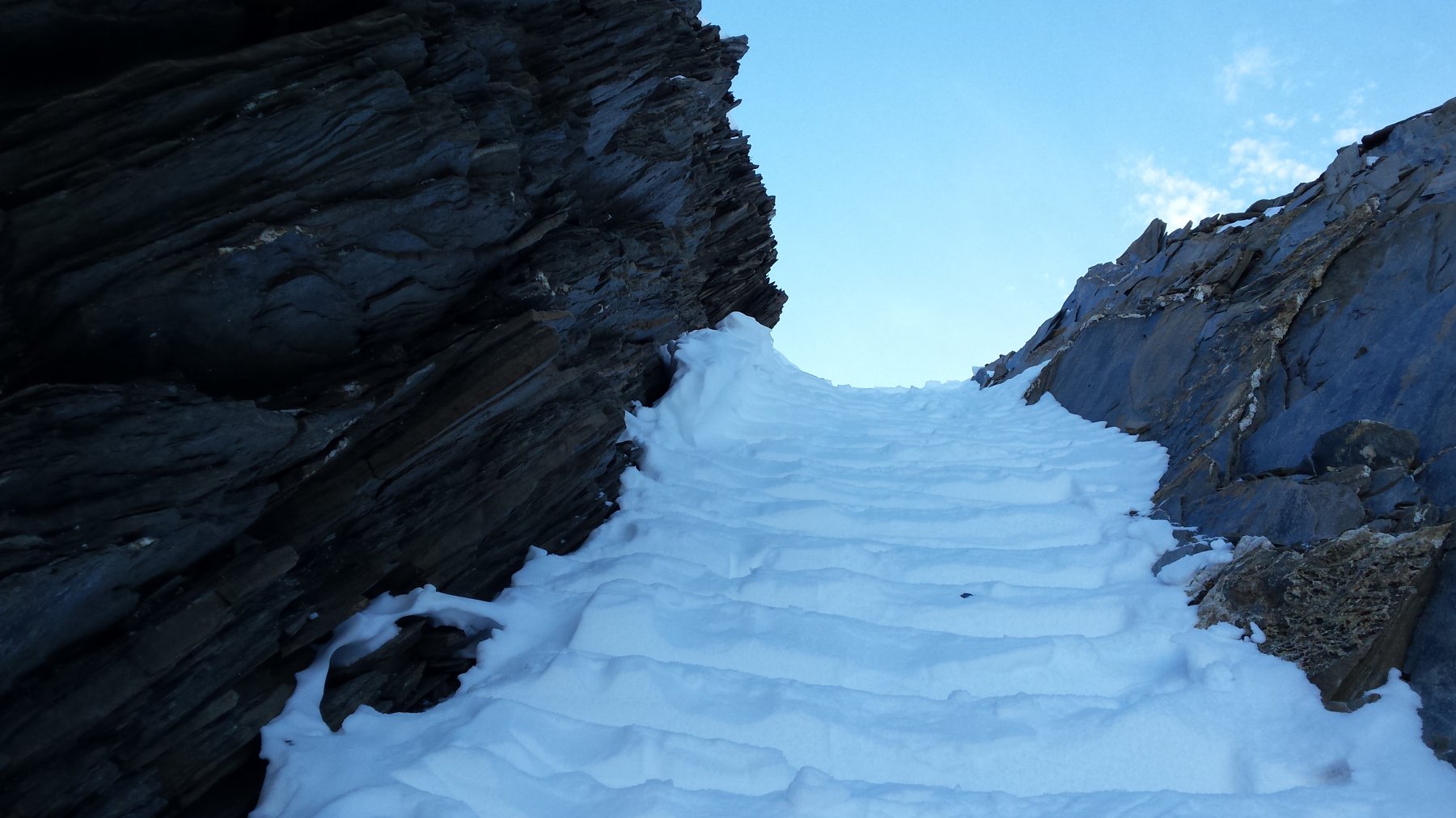 Sono salito nel pomeriggio pensando di fare la sauna; invece ho trovato vento fastidioso che ha tenuto in temperatura la neve. In salita sono passato dalla “normale”: ci sono diverse pietre semi-sepolte. L’ingresso del canale, quest’anno, è molto stretto a causa della poca neve. I primi metri li ho scesi a scaletta con sci lunghi 1,70 mt…se erano poco più lunghi mi sarei incastrato.