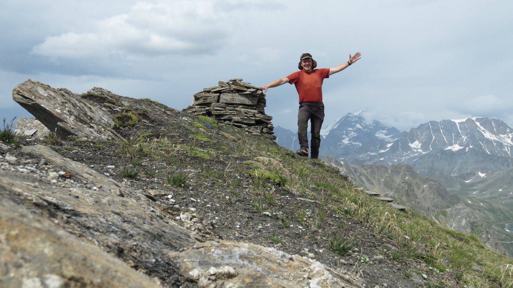 Partito dal piccolo parcheggio di quota 2091 m dove ha inizio la sterrata che porta agli Alpeggi Pra di Farco, con cielo velato, ma con spazi di cielo azzurro e sole, molto caldo anche oggi. Risalita in breve la sterrata e raggiunto l’alpeggio, ho seguito per un tratto il sentiero con segnavia 12 e 12A fino ad un grande pianoro erboso, dove ho deviato a destra in vista delle rovine dell’Alpeggio Pra d’Arc, dove non c’è sentiero ma si va a vista senza problemi. Dall’alpeggio ho salito a destra un pendio erboso e detritico che mia ha portato alla base del grande e ripido canalone detritico da risalire. Io sono salito tenendomi inizialmente a destra salendo per pendii erbosi sempre ripidi, per riprendere la parte detritica a metà canale. Tutto sommato la risalita del canalone è stata meno faticosa di quello che immaginavo, ho trovato alcuni ometti nel canale, ma non vedevo dove usciva e dove traversava a sinistra. Ho lasciato a sinistra prima un ripido e incassato canalino (ero certo che non fosse quello descritto nella relazione che avevo in tasca!), poi un secondo canale, fino ad arrivare sotto una paretina rocciosa, solo all’ultimo si vede il passaggio giusto. Si tratta di una specie di valloncello sospeso e nascosto (invisibile dal basso!) dove ci sono alcuni ometti che aiutano a superare una fascia rocciosa (ma è più comodo aggirarla a sinistra, come ho fatto in discesa), poi un bel nevaietto da risalire, dove sono passato bene su neve abbastanza compatta nonostante il caldo. Raggiunto il colletto, io sono salito lungo il filo di cresta, e i passaggi sulle placche sono abbastanza esposti e nel primo tratto di cresta per nulla banali come già avevano scritto i precedenti salitori (il filo di cresta a mio avviso è più F che non EE). Arrivato in cima in ore 2.20 dal parcheggio, oggi ho velocizzato un pò il mio passo abituale, in primo luogo perchè partito in ritardo da casa mia (io sono di Genova) e poi per il possibile peggioramento meteo pomeridiano (che non si è verificato). Mi sono concesso circa 45 minuti di sosta in cima per ammirare il panorama (pur essendo abbastanza nuvoloso la visuale è rimasta spettacolare!) e poi sono sceso, tenendo sempre il filo di cresta in discesa, ma una volta arrivato al colletto, ho notato una sorta di canalino roccioso e alcune cenge che solcano la paretina che potrebbero essere delle varianti da seguire, sia per salire che per scendere. In discesa il canalone detritico è stato agevole e in poco tempo sono arrivato alla conoide basale. Una tranquilla camminata su pendii erbosi, praterie e stradina mi ha riportato al parcheggio. Soddisfatto della scelta fatta e della mia gita, era una possibile soluzione che da tempo mi tenevo a disposizione per fare qualcosa quando avevo solo 1 giorno a disposizione…e ho tirato fuori la carta dal mazzo e me la sono giocata bene direi.