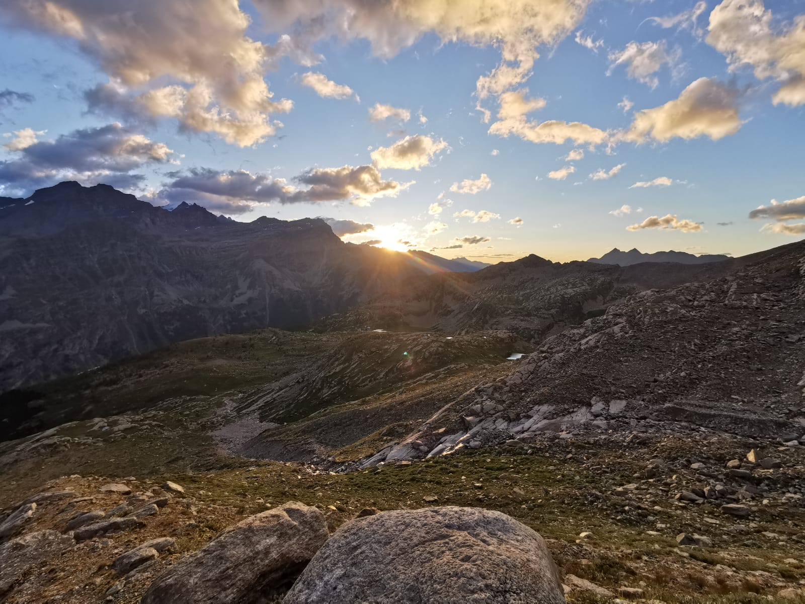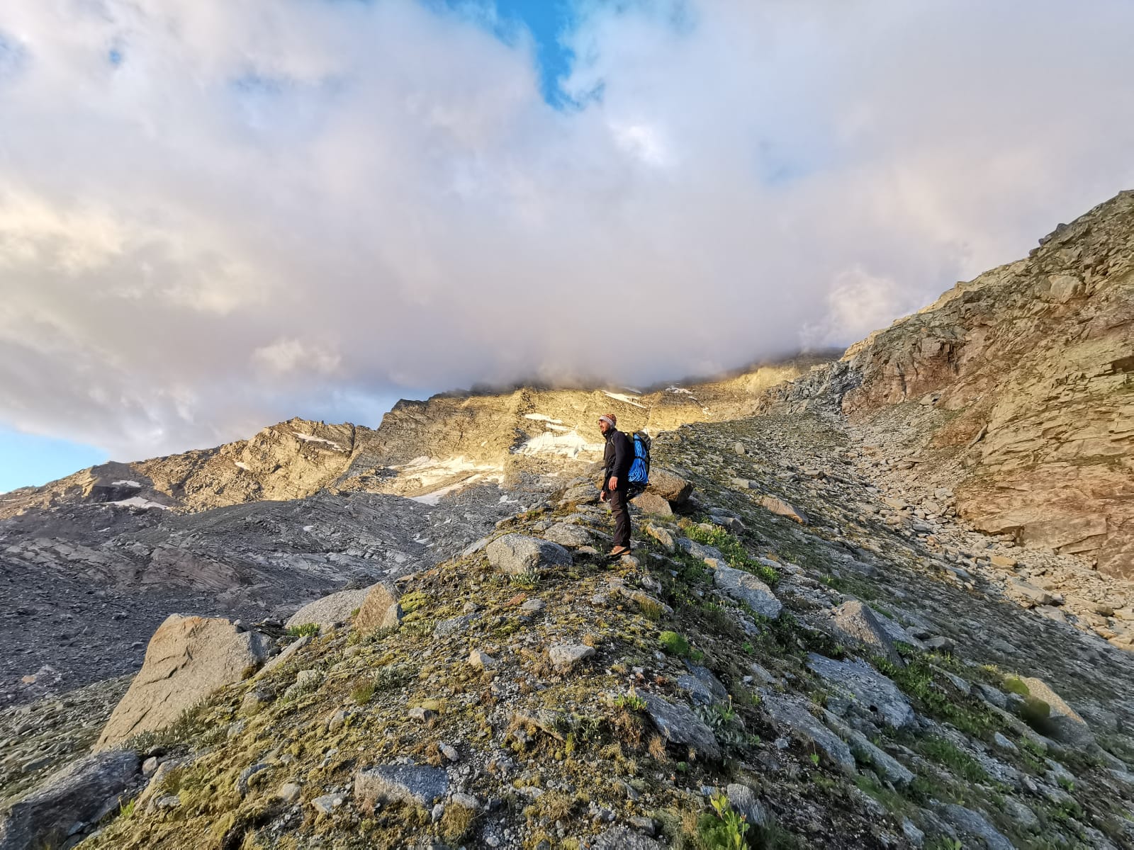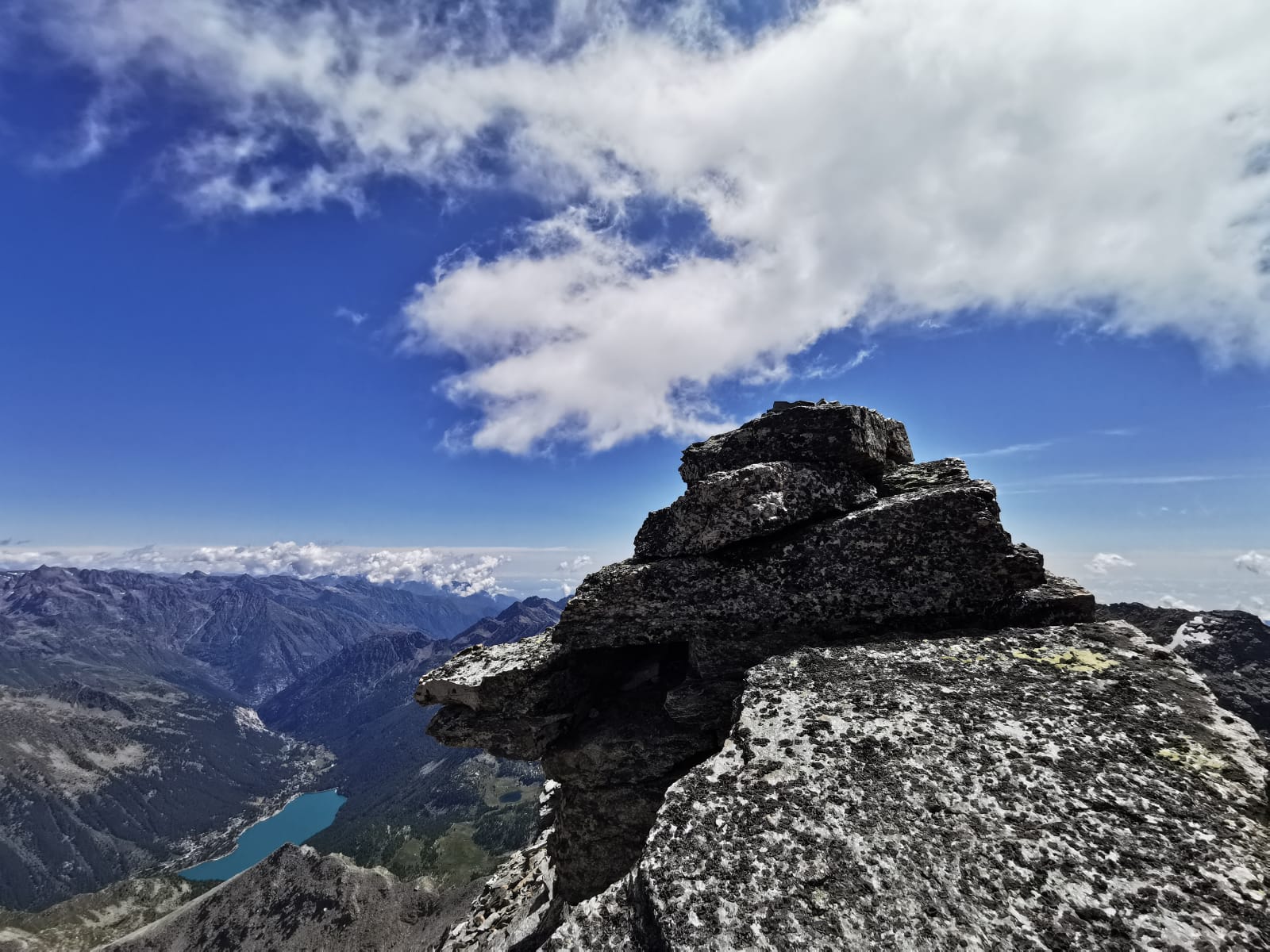 - Scendere seguendo l’itinerario della spalla SO (pietraia molto instabile, prestare attenzione) fino a dove si riesce a traversare verso O in direzione del Col des Pariotes. Si può scendere nella conca sottostante per incontrare la traccia che scende dal colle oppure tagliare un sistema di cenge erbose e pietraie per portarsi poco sotto al colle senza perdere troppa quota. Dal Col de Pariotes, un altro ampissimo arco in leggera discesa permette di intersecare il sentiero che sale dal Refuge du Carrò al Colle del Carro. Risaliti al Colle del Carro scendere sul versante italiano verso il Lago del Serrù e da qui nuovamente a Chiapili. Discesa lunghissima su terreno molto accidentato e molto poco tracciato, da affrontare solo se con buon meteo e in buone condizioni fisiche.