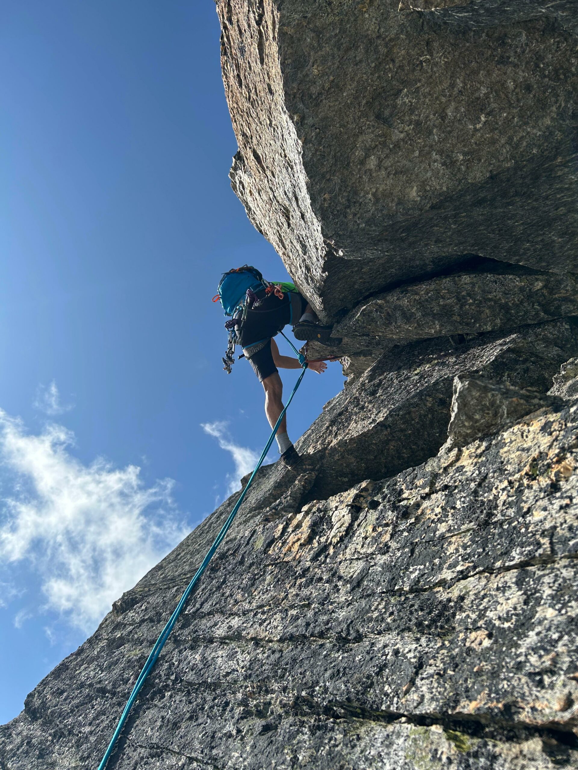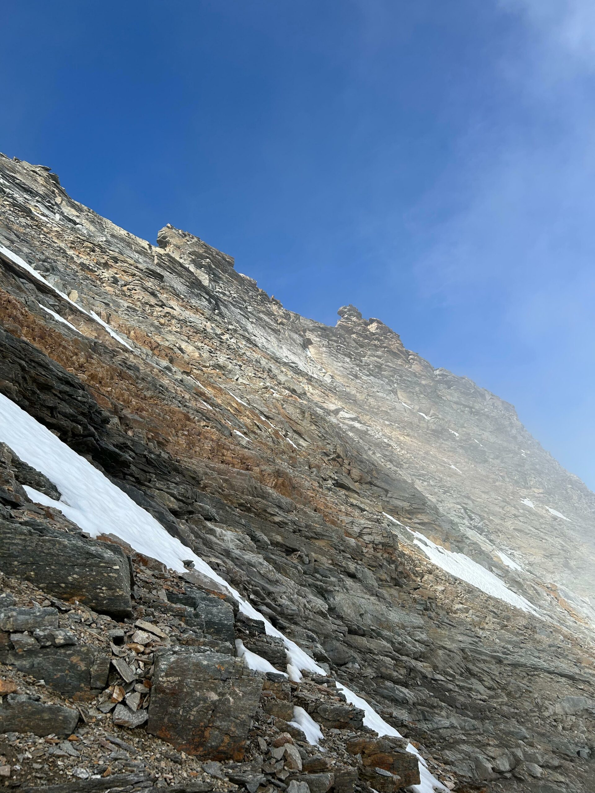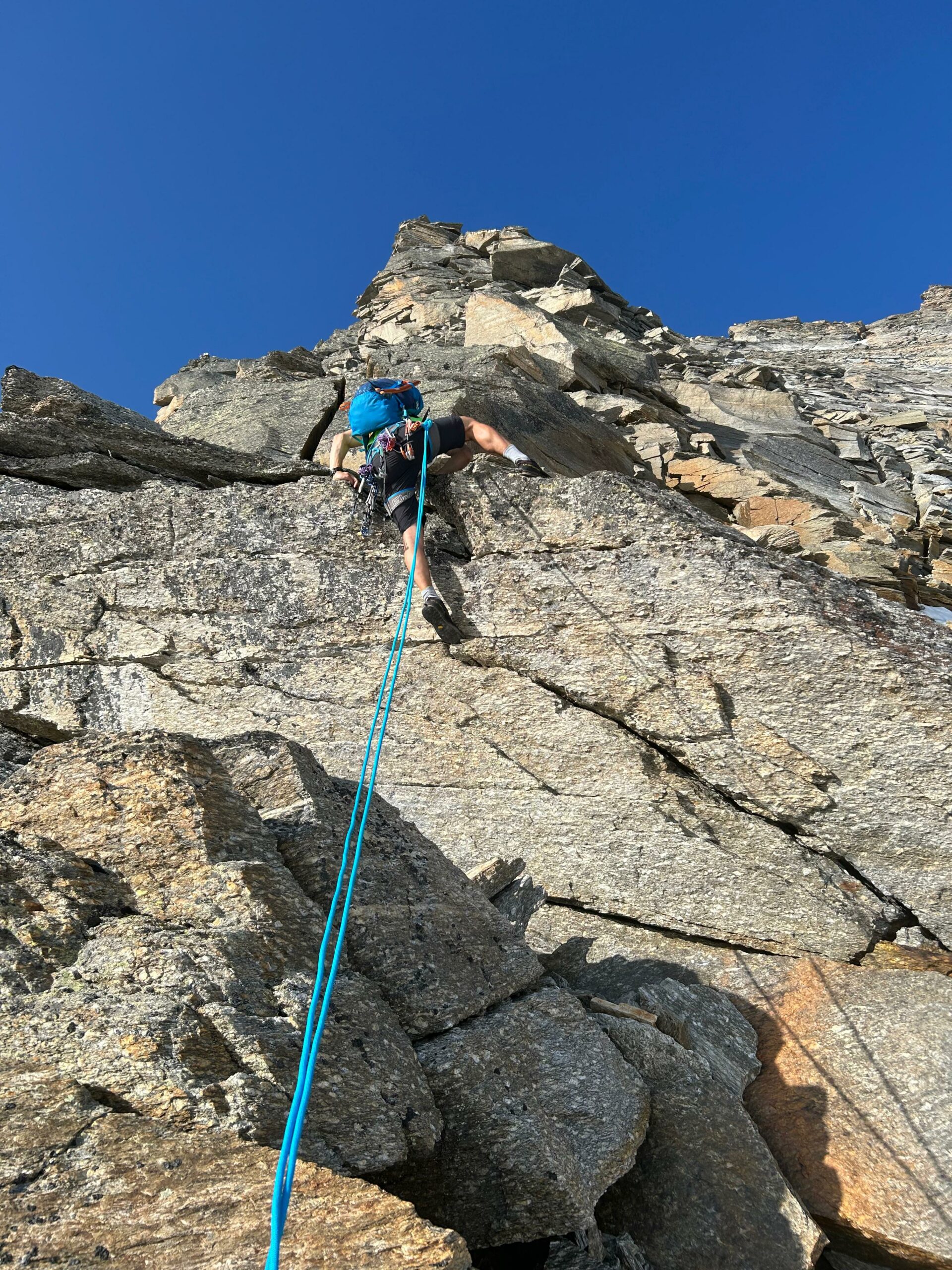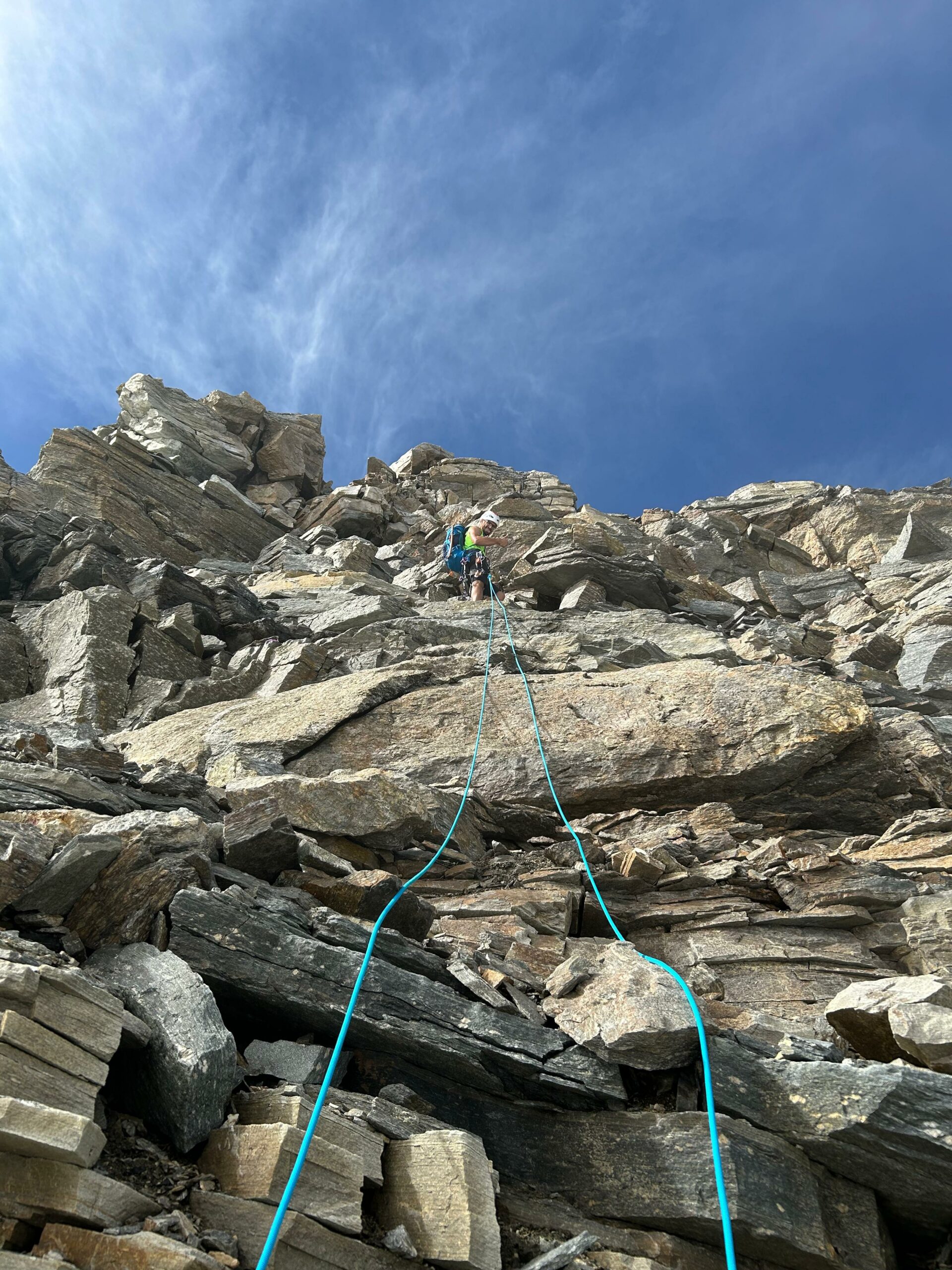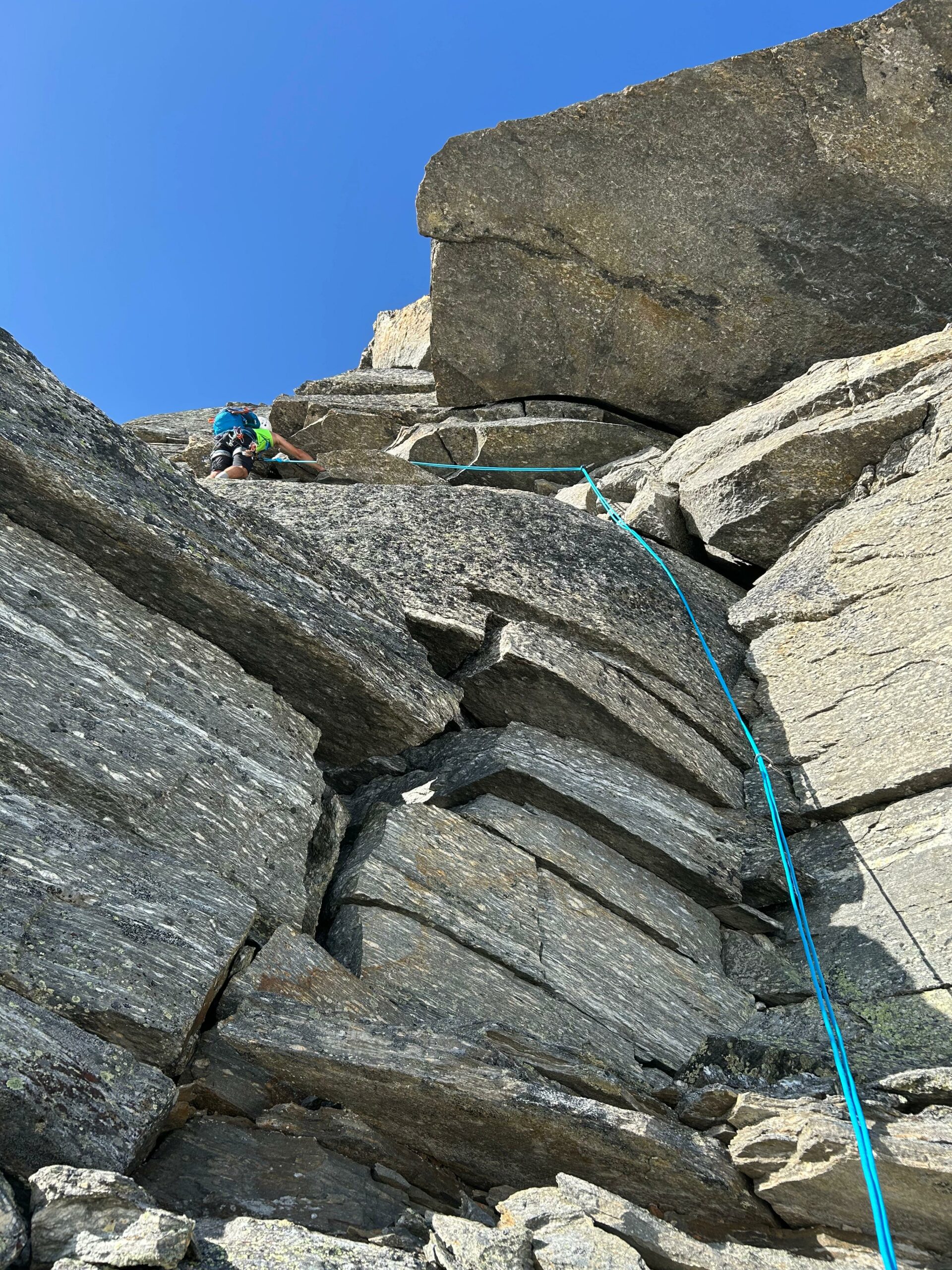 Seguire lo spigolo che nella prima parte è piuttosto appoggiato aggirando qualche grande macigno scegliendo uno dei due lati. Dopo il primo terzo il terreno si fa più sostenuto con passaggi di III, fino al IV+, quasi sempre aggirabili da destra (lato NO). Prestando molta attenzione alla roccia, scegliere i passaggi fino a raggiungere un tratto di roccia rossastra instabile dove la pendenza cala un po’. Da qui si vedono bene gli ultimi passaggi che portano in cresta poco a SE della cima principale. Prestare ancora attenzione all’ultimo passaggio per salire sul torrione finale (nut incastrato).