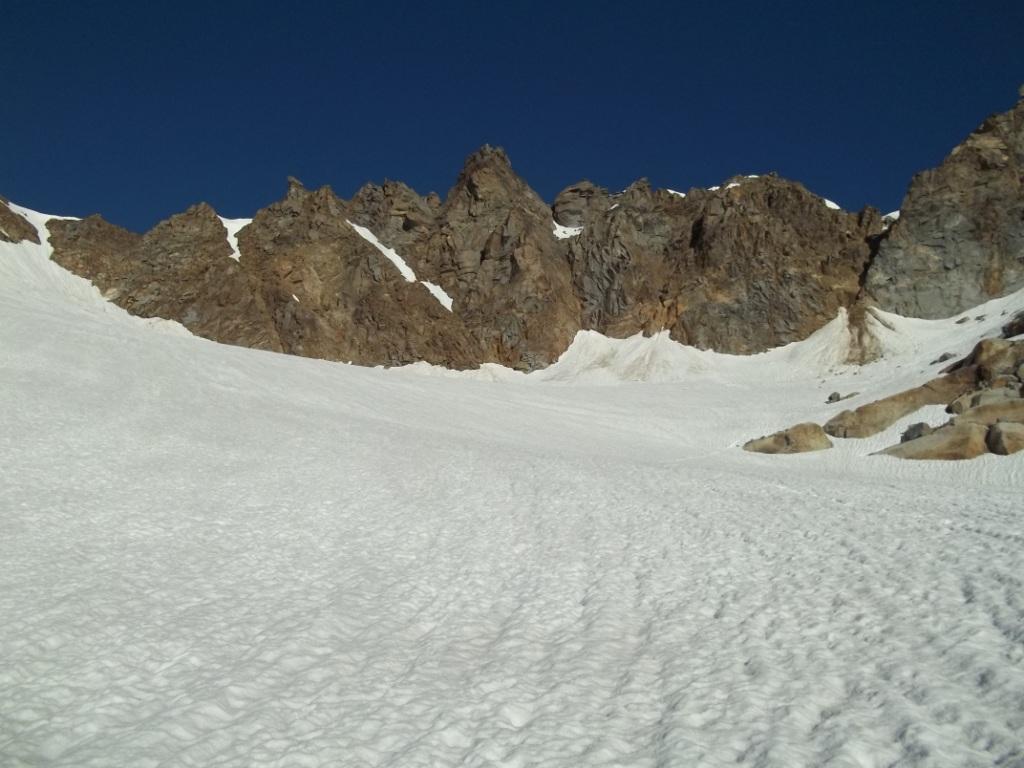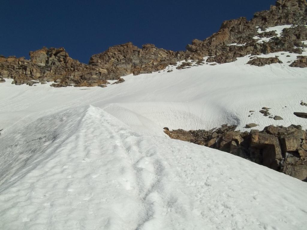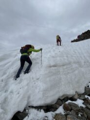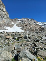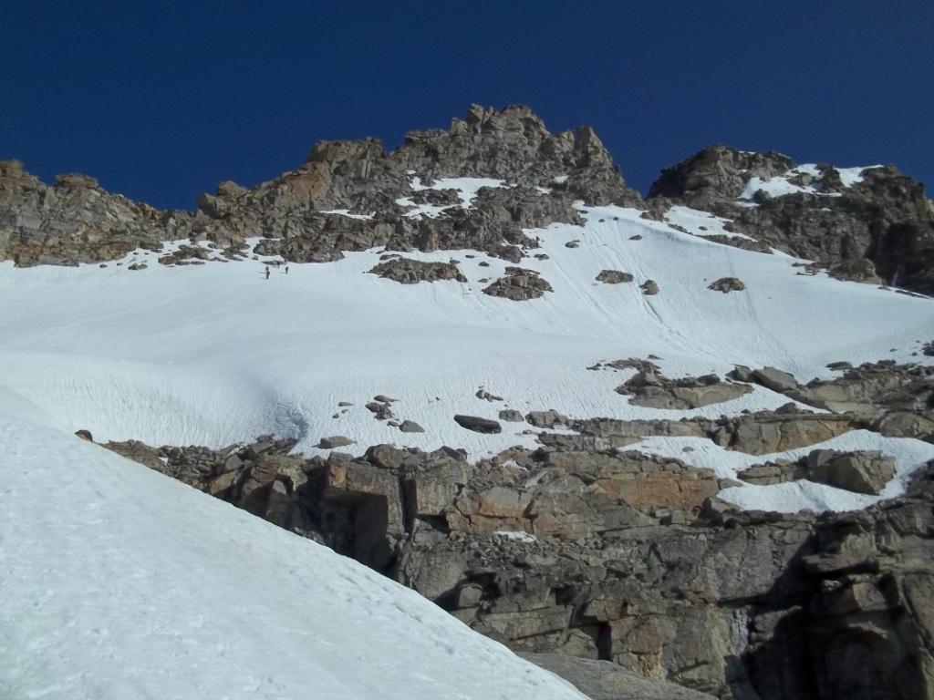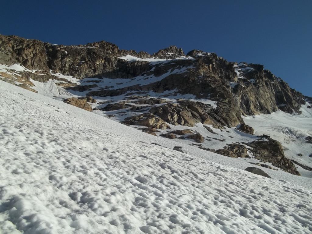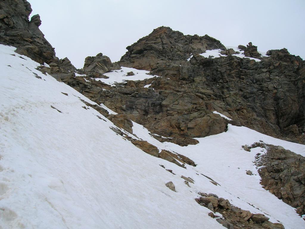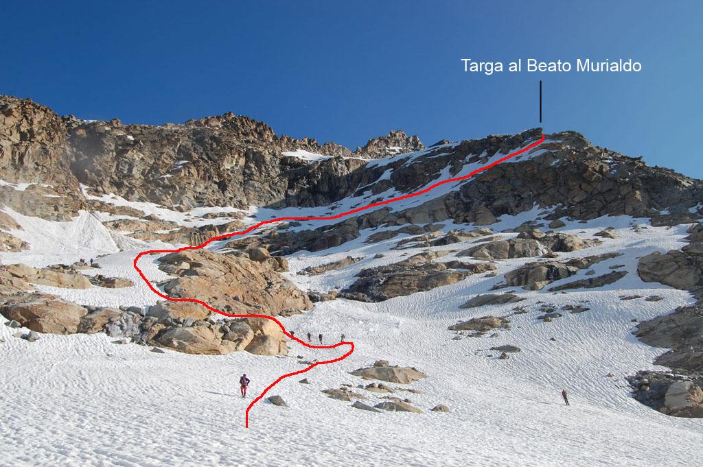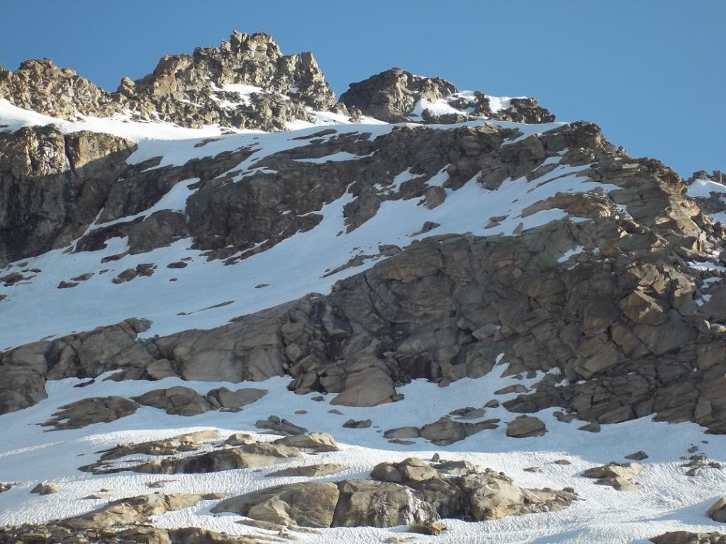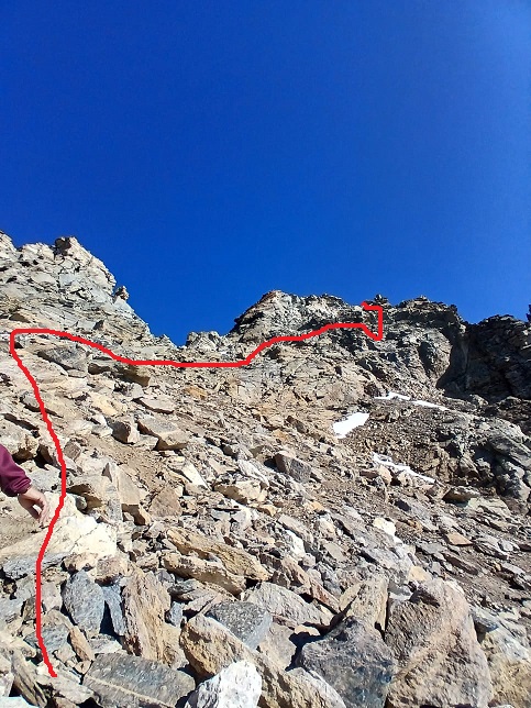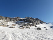 Giunti sulla cresta nevosa sovrastante seguirla e raggiungere il glacio-nevaio sotto la cresta, attraversarla diagonalmente verso dx portandosi su una costa che scende da un intaglio della cresta sommitale. Guadagnare questa forcella sotto la cima per ripidi sfasciumi, quindi traversare verso dx sotto cresta per comode cenge (ometti) fino a raggiungere un canale che permette di raggiungere comodamente la cresta. Da qui, a sx (ovest), per facili rocce giungere sulla cima (3-4 h).