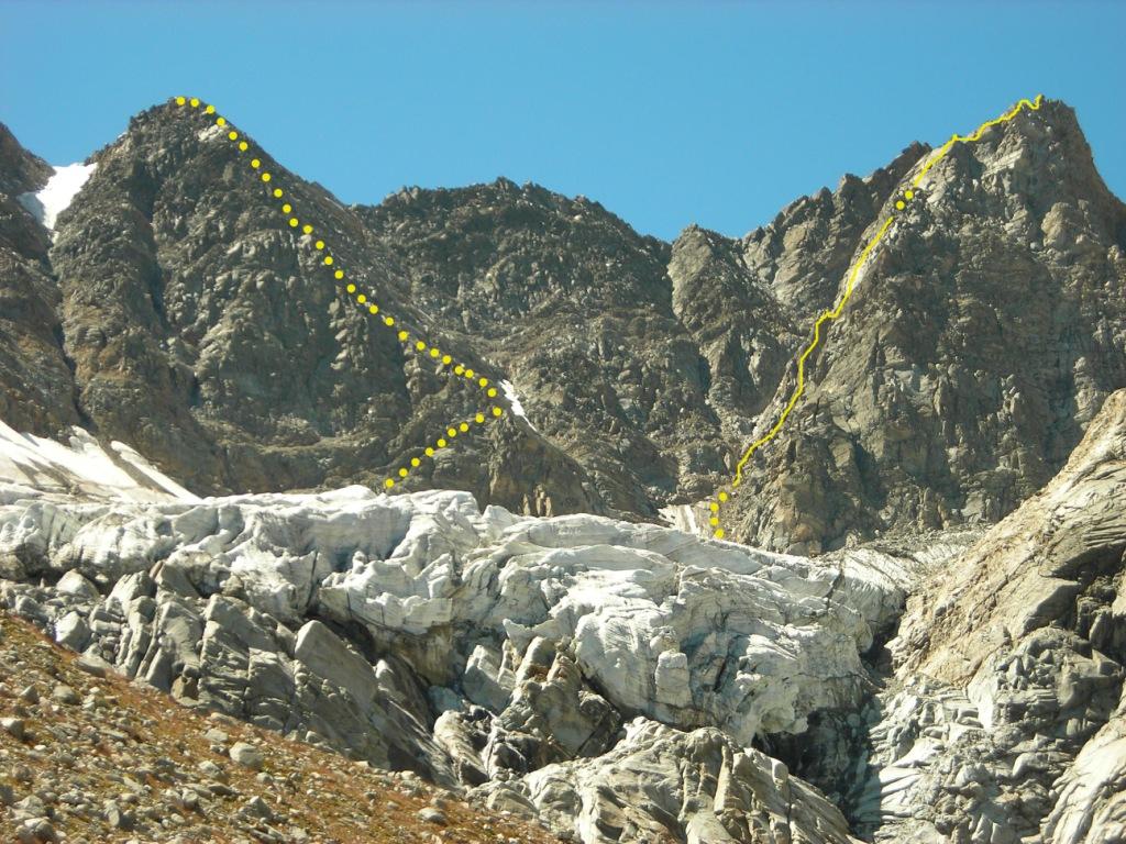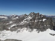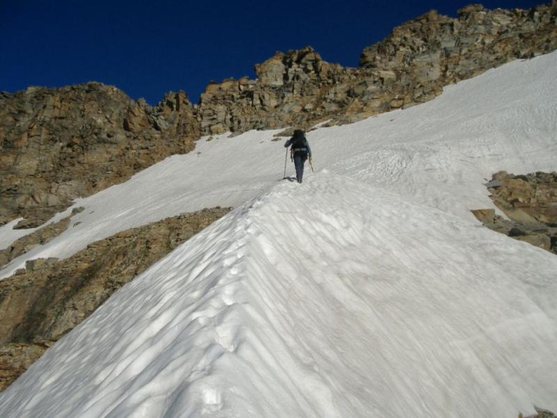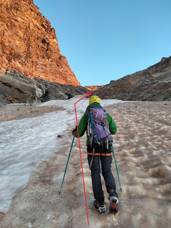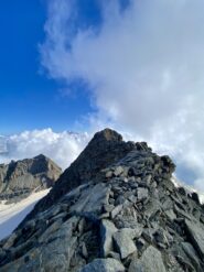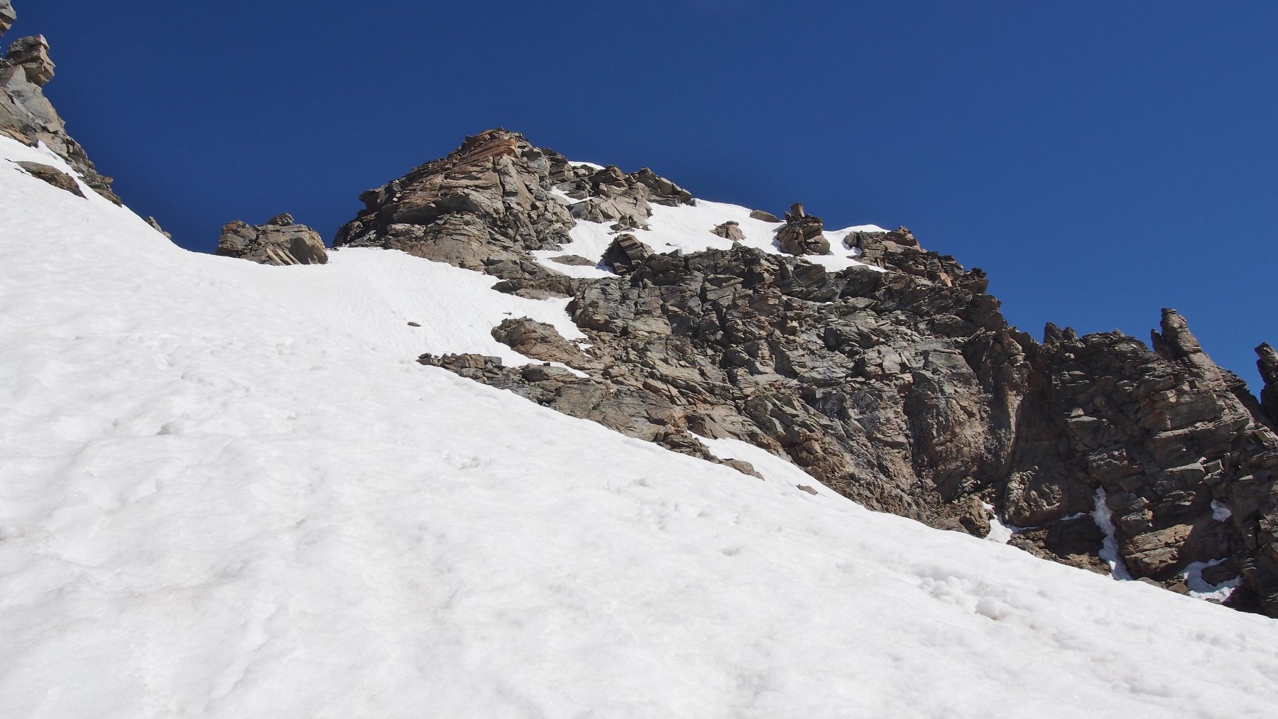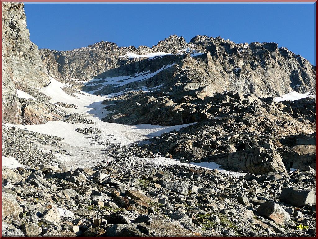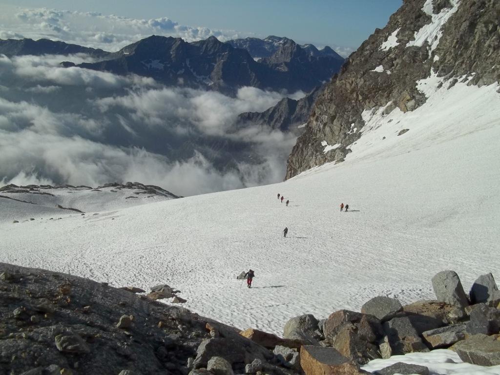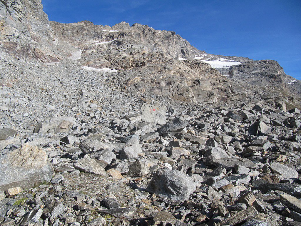 Giunti sulla cresta nevosa sovrastante seguirla e raggiungere il glacio-nevaio sotto la cresta, attraversarla diagonalmente verso dx portandosi su una costa che scende da un intaglio della cresta sommitale. Guadagnare questa forcella sotto la cima per ripidi sfasciumi, quindi traversare verso dx sotto cresta per comode cenge (ometti) fino a raggiungere un canale che permette di raggiungere comodamente la cresta. Da qui, a sx (ovest), per facili rocce giungere sulla cima (3-4 h).