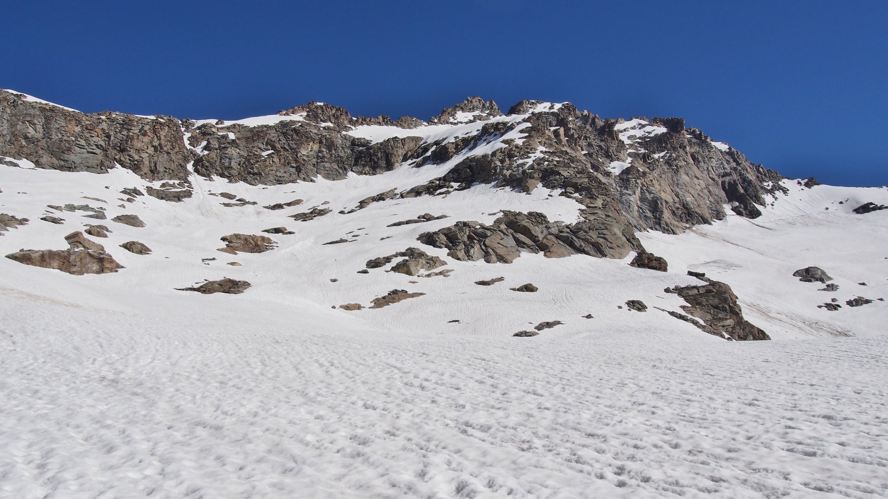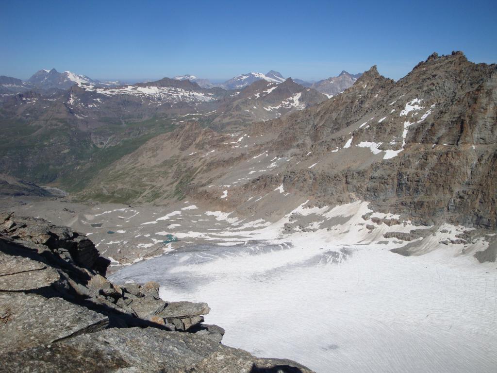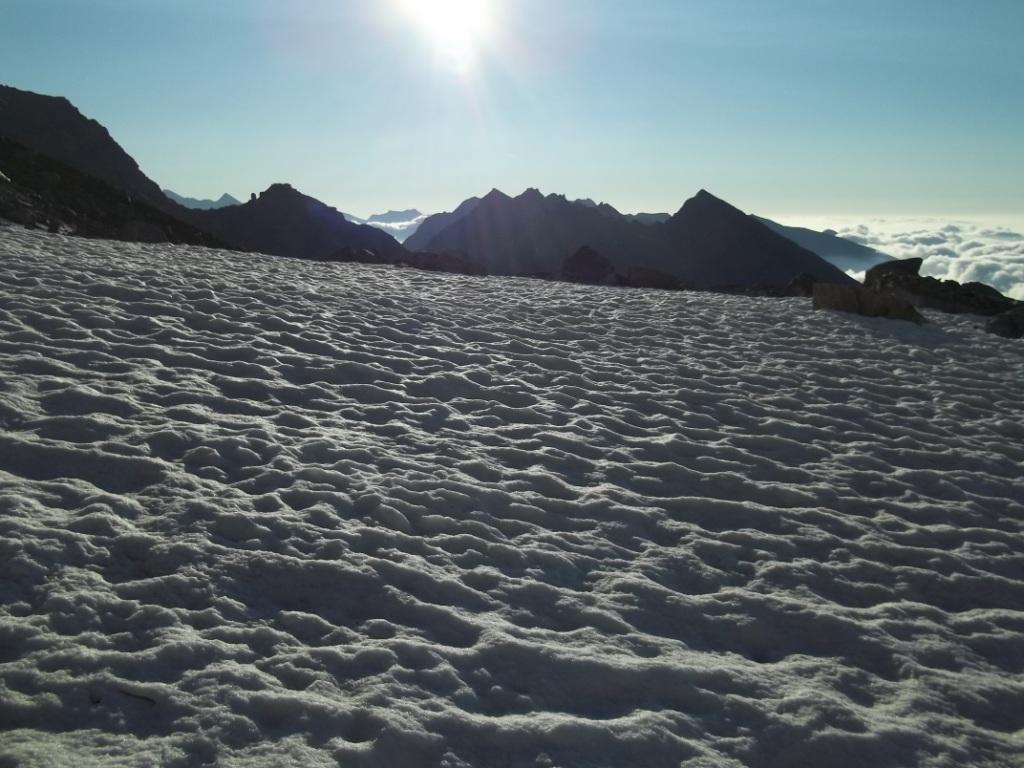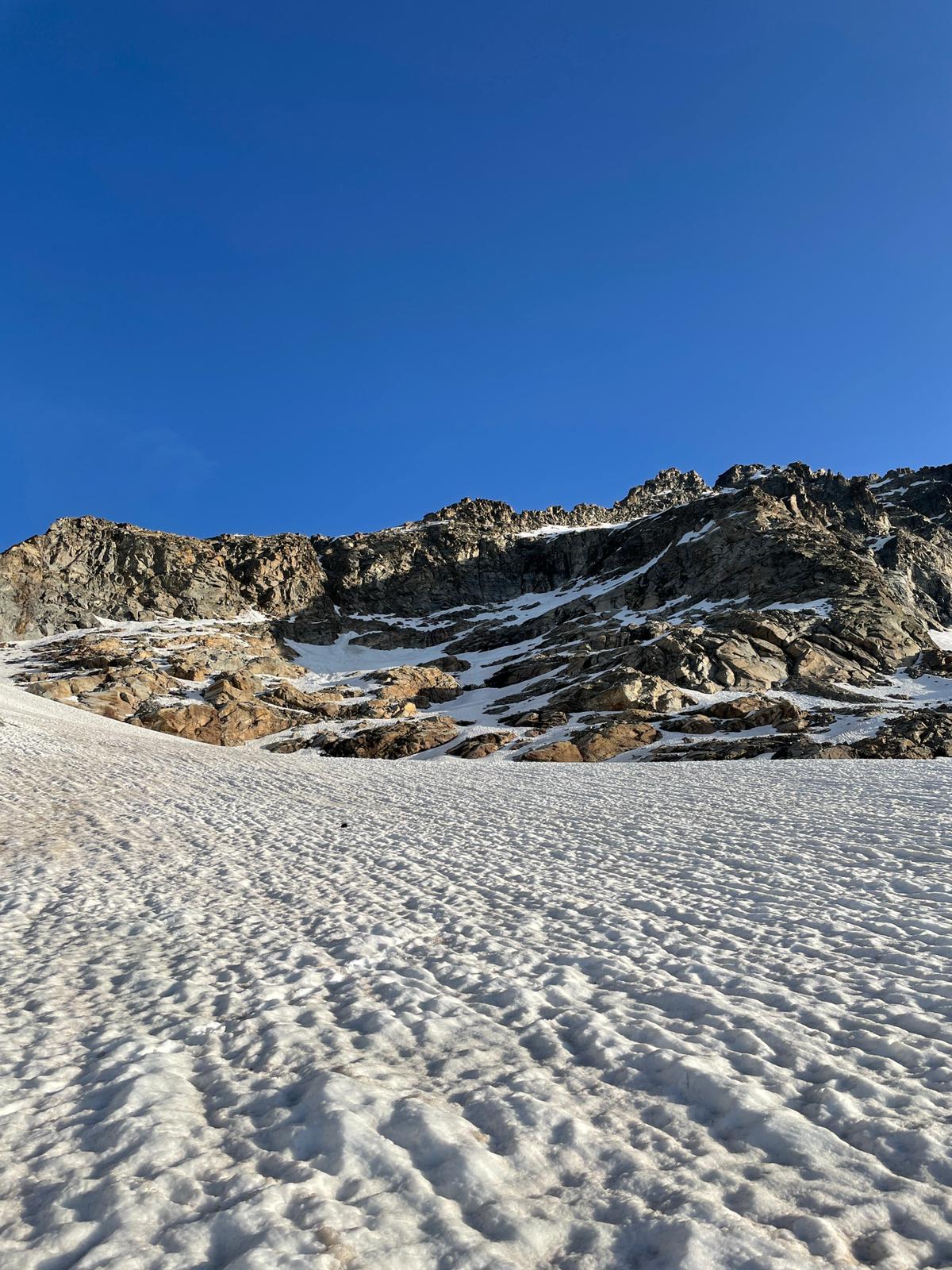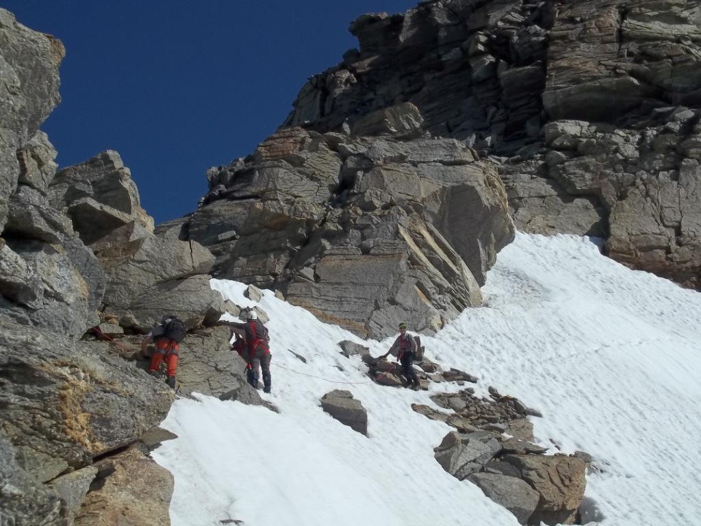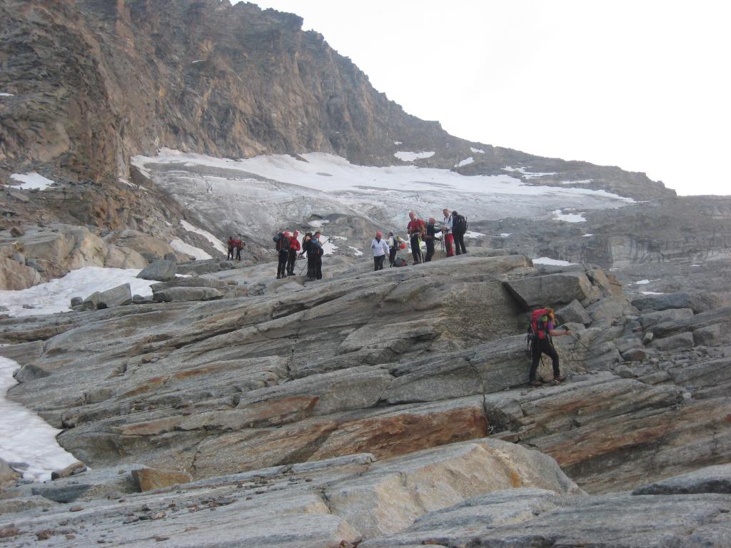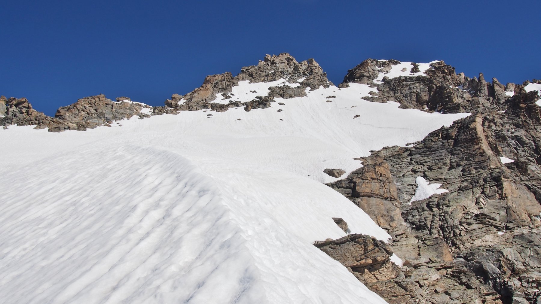 Giunti sulla cresta nevosa sovrastante seguirla e raggiungere il glacio-nevaio sotto la cresta, attraversarla diagonalmente verso dx portandosi su una costa che scende da un intaglio della cresta sommitale. Guadagnare questa forcella sotto la cima per ripidi sfasciumi, quindi traversare verso dx sotto cresta per comode cenge (ometti) fino a raggiungere un canale che permette di raggiungere comodamente la cresta. Da qui, a sx (ovest), per facili rocce giungere sulla cima (3-4 h).