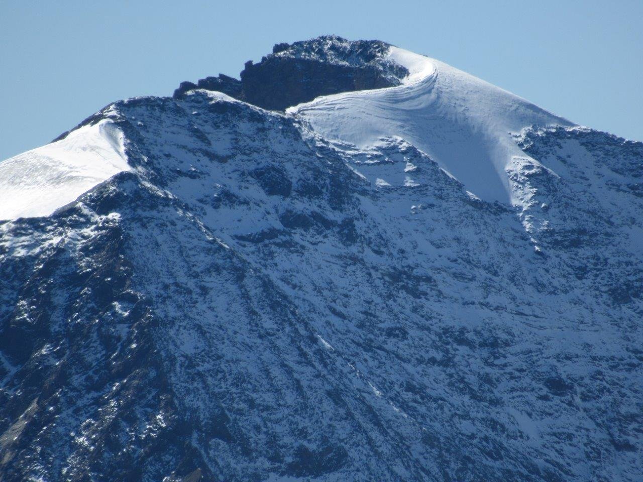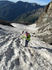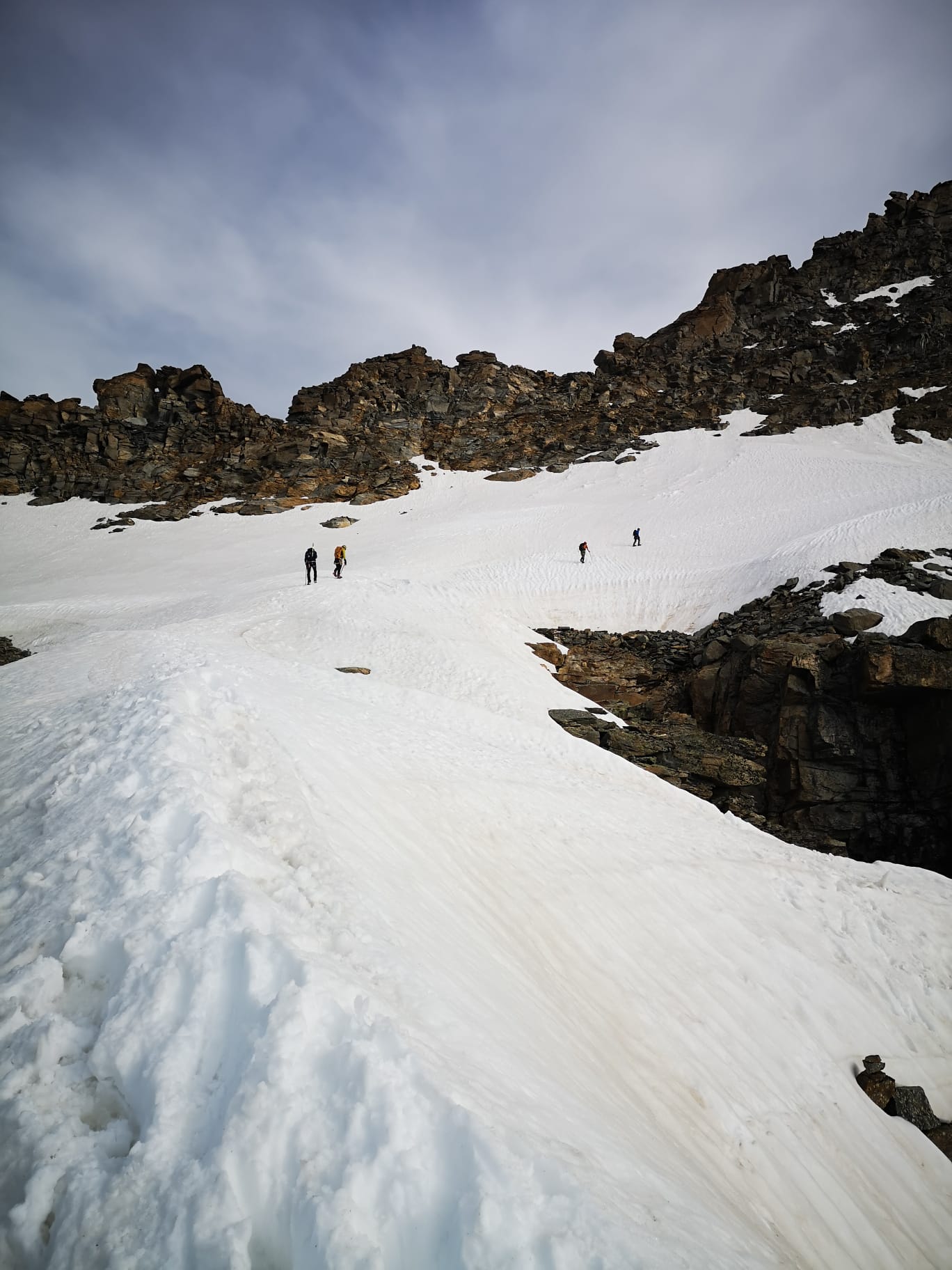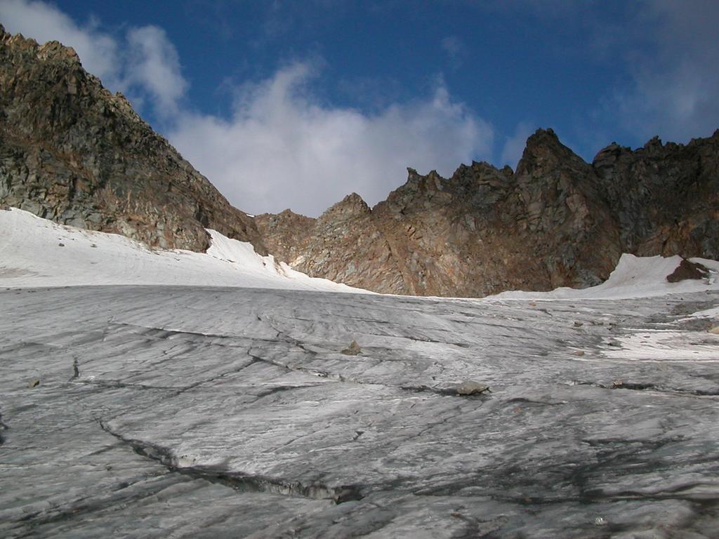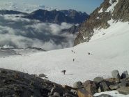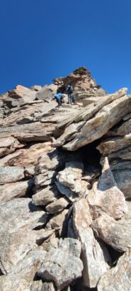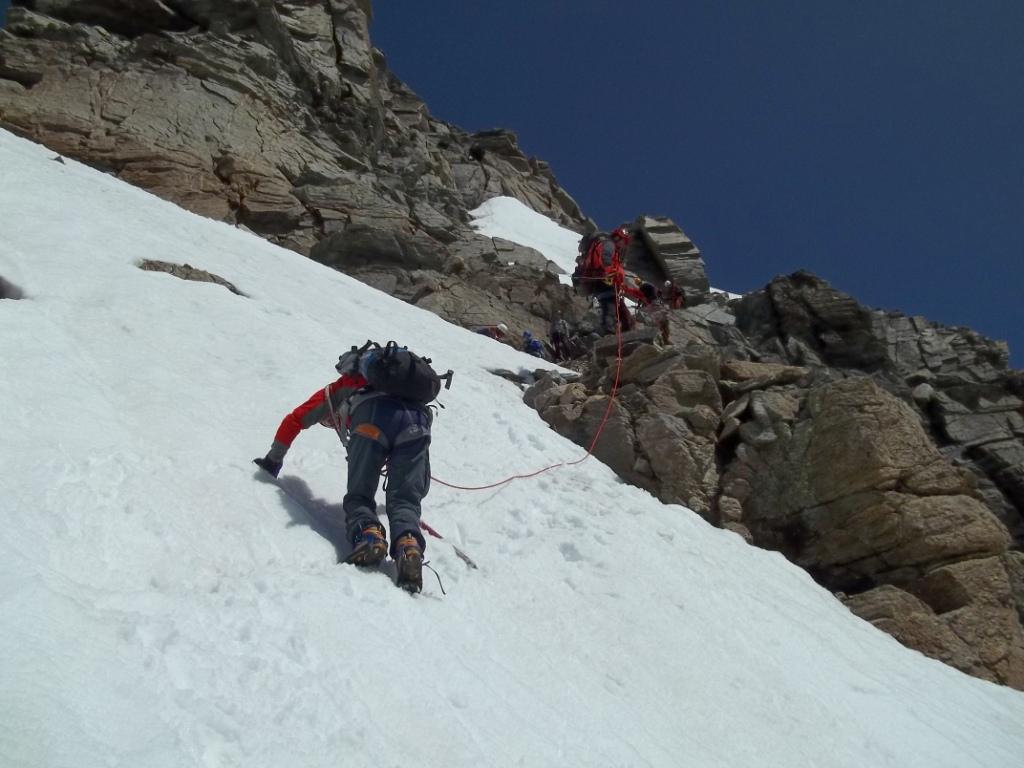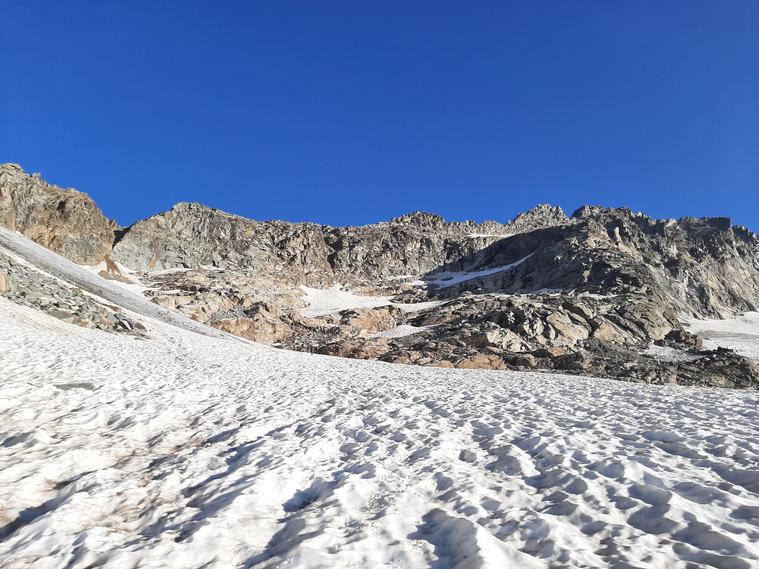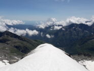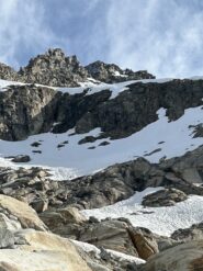 Giunti sulla cresta nevosa sovrastante seguirla e raggiungere il glacio-nevaio sotto la cresta, attraversarla diagonalmente verso dx portandosi su una costa che scende da un intaglio della cresta sommitale. Guadagnare questa forcella sotto la cima per ripidi sfasciumi, quindi traversare verso dx sotto cresta per comode cenge (ometti) fino a raggiungere un canale che permette di raggiungere comodamente la cresta. Da qui, a sx (ovest), per facili rocce giungere sulla cima (3-4 h).