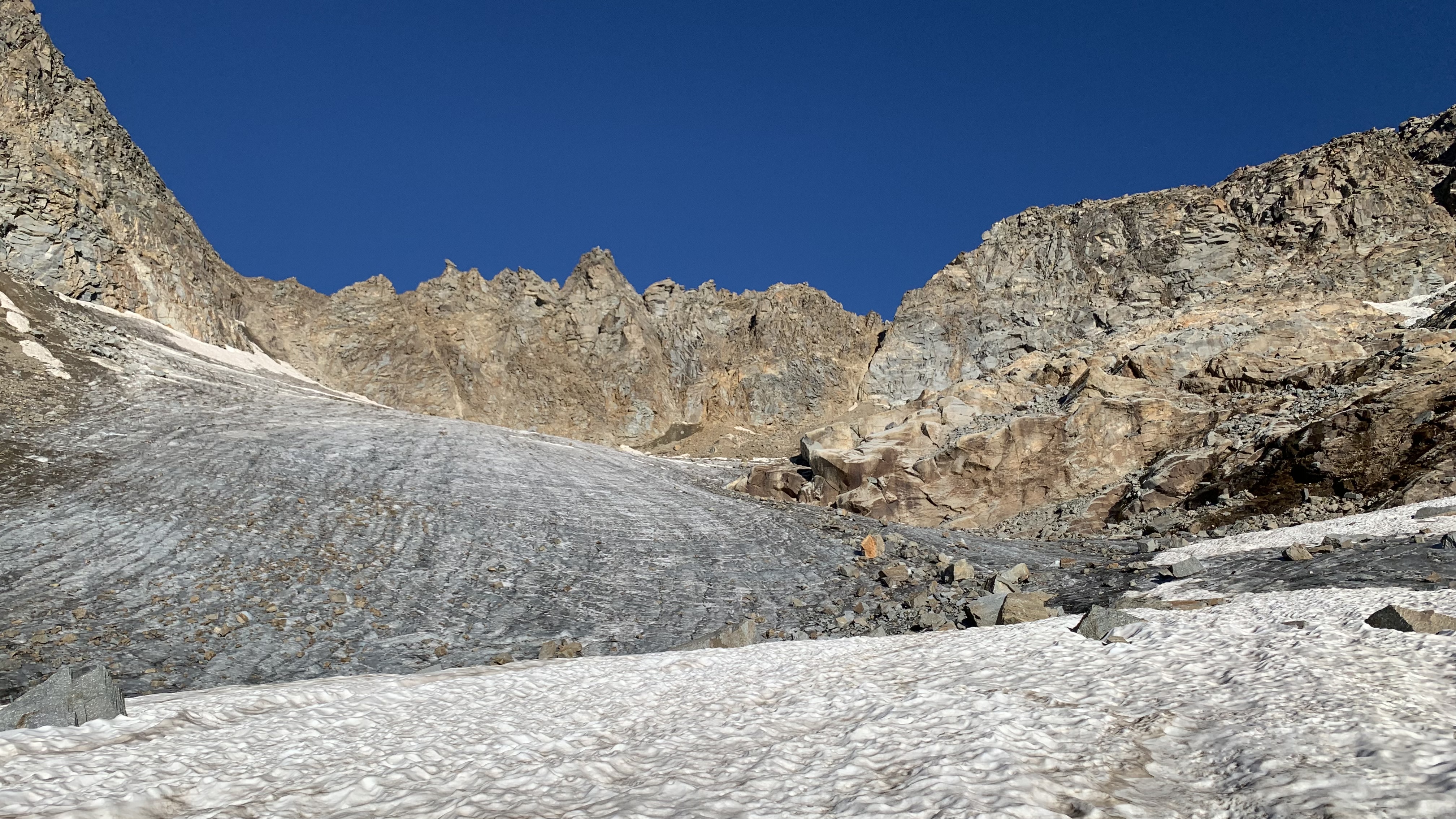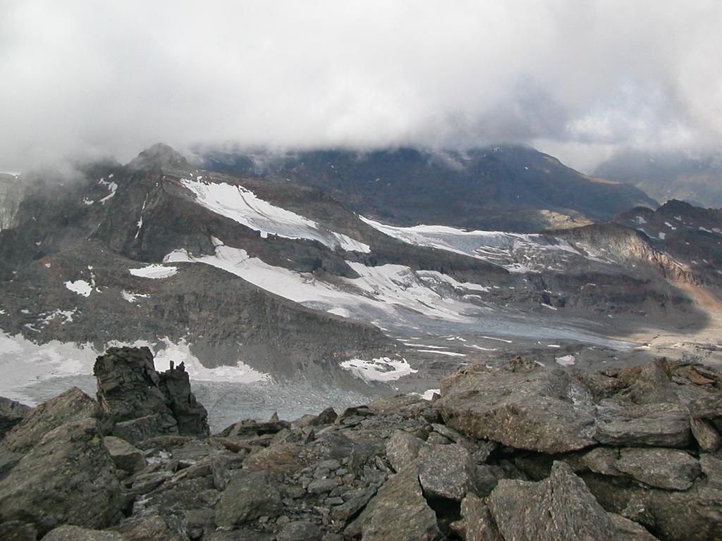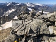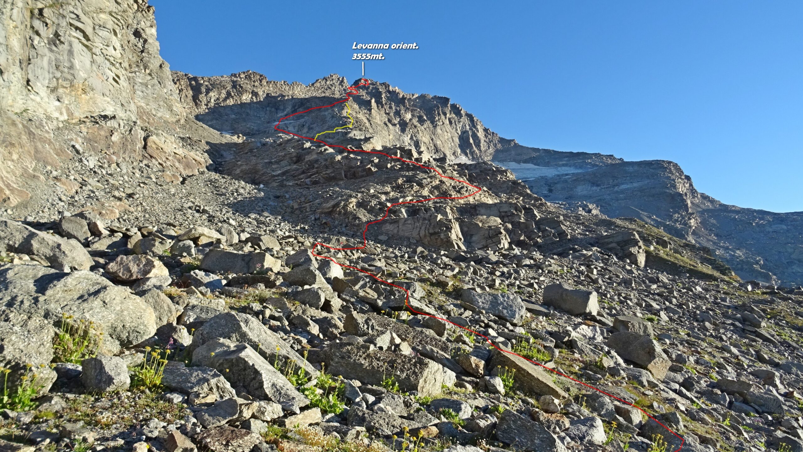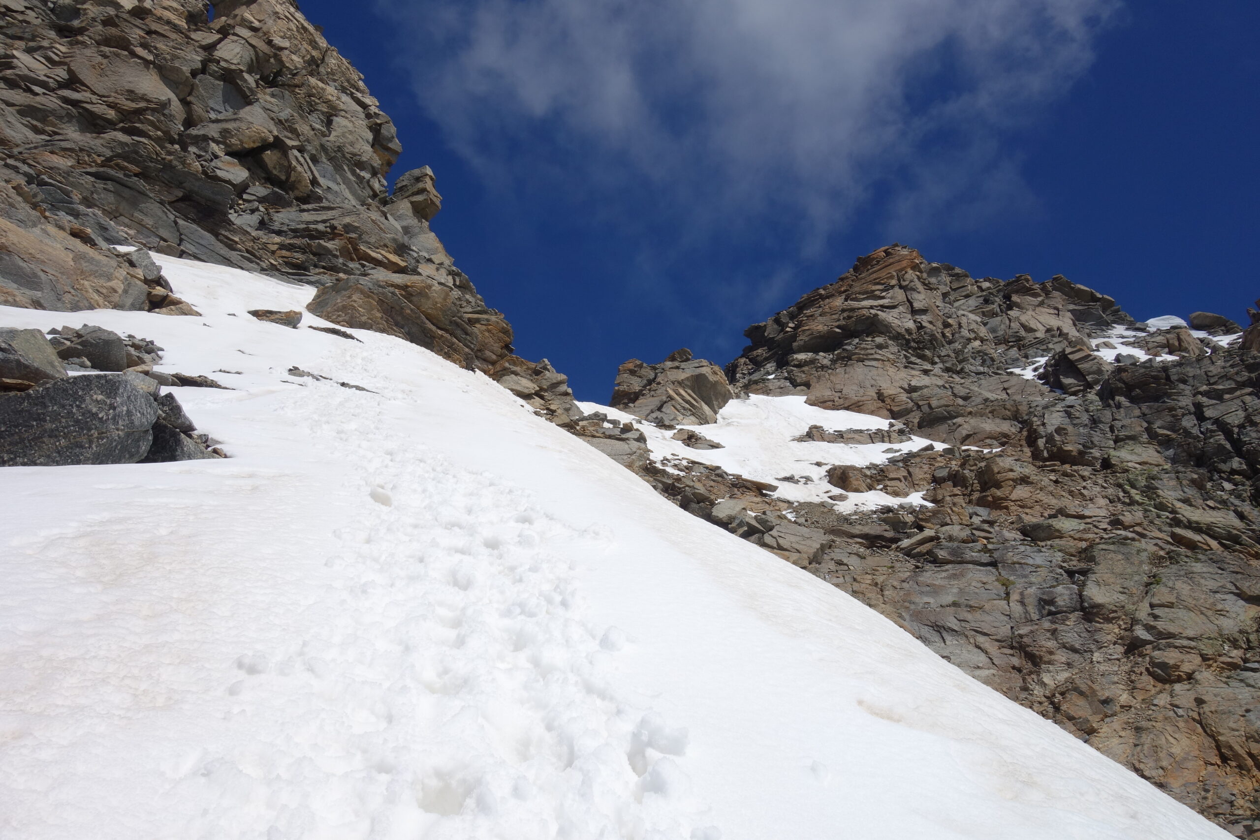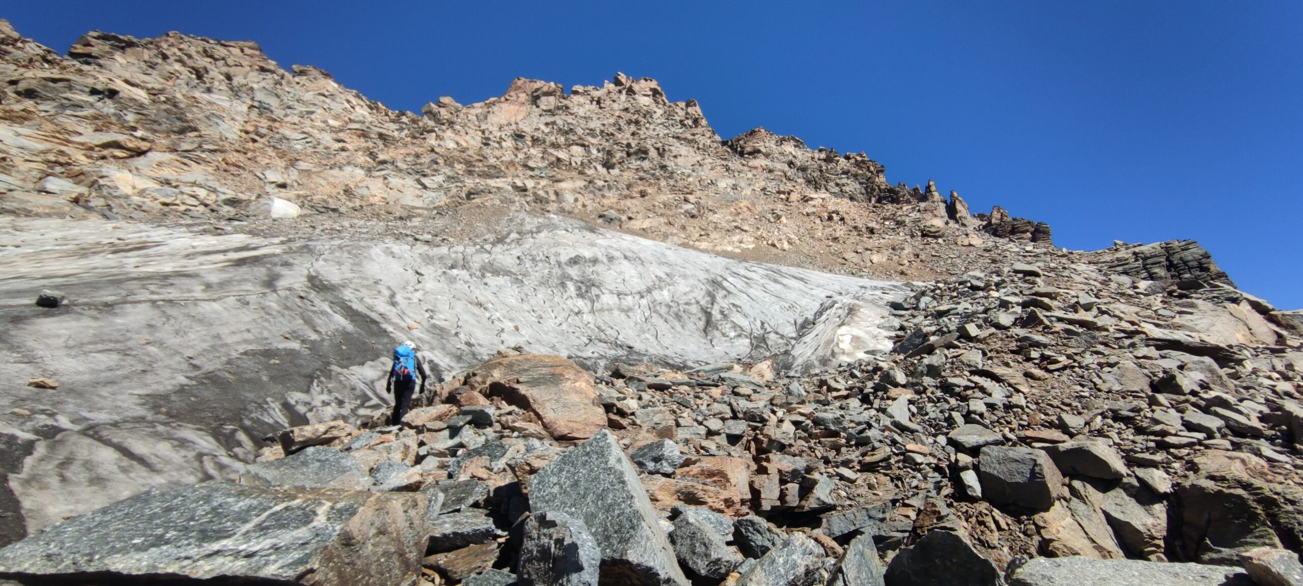 Giunti sulla cresta nevosa sovrastante seguirla e raggiungere il glacio-nevaio sotto la cresta, attraversarla diagonalmente verso dx portandosi su una costa che scende da un intaglio della cresta sommitale. Guadagnare questa forcella sotto la cima per ripidi sfasciumi, quindi traversare verso dx sotto cresta per comode cenge (ometti) fino a raggiungere un canale che permette di raggiungere comodamente la cresta. Da qui, a sx (ovest), per facili rocce giungere sulla cima (3-4 h).