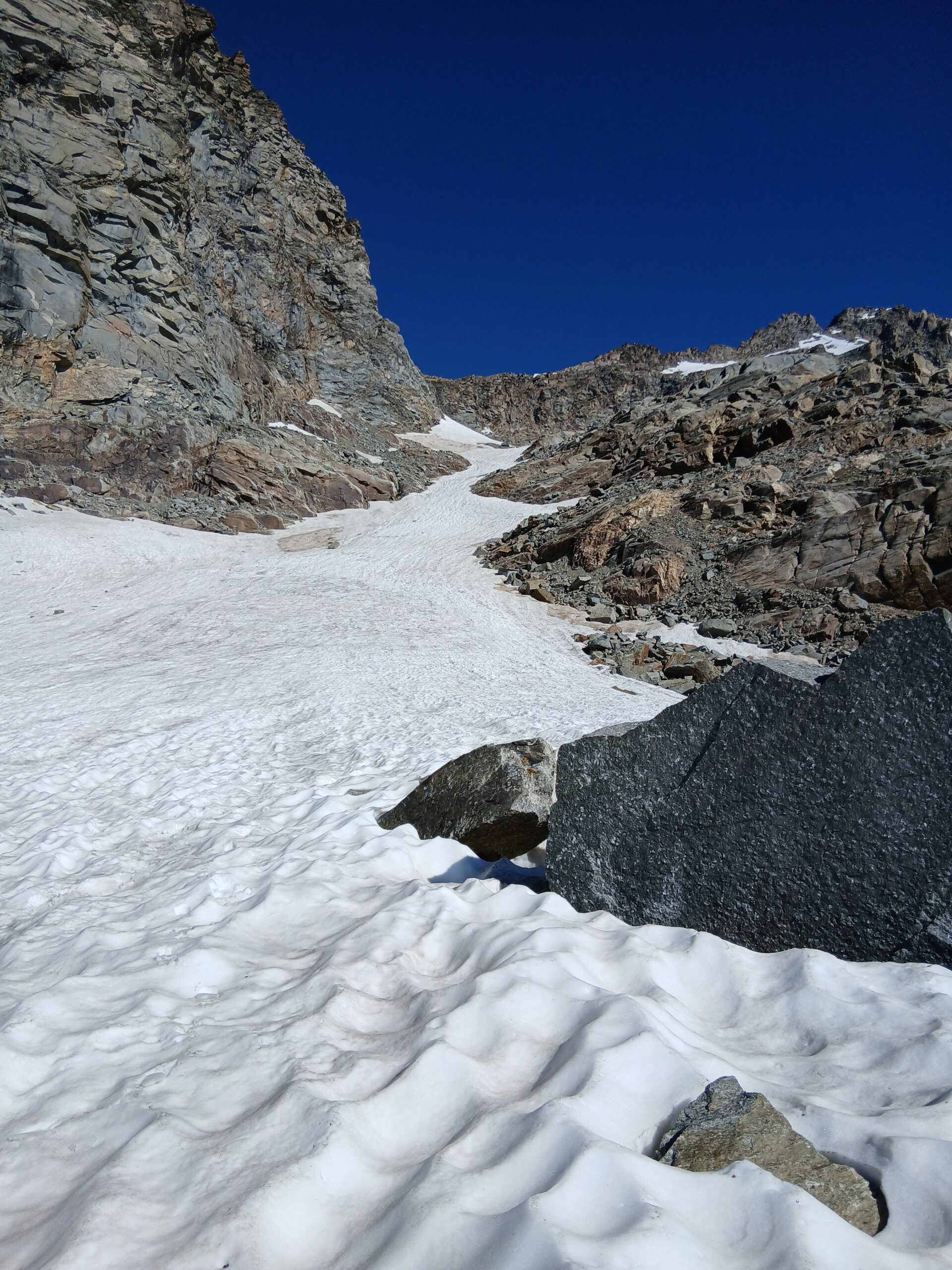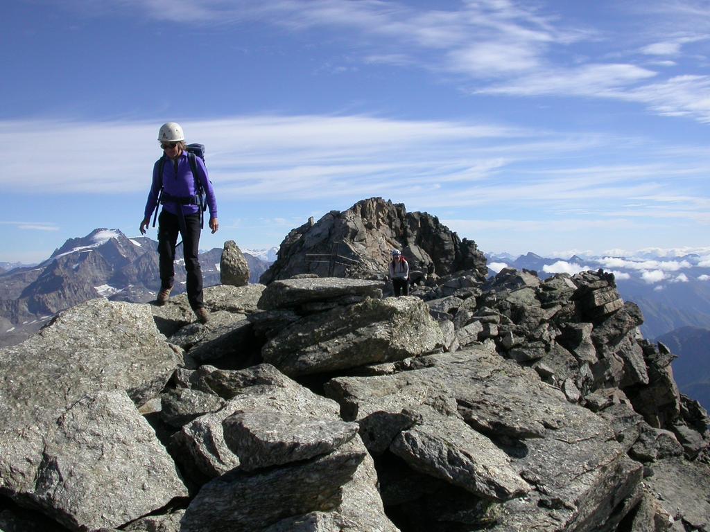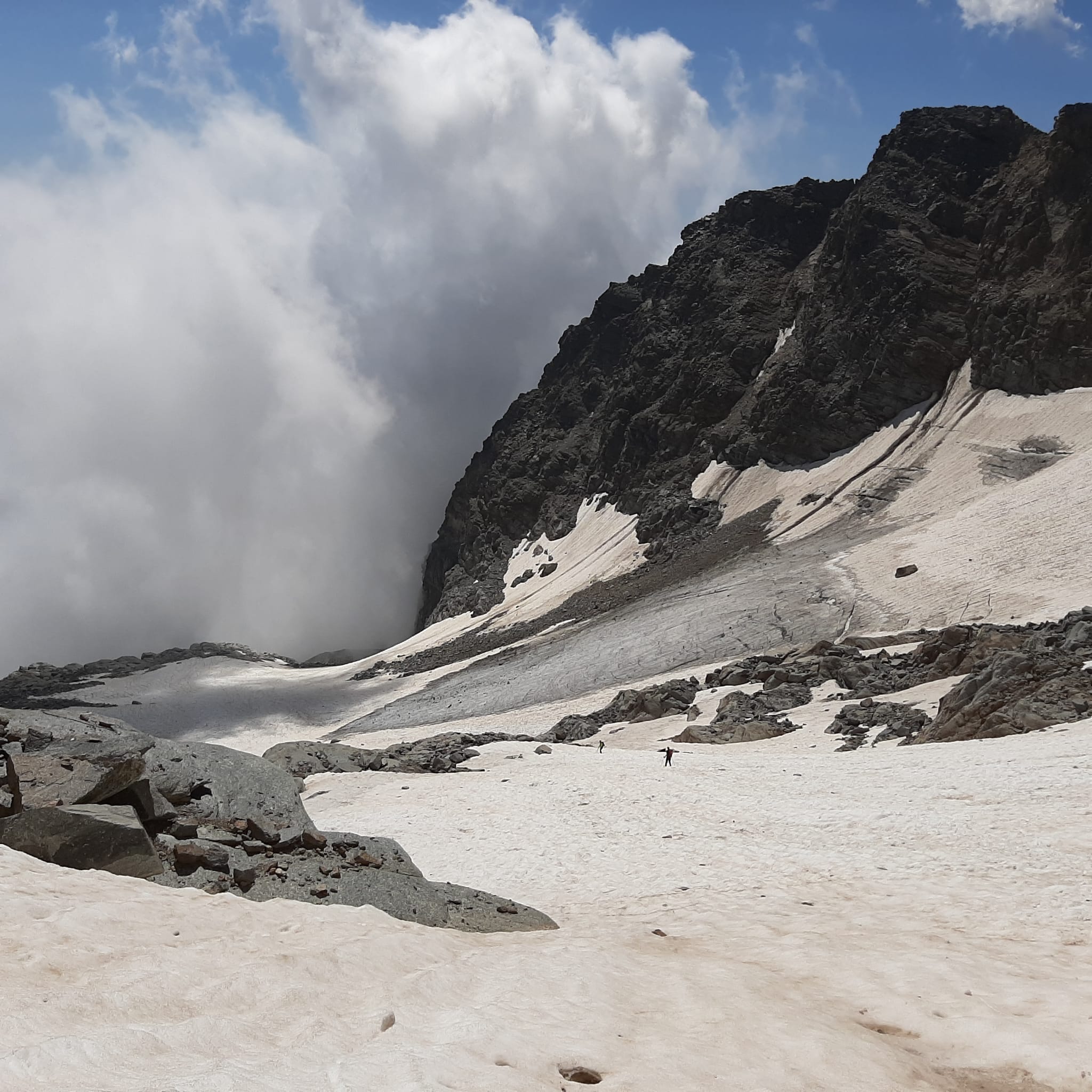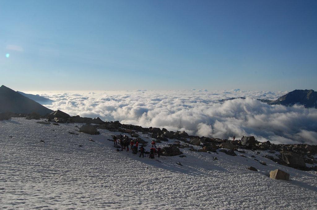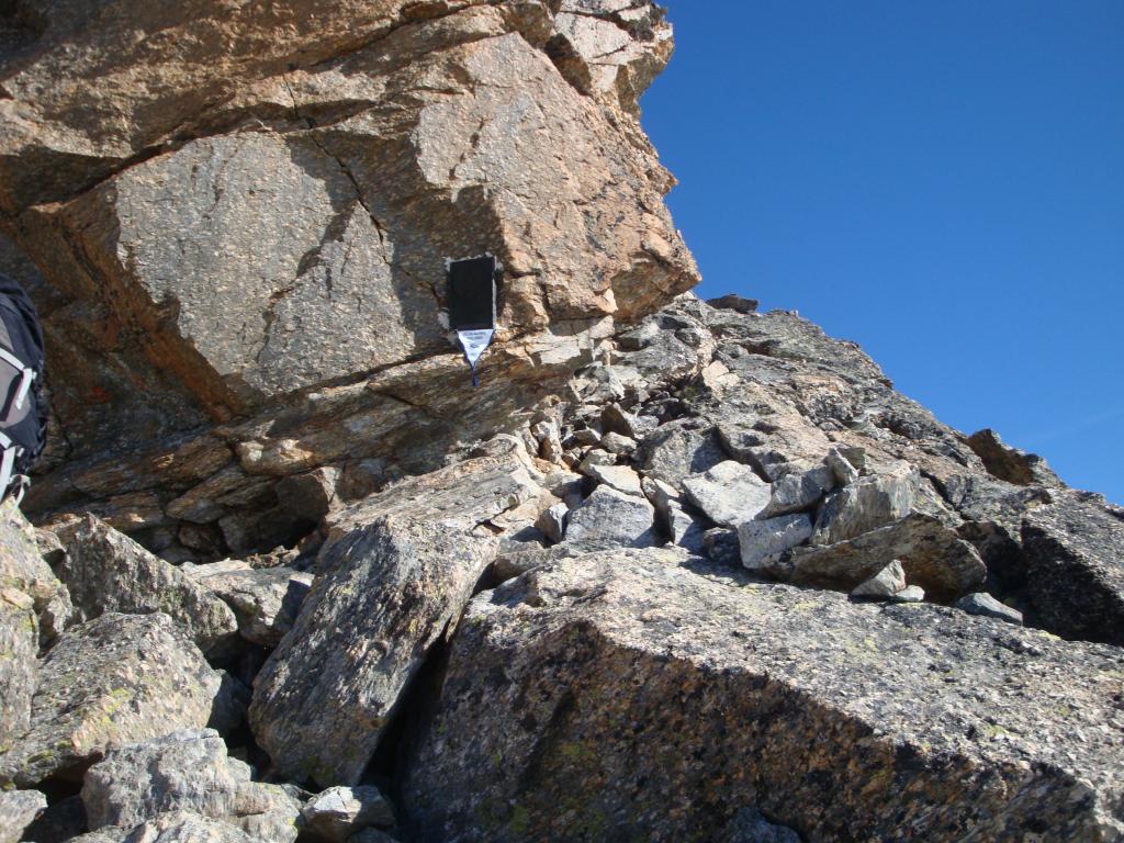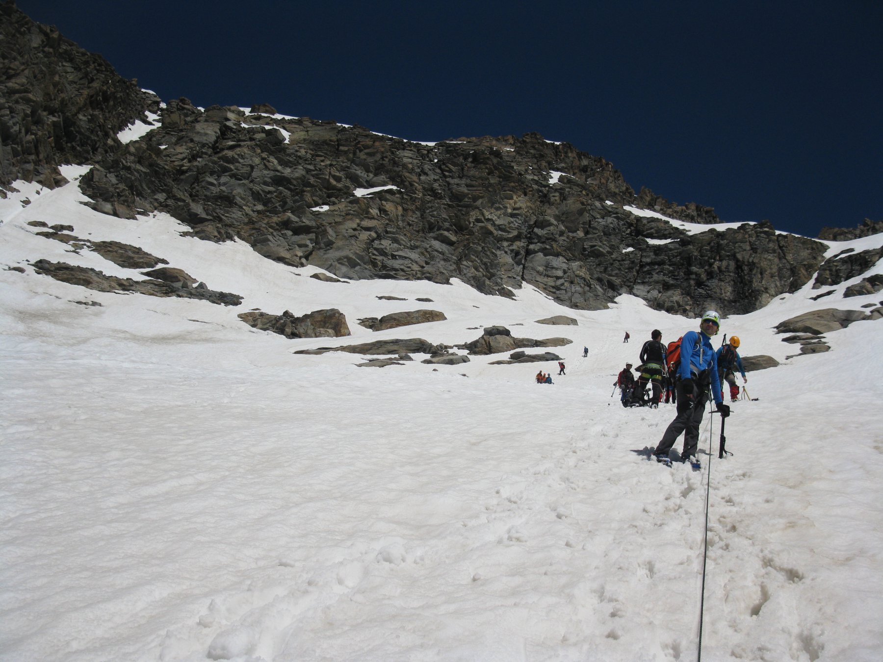 Giunti sulla cresta nevosa sovrastante seguirla e raggiungere il glacio-nevaio sotto la cresta, attraversarla diagonalmente verso dx portandosi su una costa che scende da un intaglio della cresta sommitale. Guadagnare questa forcella sotto la cima per ripidi sfasciumi, quindi traversare verso dx sotto cresta per comode cenge (ometti) fino a raggiungere un canale che permette di raggiungere comodamente la cresta. Da qui, a sx (ovest), per facili rocce giungere sulla cima (3-4 h).