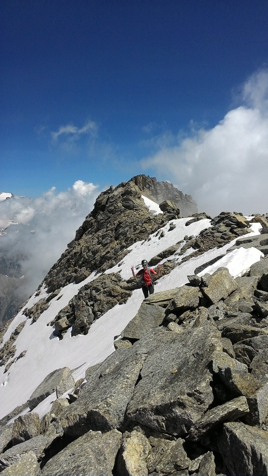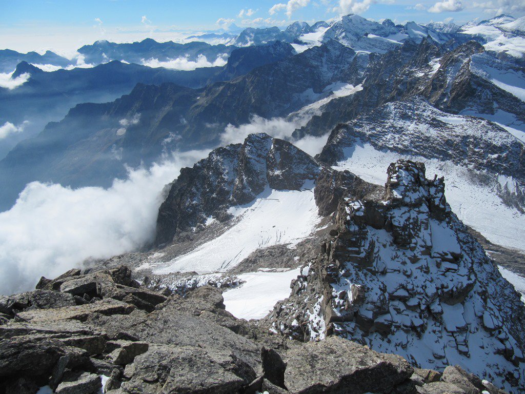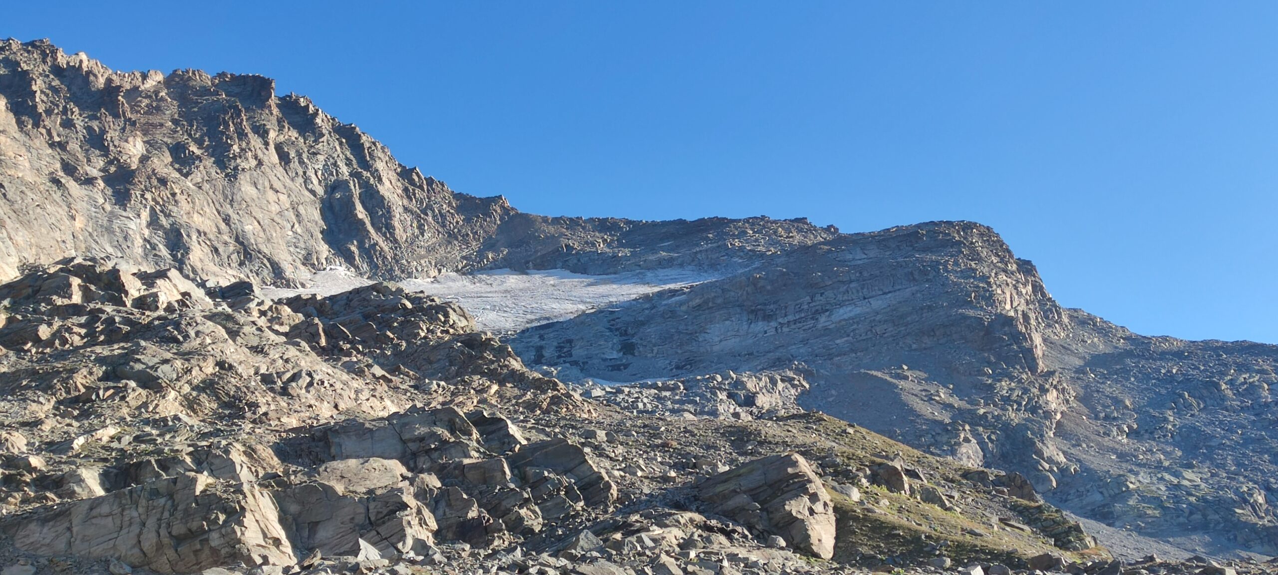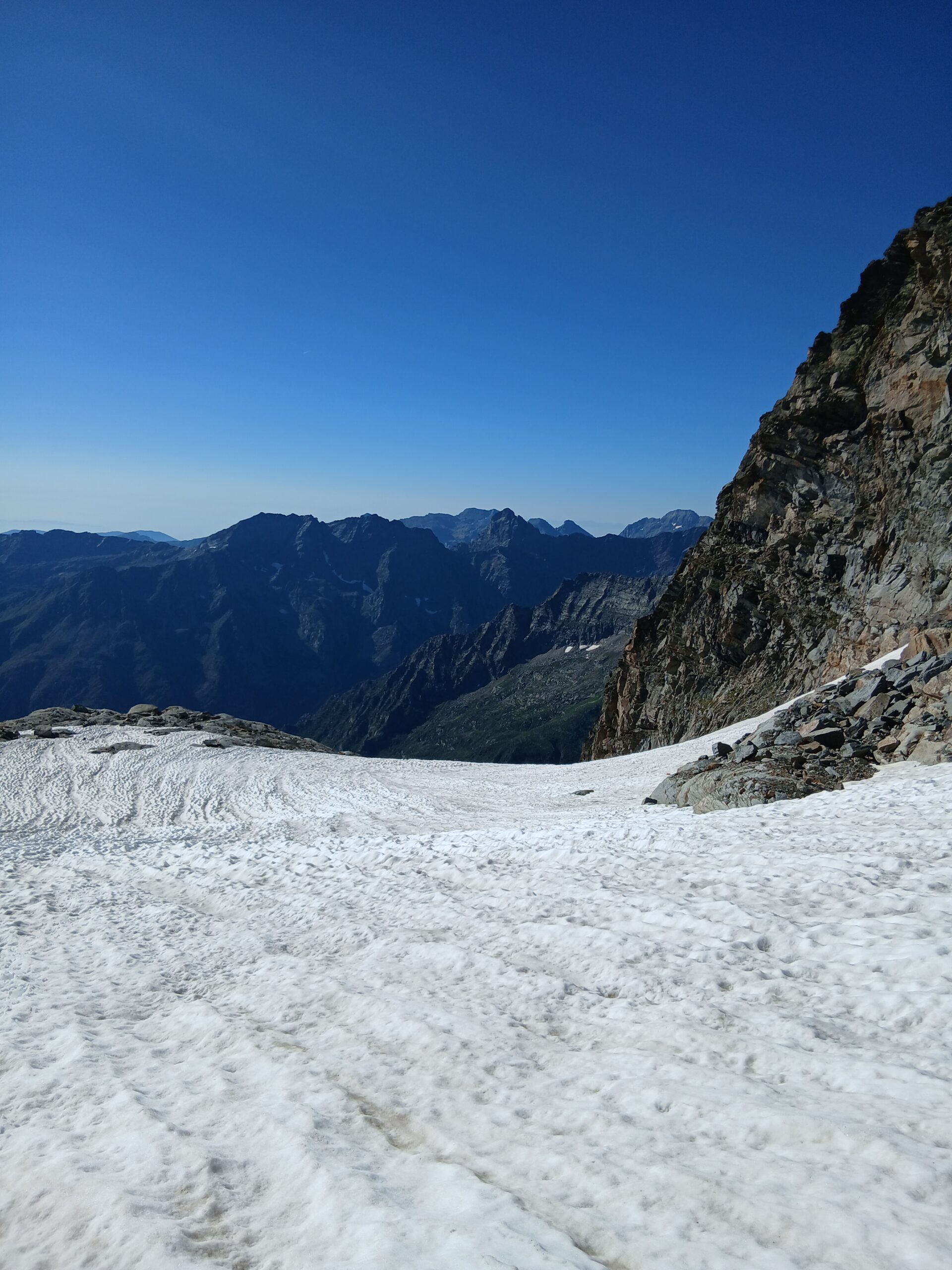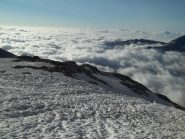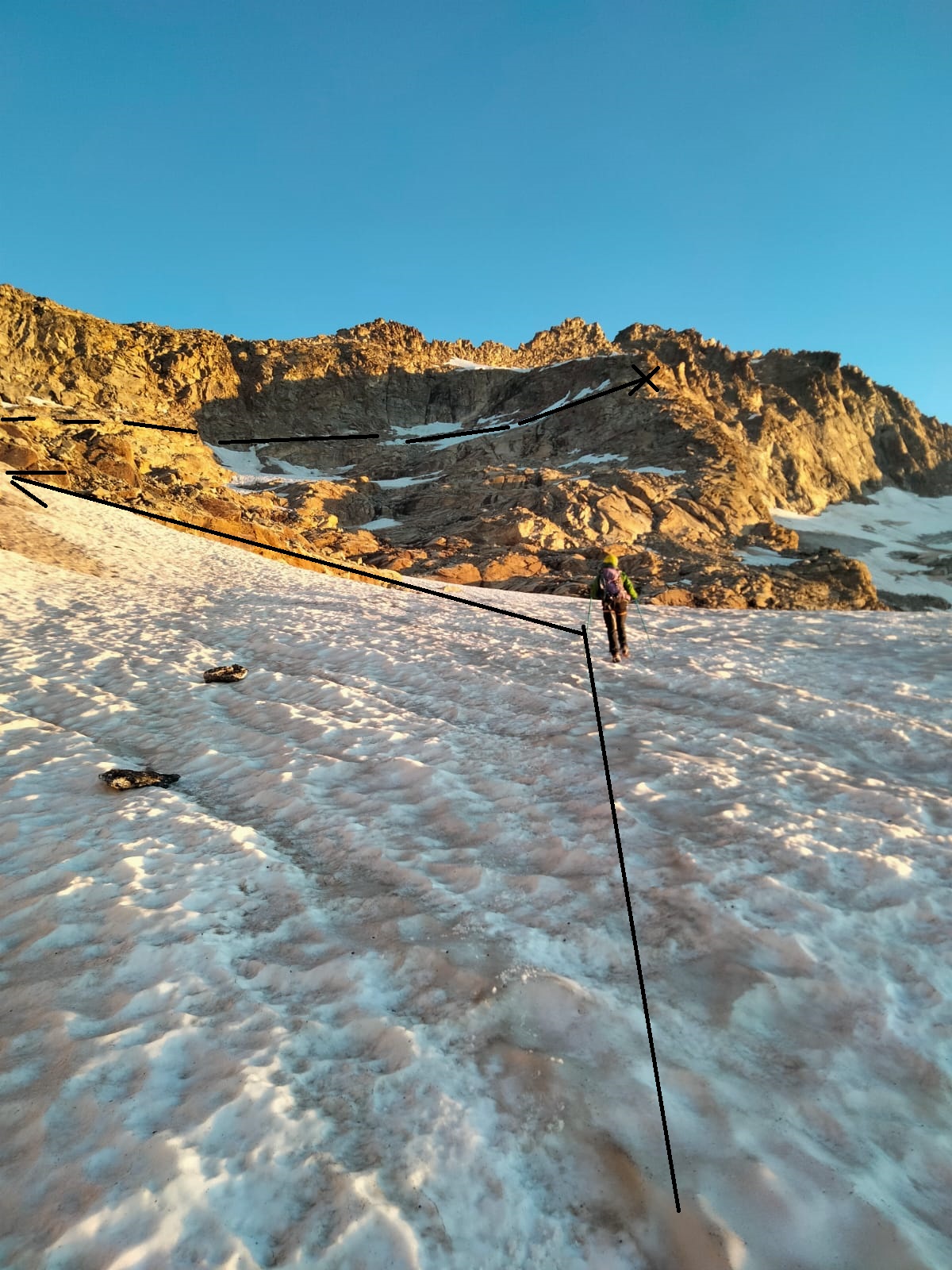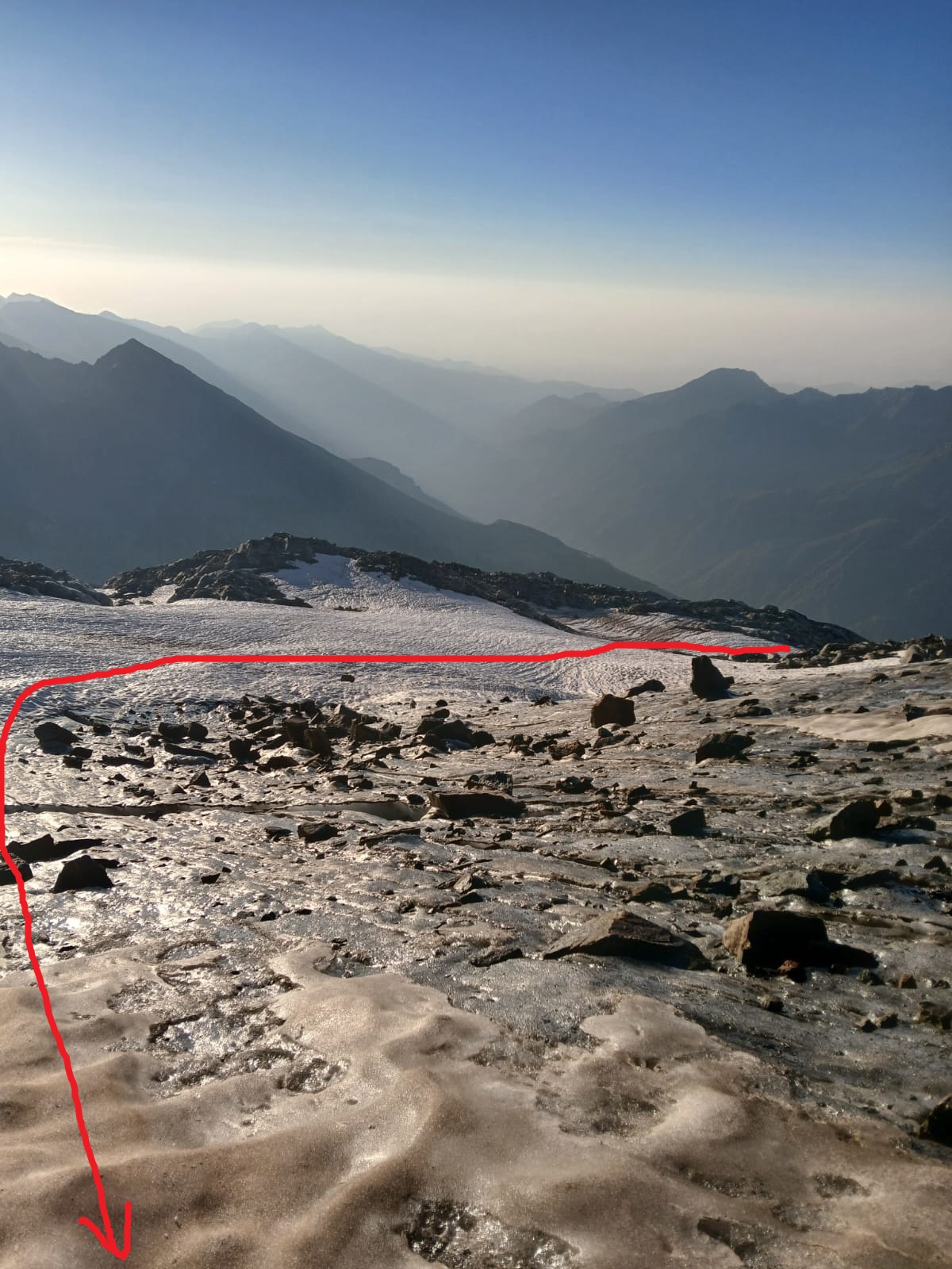 Giunti sulla cresta nevosa sovrastante seguirla e raggiungere il glacio-nevaio sotto la cresta, attraversarla diagonalmente verso dx portandosi su una costa che scende da un intaglio della cresta sommitale. Guadagnare questa forcella sotto la cima per ripidi sfasciumi, quindi traversare verso dx sotto cresta per comode cenge (ometti) fino a raggiungere un canale che permette di raggiungere comodamente la cresta. Da qui, a sx (ovest), per facili rocce giungere sulla cima (3-4 h).
