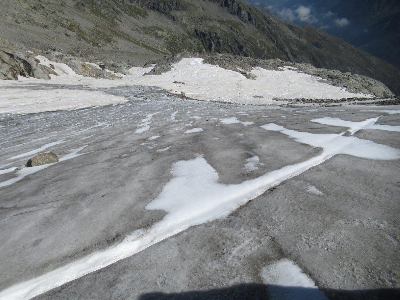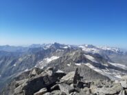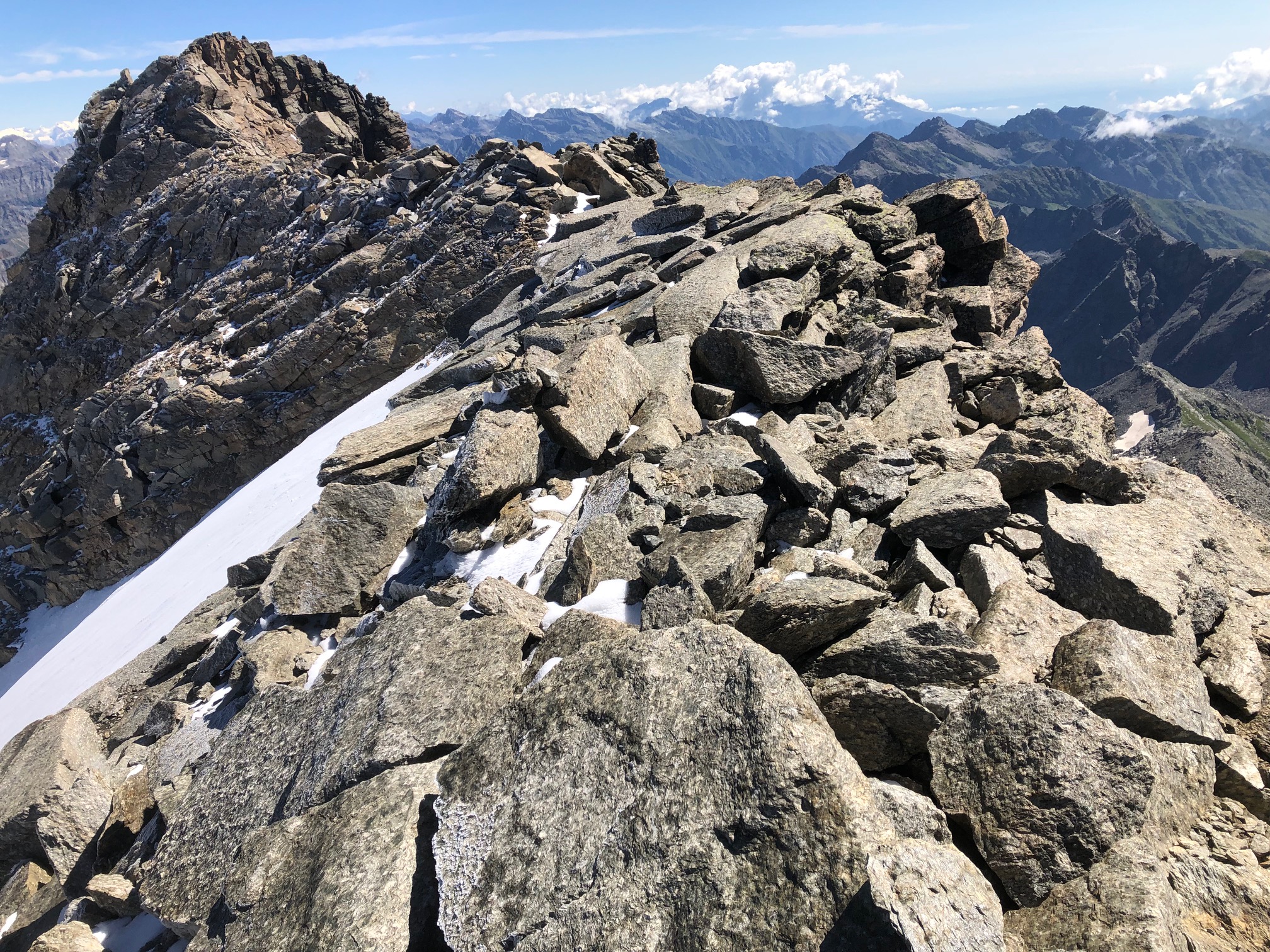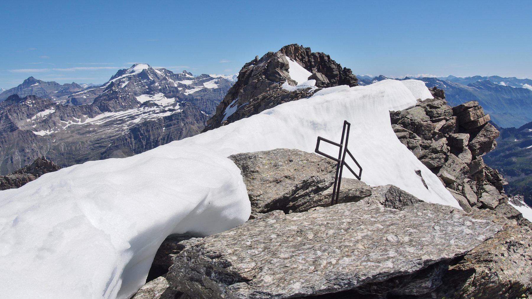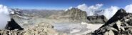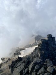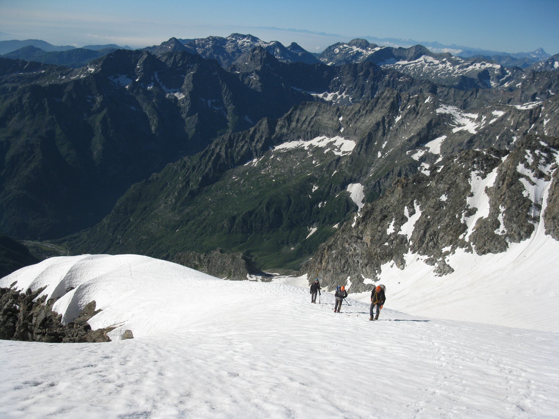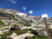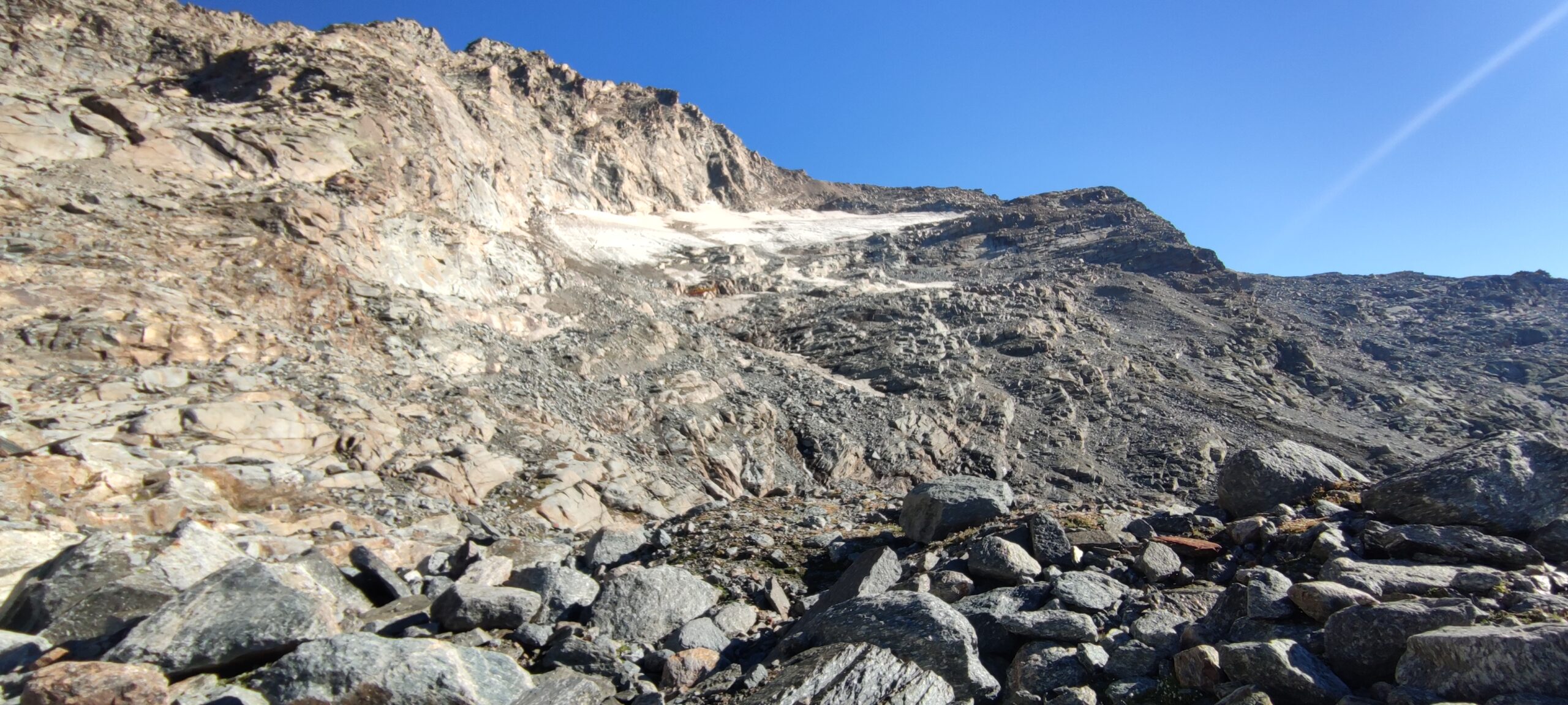 Giunti sulla cresta nevosa sovrastante seguirla e raggiungere il glacio-nevaio sotto la cresta, attraversarla diagonalmente verso dx portandosi su una costa che scende da un intaglio della cresta sommitale. Guadagnare questa forcella sotto la cima per ripidi sfasciumi, quindi traversare verso dx sotto cresta per comode cenge (ometti) fino a raggiungere un canale che permette di raggiungere comodamente la cresta. Da qui, a sx (ovest), per facili rocce giungere sulla cima (3-4 h).